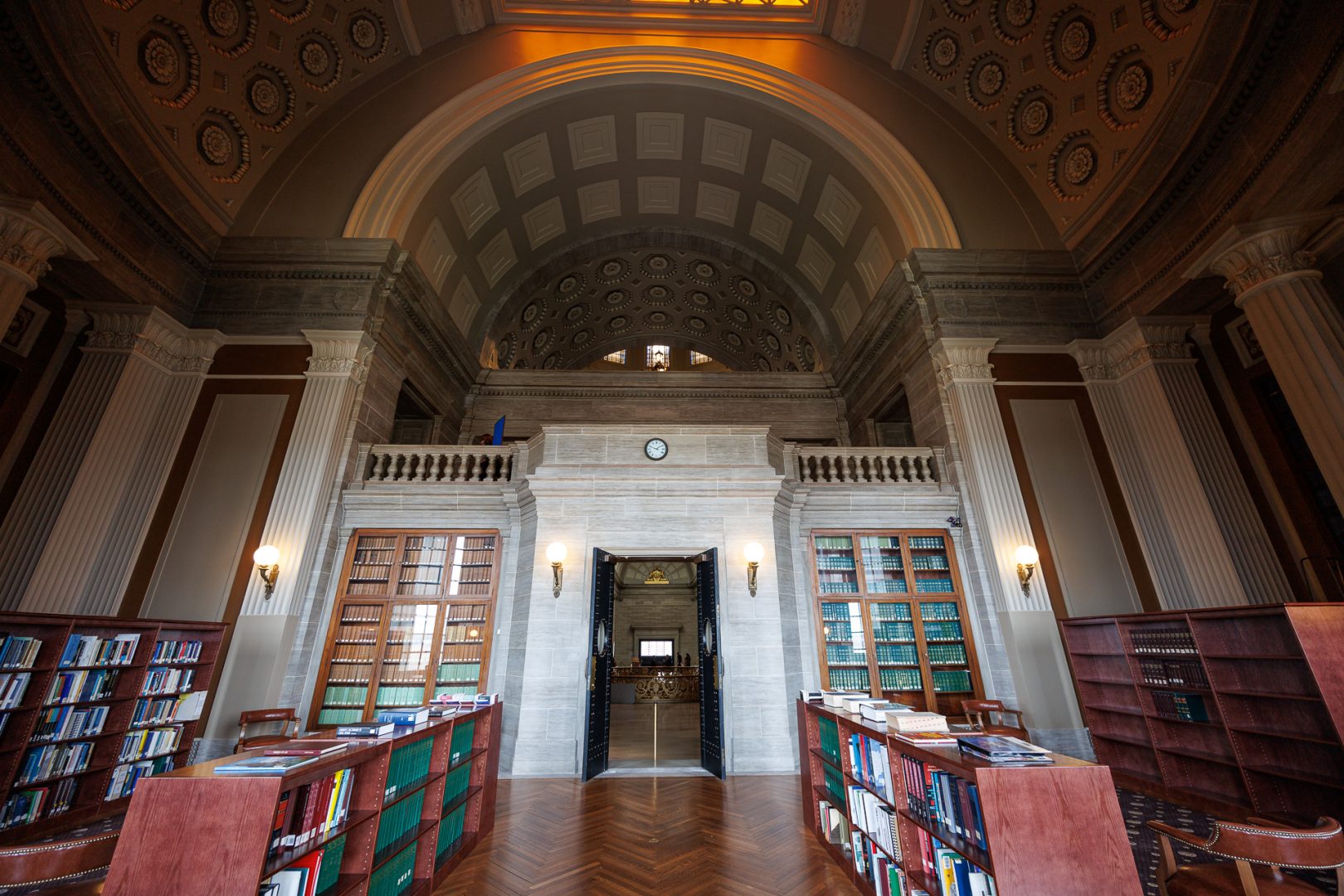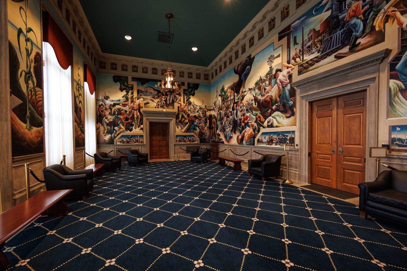 Il nous emmène également visiter la House Lounge, qui sert de salle de réunions. Une magnifique fresque murale intitulée « Histoire sociale du Missouri »  recouvre les 4 murs de la pièce. Elle a été réalisée en 1935 par Thomas Benton (1889-1975).