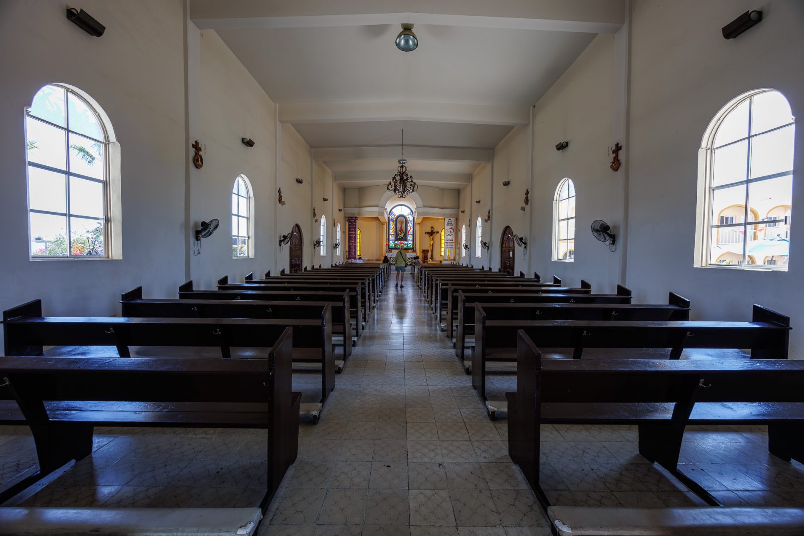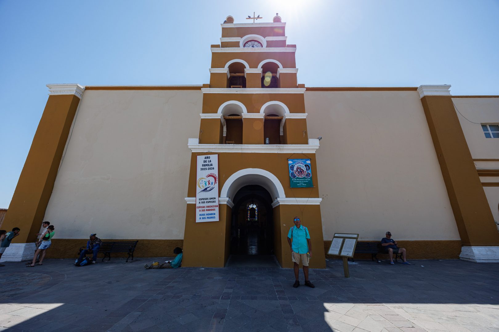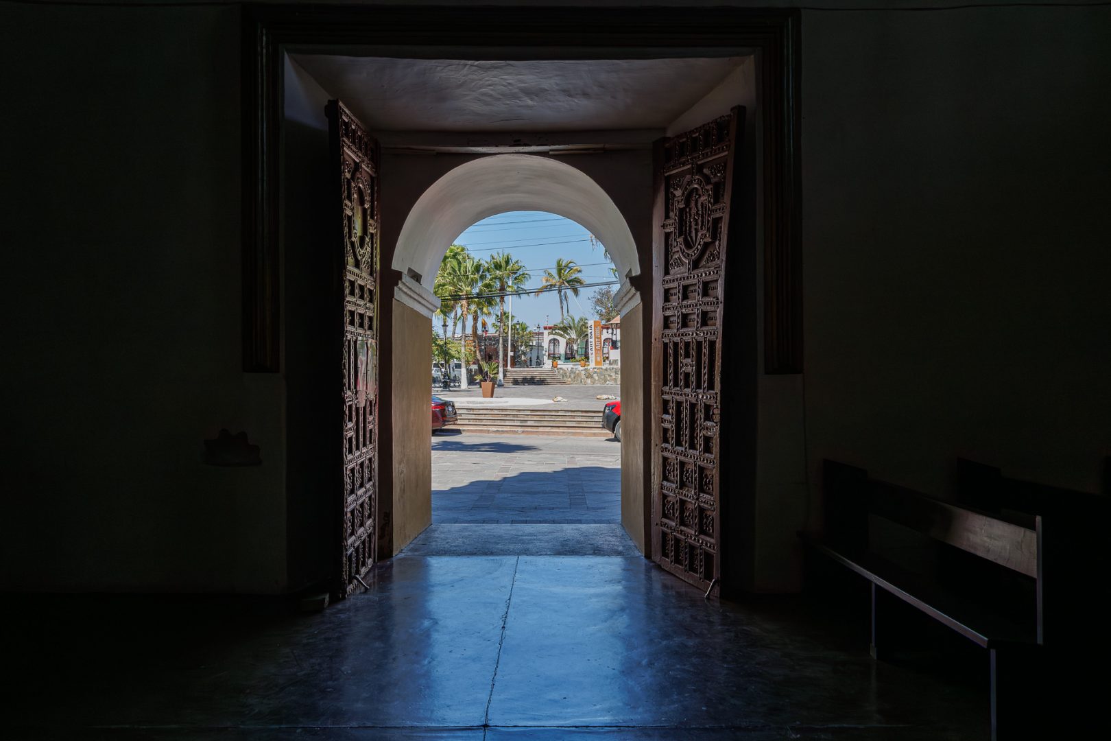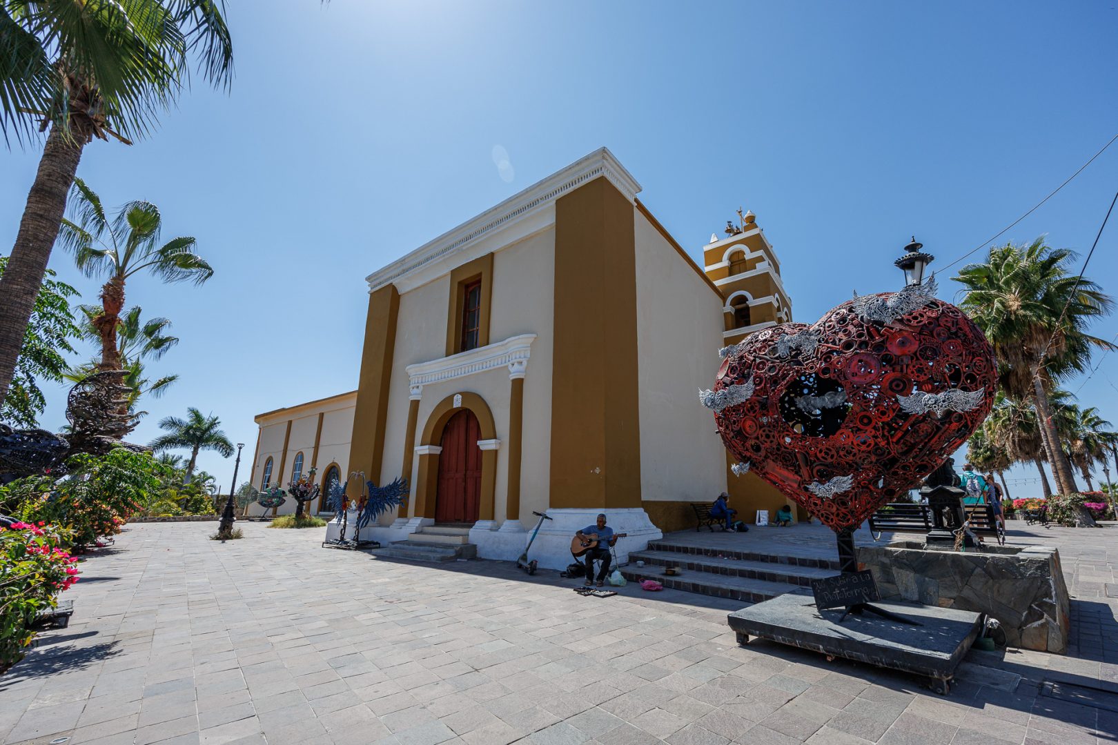 Nous voilà sur le parvis de l’église de la Mission Nuestra Señora del Pilar. En 1733, le père Sigismundo Taraval, moine jésuite italien, arriva comme missionnaire et fonda la mission sous le nom de Santa Rosa de Todos Santos.