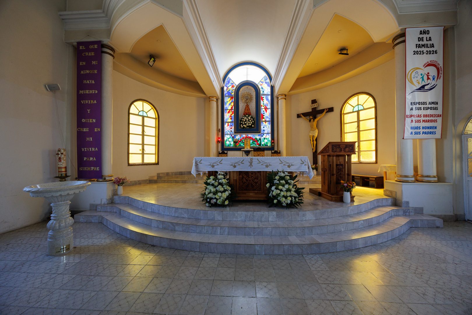 Voici la traduction du drapeau situé sur la droite de l’autel. Il célèbre l’Année de la Famille 2025-2026 :