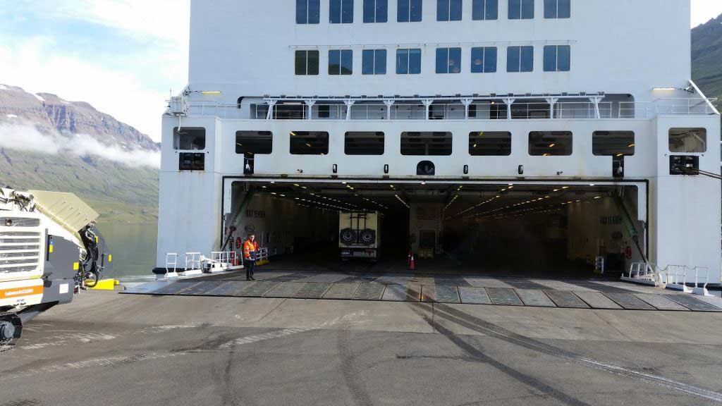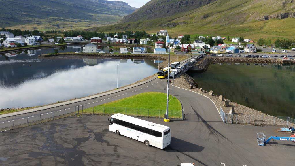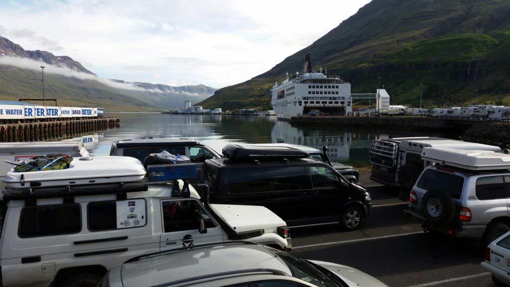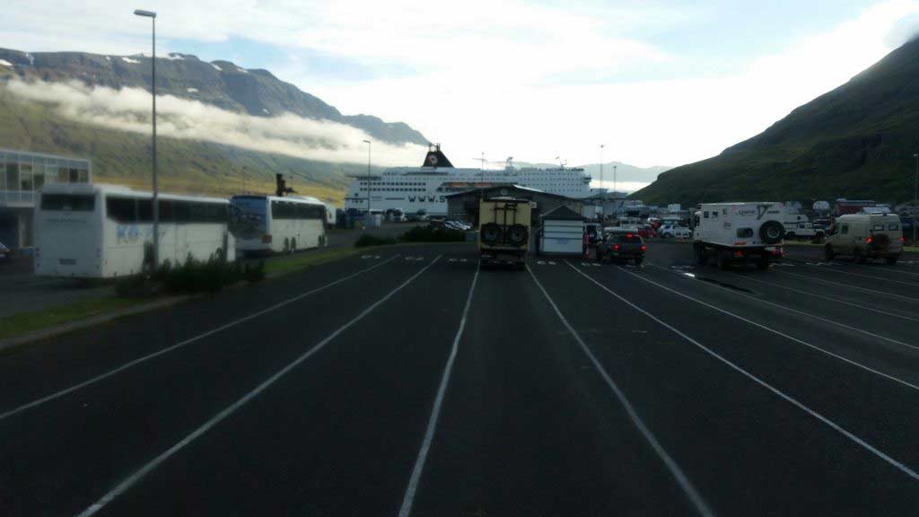Je me suis retrouvé dans toutes vos photos : dans la voiture sur le quai d’embarquement (5ème en partant de la droite), la Seat avec la caisse à l’arrière comme d’habitude :) (photo avec le bus blanc au premier plan du port de Seyðisfjörður)