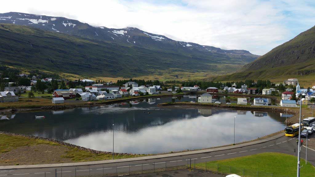 Dernière vue de Seyðisfjörður avant l’appareillage (prévu à 10h30 mais avec tous les véhicules à charger, nous ne partirons qu’à 11 heures)