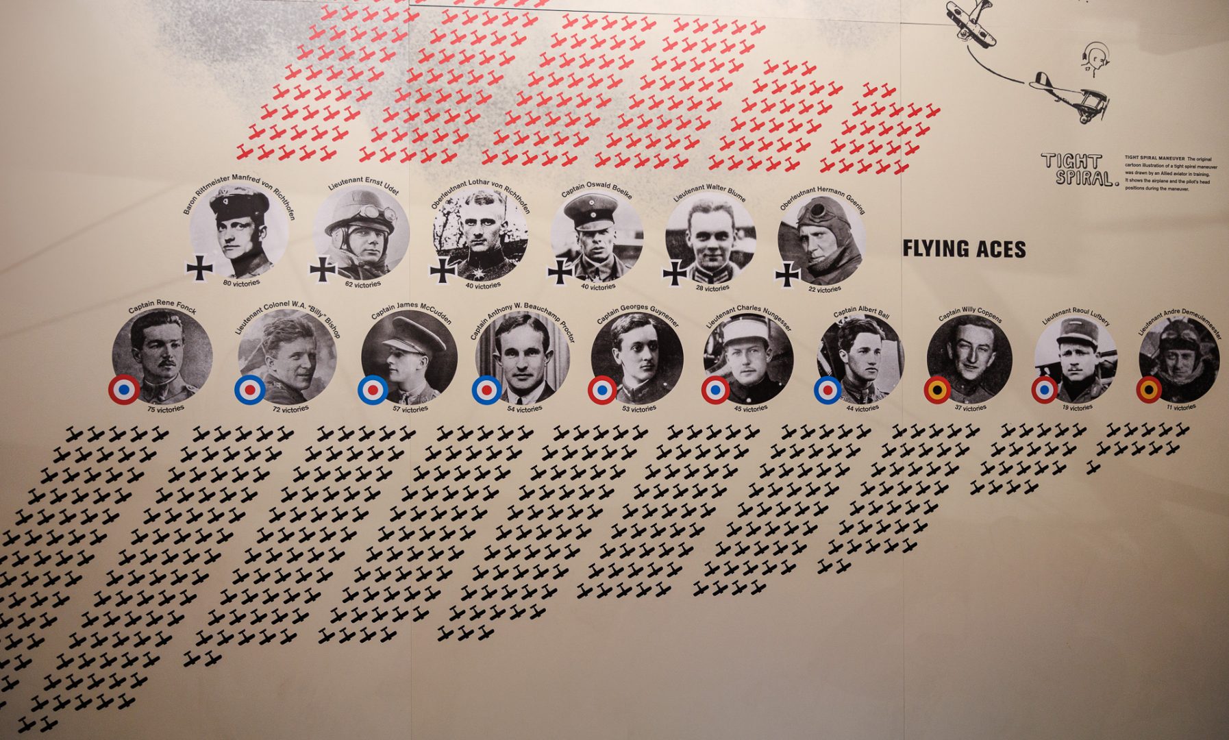 La Grande Guerre a vu naître les premiers « As » de l’aviation tant du coté allemand qu’alliés. Ils figurent sur le tableau ci-dessous. Les dessins noirs sous leur photo représentent le nombre d’avions ennemis abattus. Celui qui a le plus de victoires est bien évidemment le Baron allemand Manfred Von Richthofen plus connu sous le nom de Baron Rouge avec 80 avions abattus ! 4 aviateurs français figurent parmi ces As : René Funck, Georges Guynemer, Charles Nungesser et Raoul Lufbery avec respectivement 78, 63, 45 et 19 victoires.