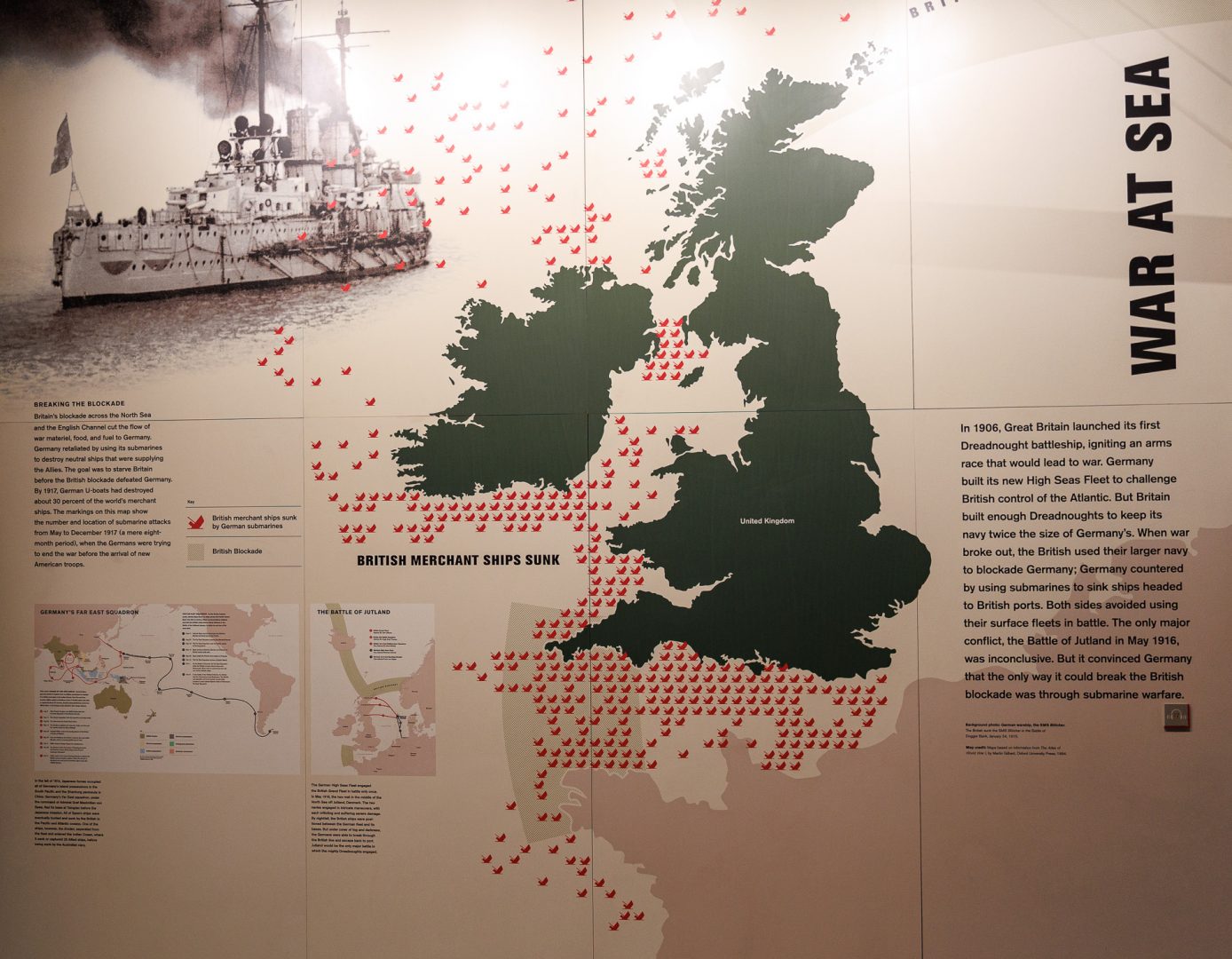 Elle s’est déroulé également en mer. Les premiers cuirassés et sous-marins furent utilisés durant ce conflit. L’Angleterre bloqua avec ses navires le passage vers la mer du Nord au bateaux allemands. Elle coupa ainsi l’approvisionnement en matériel, nourriture et gasoil à l’Allemagne.