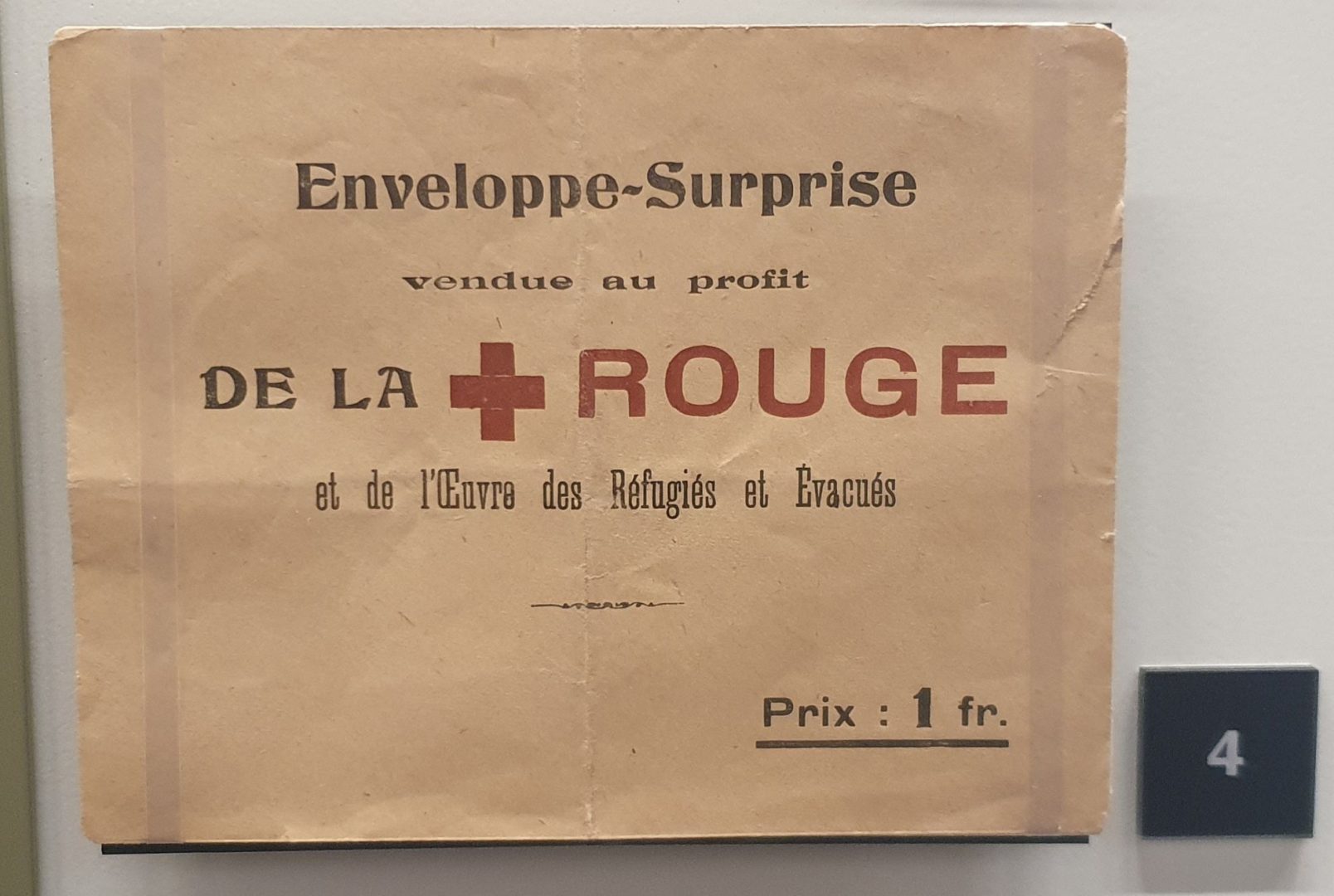 Quelques artefacts comme cette enveloppe surprise de la Croix-Rouge française. La vente d’enveloppes surprise a permis de soutenir l’action de la Croix-Rouge française en faveur des réfugiés et des personnes évacuées, notamment les prisonniers de guerre français de Meurthe-et-Moselle.