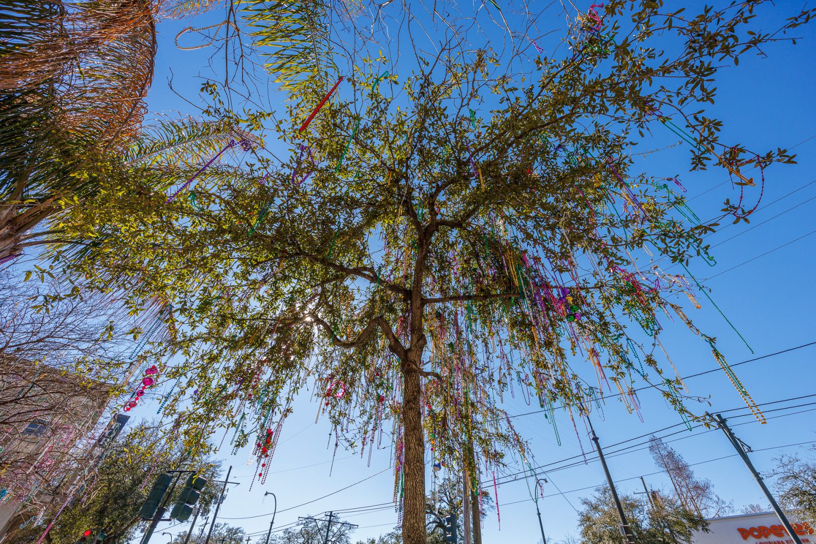 Un arbre à Mardi Gras… Même les arbres se parent de leurs plus beaux bijoux 🤣 !