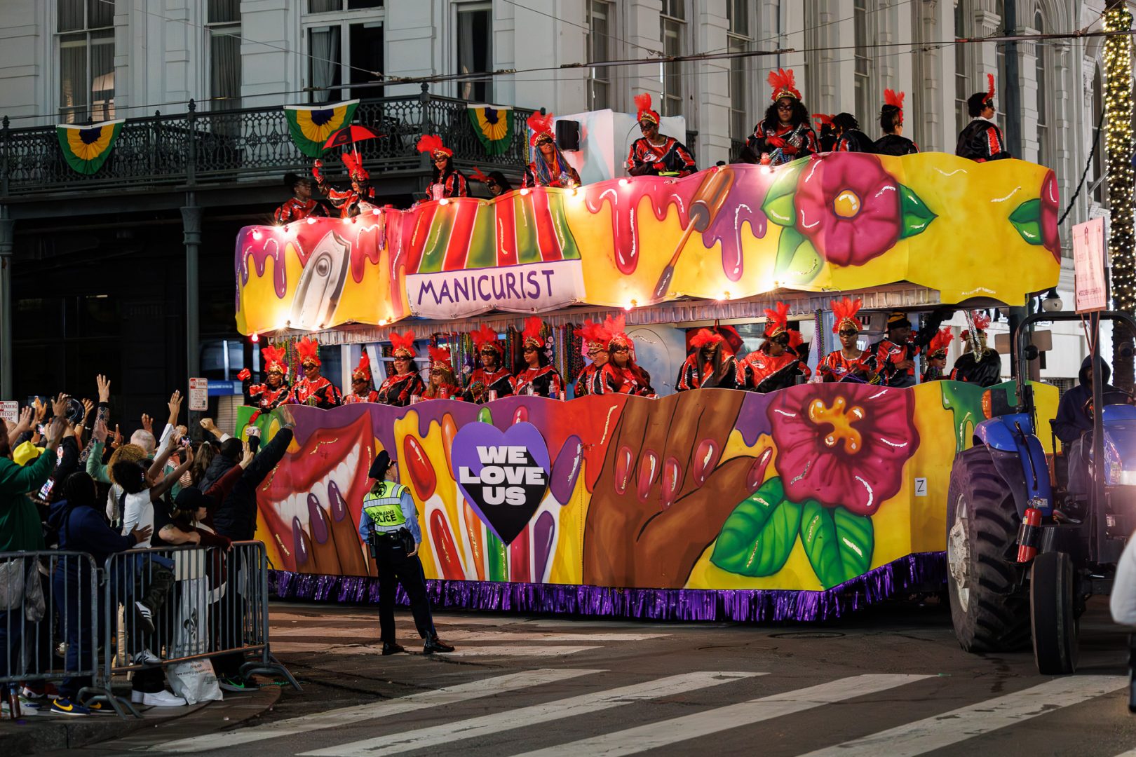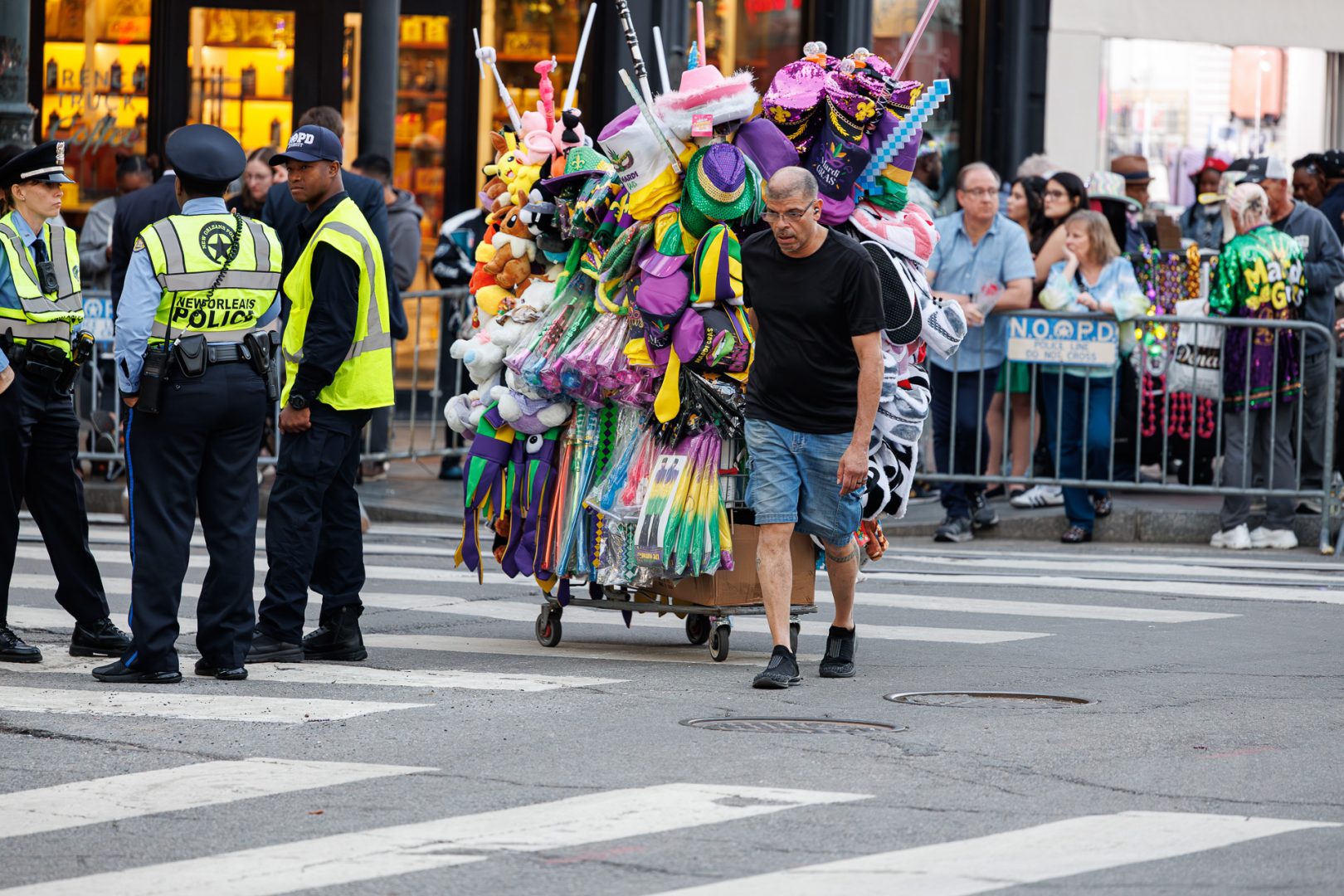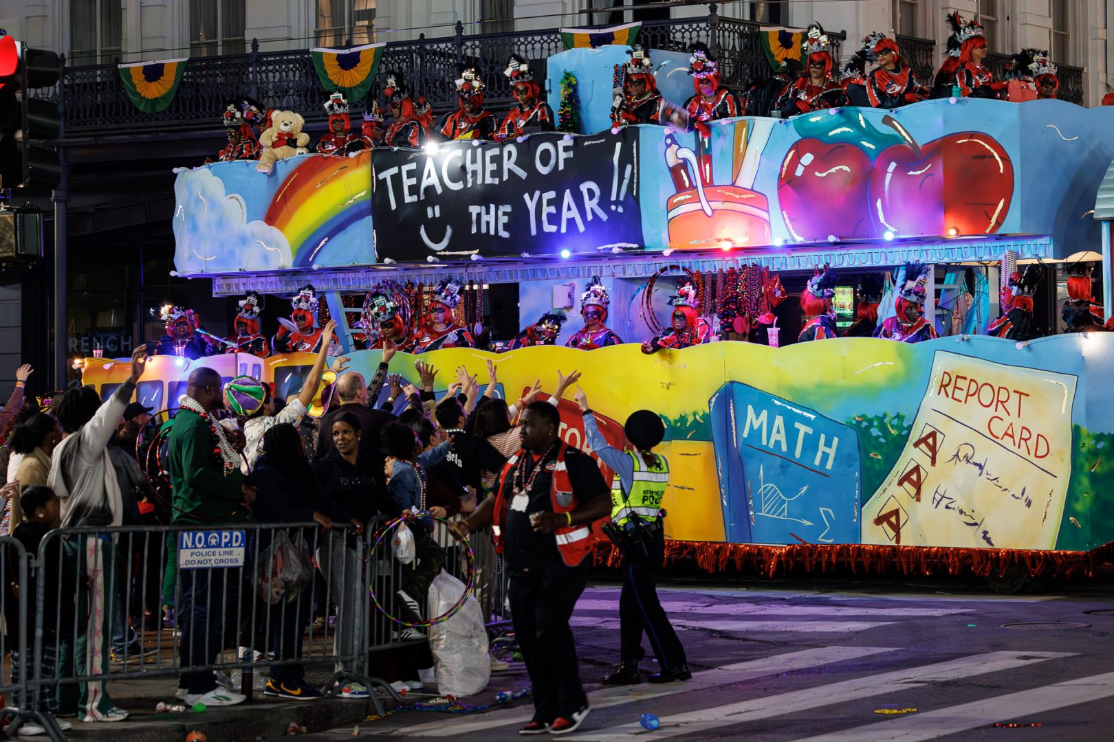 Nous avons été interloqués par cette dépense en objets de toute sorte dont un certain nombre finiront directement sur la chaussée, écrasés par le char suivant. Une partie de l’argent dépensé dans cette profusion de gadgets et mobilisation de moyens pourrait être utilisé autrement car il y a beaucoup de pauvreté à la Nouvelle-Orleans (23% de la population en 2023). Mais le tourisme est le principal moteur économique de la Nouvelle-Orléans alors… 🙄