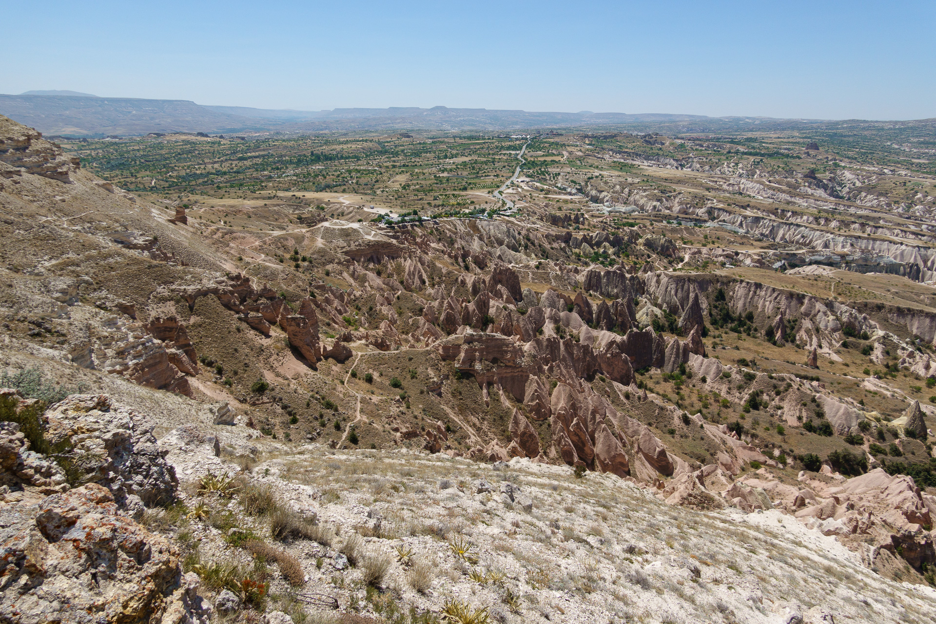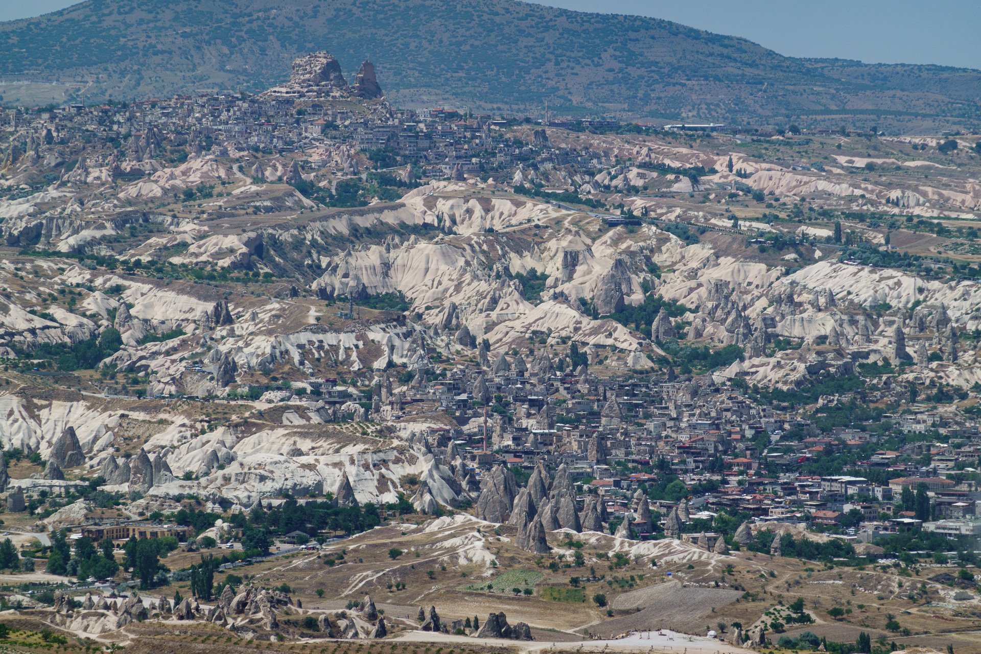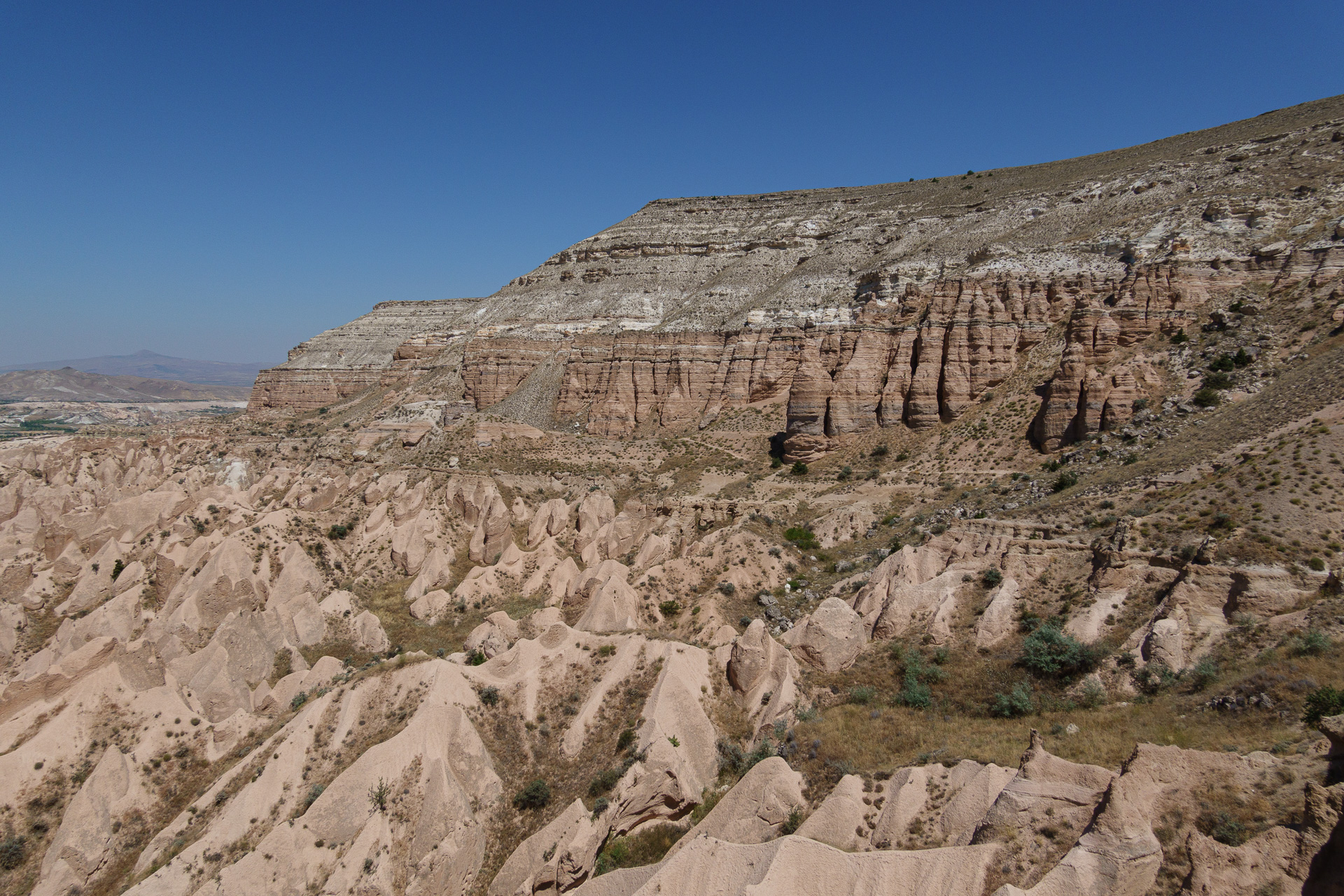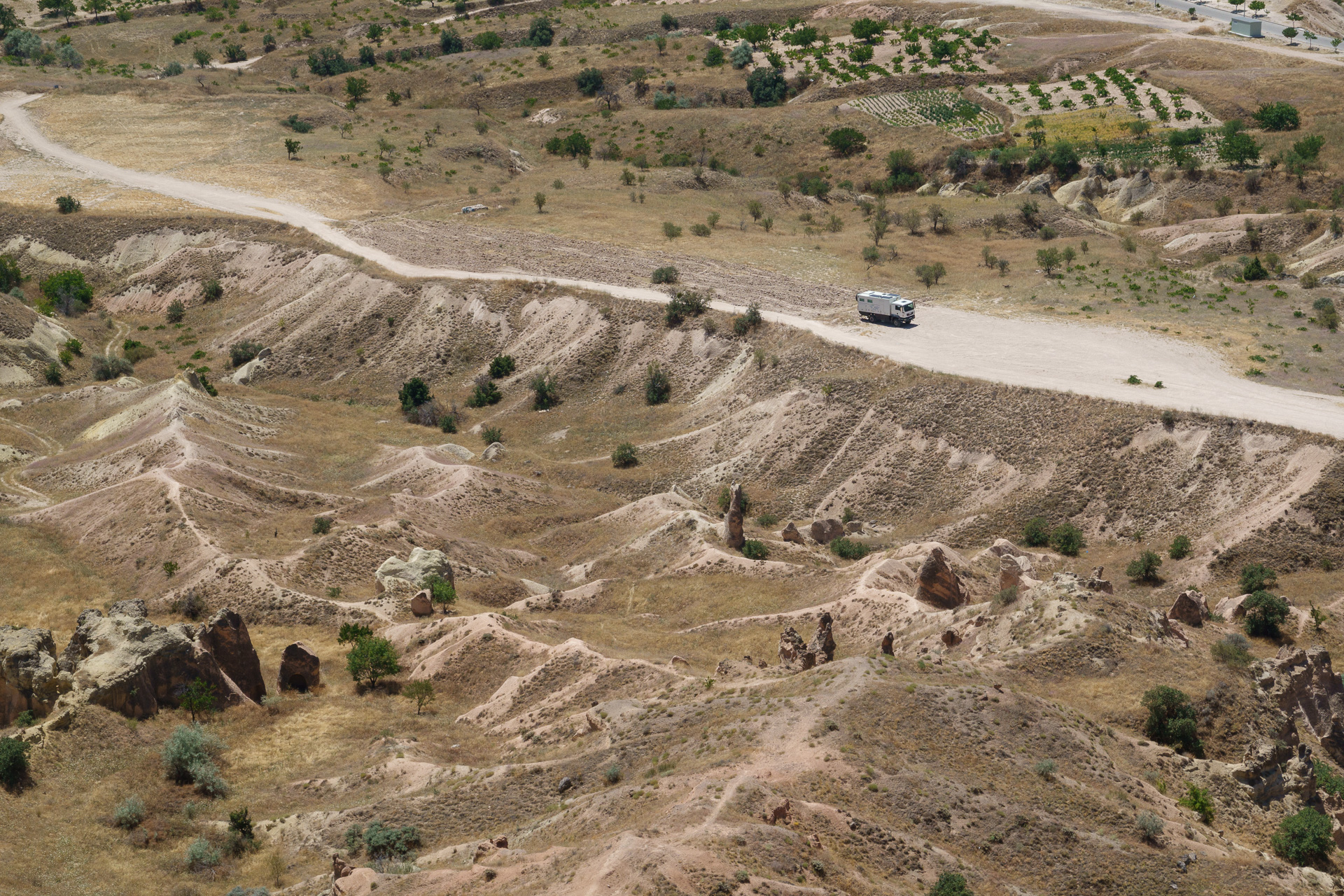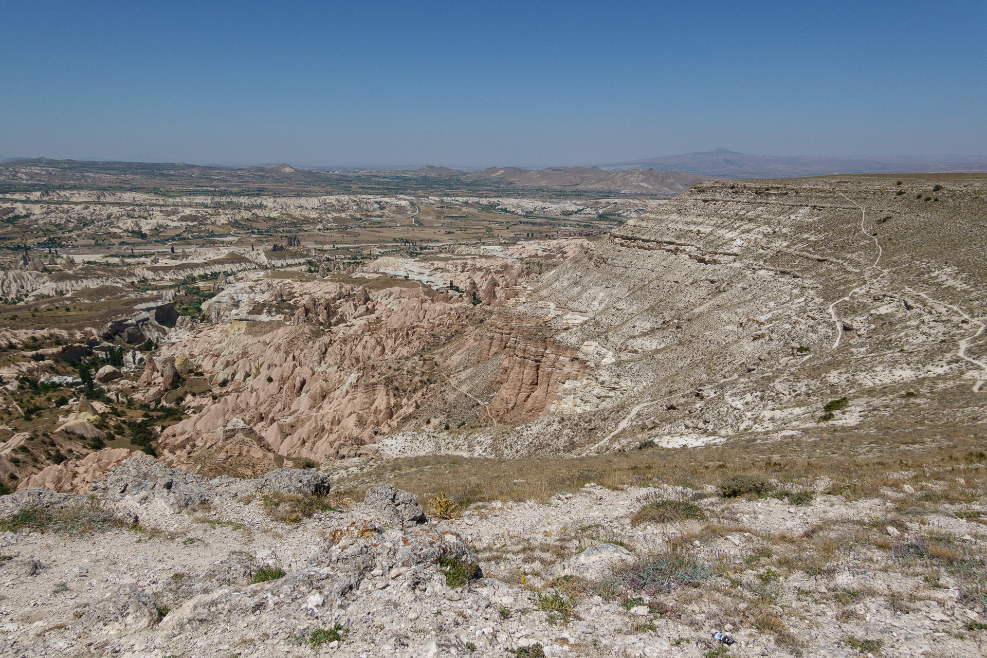 La Cappadoce fait partie du plateau anatolien. Elle possède des sommets volcaniques : le Mont Hasan, le Mont Melendiz et le Mont Erciyes (Mont Argée de l’Antiquité) qui est le point culminant de la région à 3916 m. Le tuf volcanique est donc abondant. La situation continentale et la haute altitude (plateau à un peu plus de 1000 m) donnent à la Cappadoce un climat fortement continental aux étés chauds et secs et aux hivers froids et enneigés. Nous, on trouve que par rapport aux régions plus à l’Ouest dans lesquelles nous étions précédemment, il y fait bon 🙂
