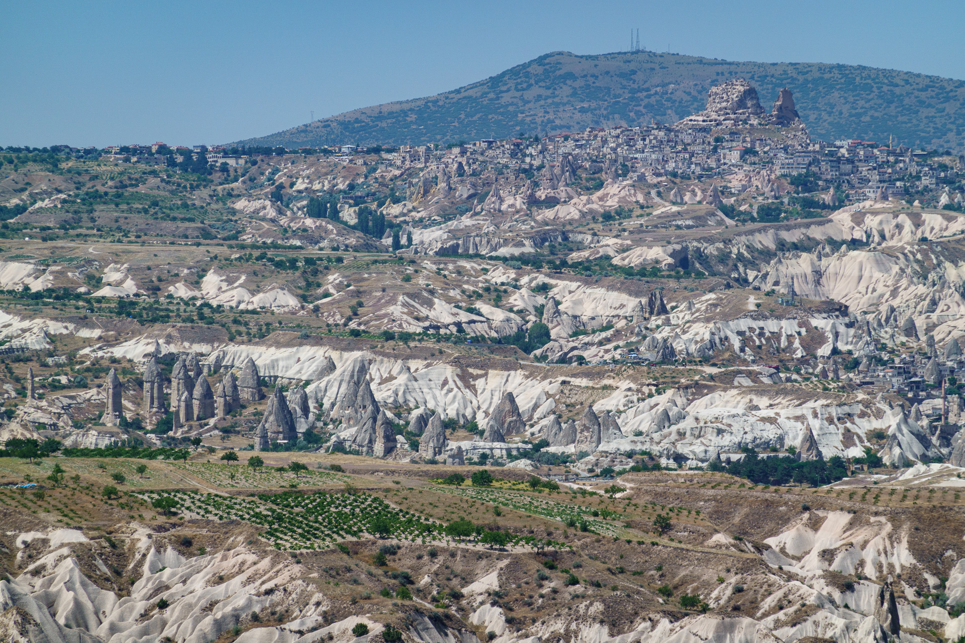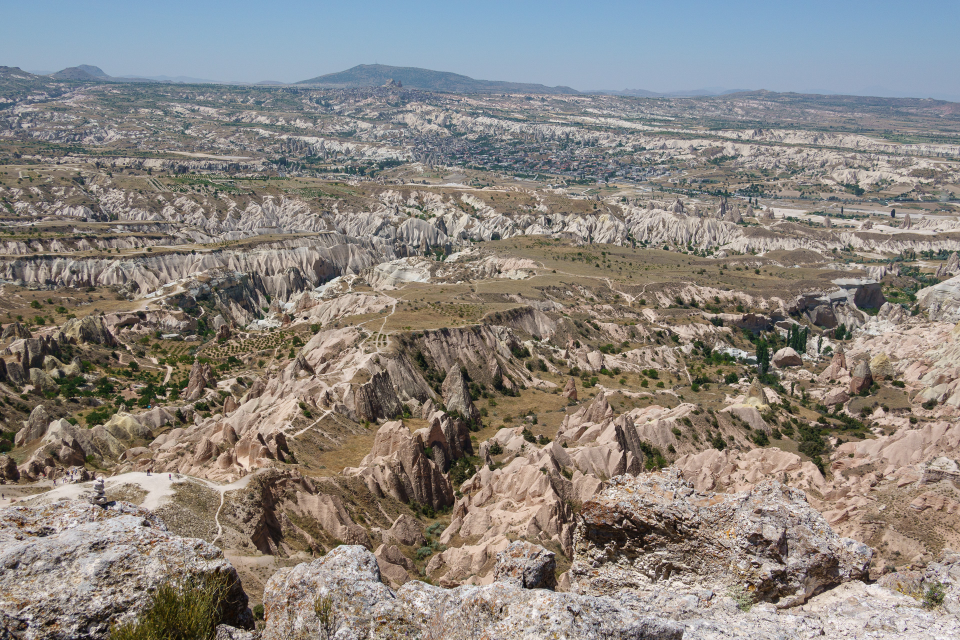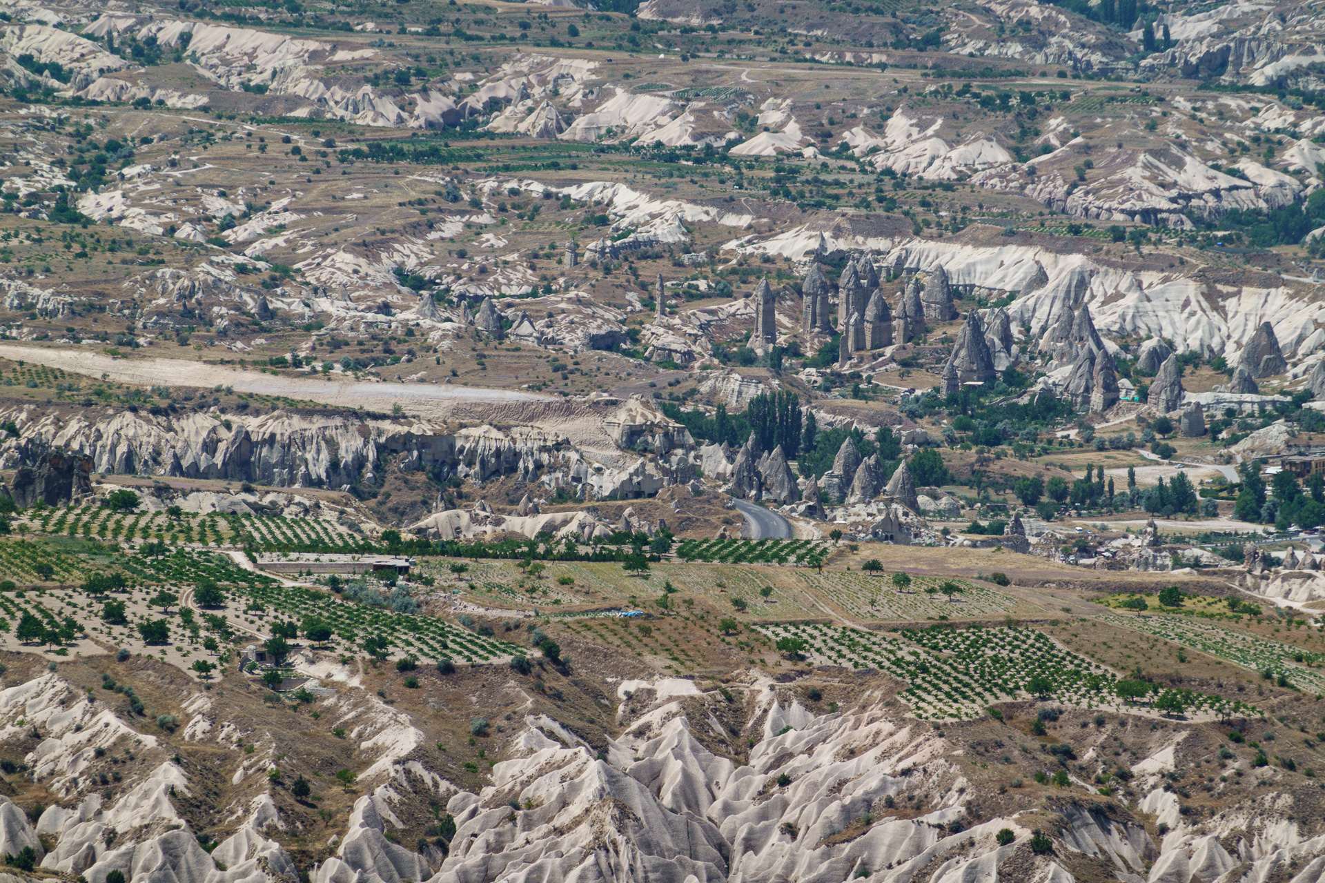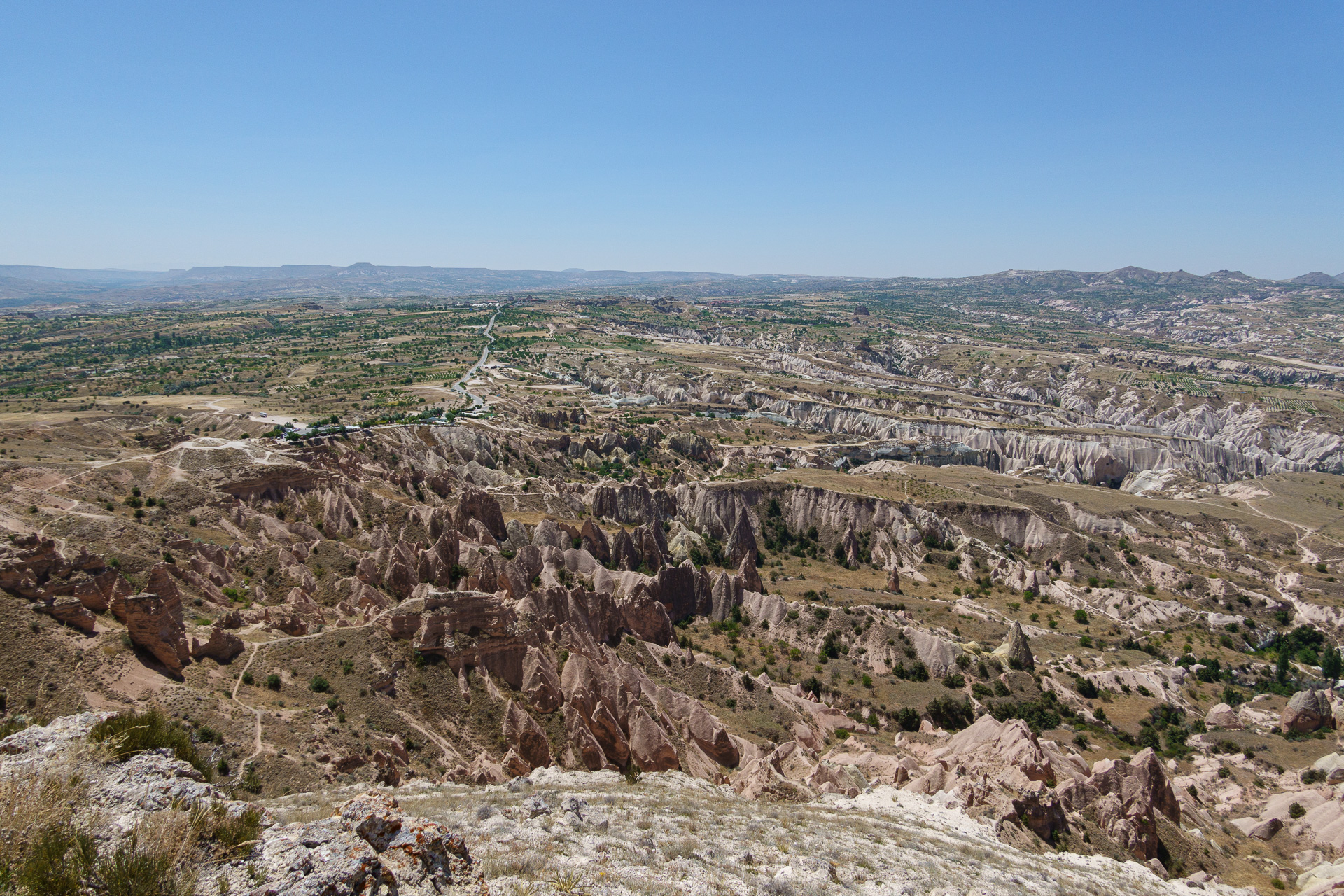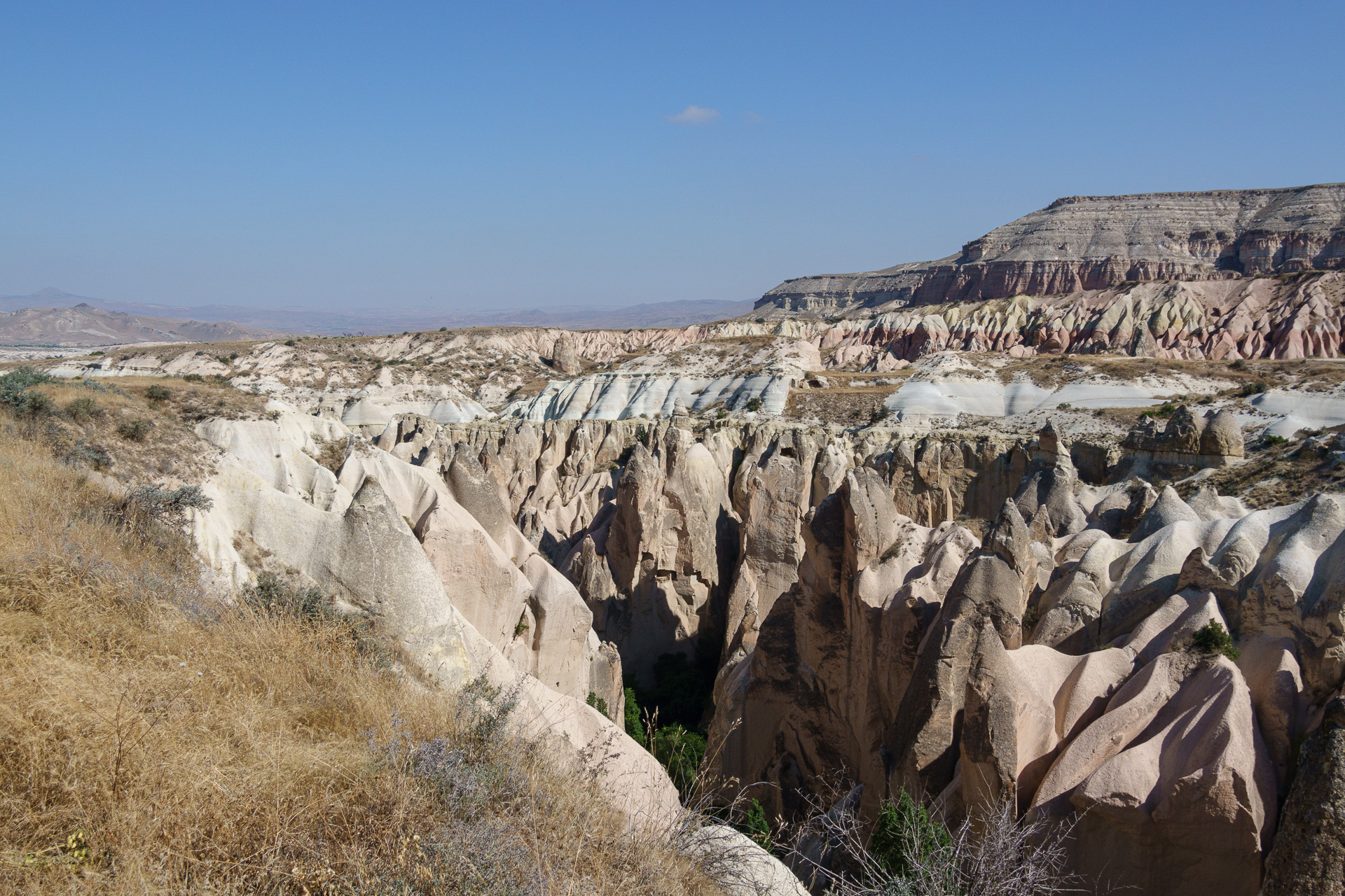 La Cappadoce fait partie du plateau anatolien. Elle possède des sommets volcaniques : le Mont Hasan, le Mont Melendiz et le Mont Erciyes (Mont Argée de l’Antiquité) qui est le point culminant de la région à 3916 m. Le tuf volcanique est donc abondant. La situation continentale et la haute altitude (plateau à un peu plus de 1000 m) donnent à la Cappadoce un climat fortement continental aux étés chauds et secs et aux hivers froids et enneigés. Nous, on trouve que par rapport aux régions plus à l’Ouest dans lesquelles nous étions précédemment, il y fait bon 🙂