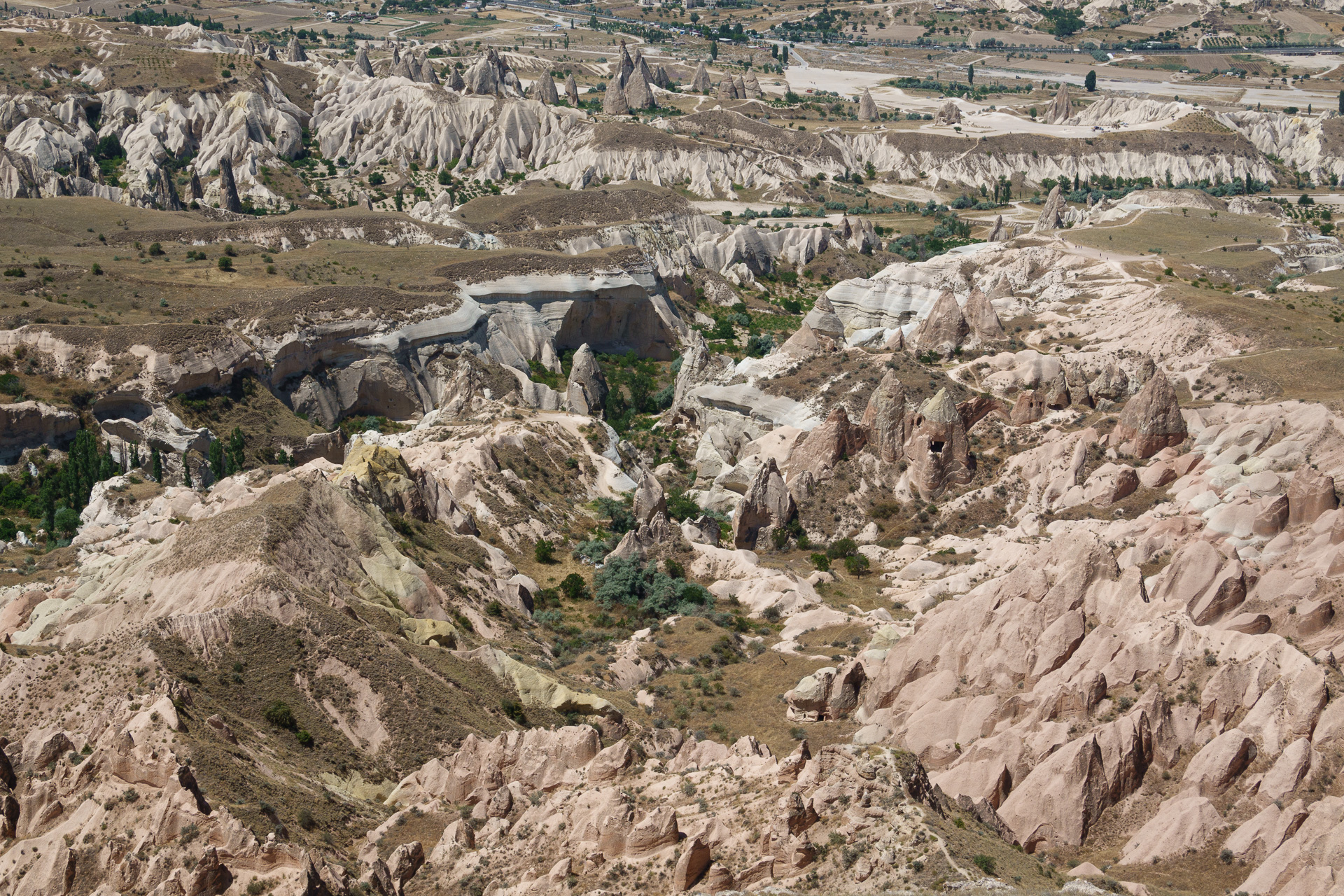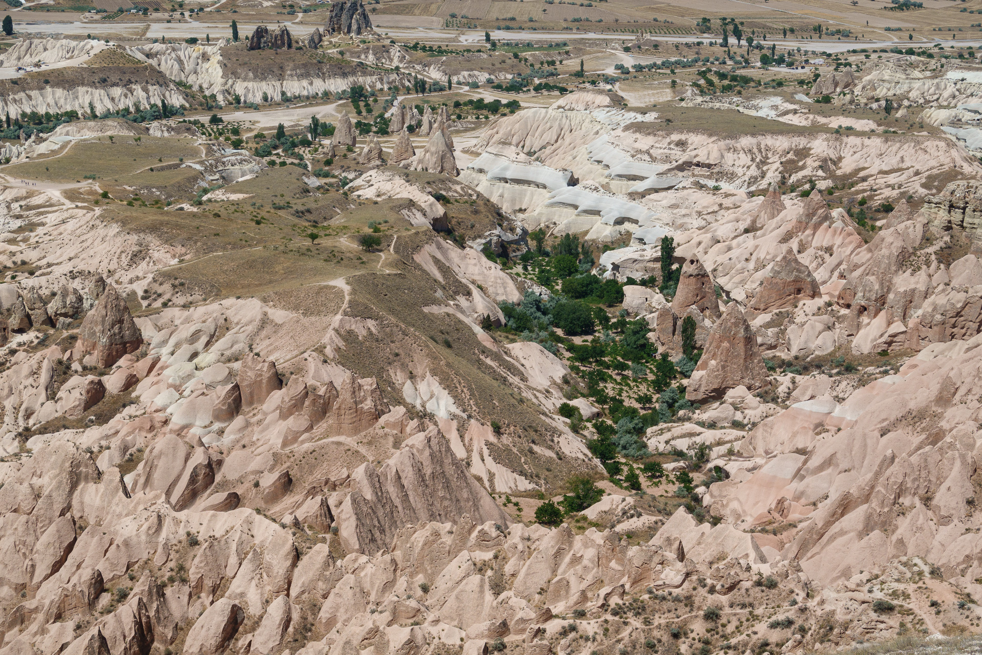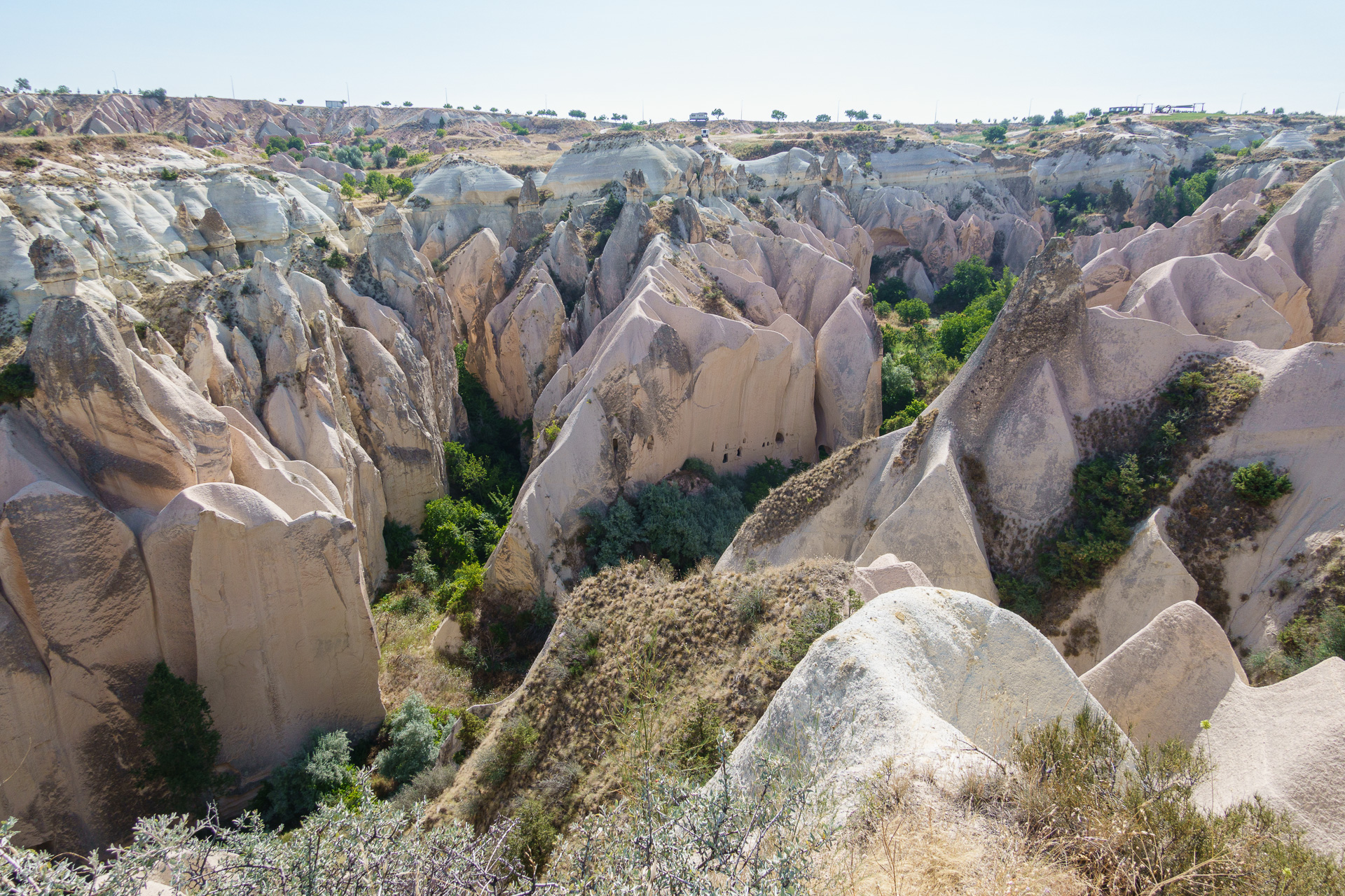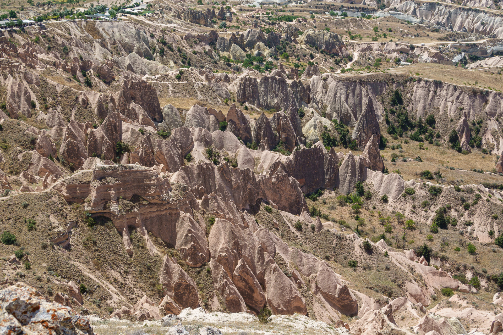 Sous l’effet des glaciations, la croûte de basalte s’est lézardée et le sol s’est désagrégé, permettant à l’eau de s’infiltrer et d’accentuer encore l’érosion. Quand le tuf est très tendre, il se désagrège totalement pour former une plaine poussiéreuse, tandis que sur les reliefs pentus, l’érosion crée canyons, mesas, cônes, pitons et cheminées de fée. Le paysage de Cappadoce présente donc une géomorphologie caractérisée pour l’essentiel par des plateaux formés par les cendres et les boues rejetées par les volcans avoisinants, des gorges, des cheminées de fées, ainsi que de grandes plaines constituées de résidus volcaniques. De nos jours, l’érosion continue : les pitons et les cônes actuels sont donc voués à disparaître, mais d’autres se dégagent peu à peu en bordure des plateaux. Place aux images 😉