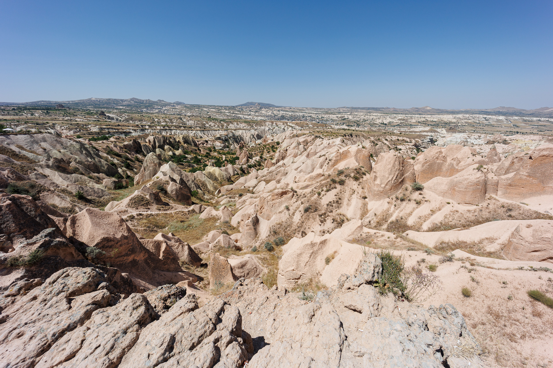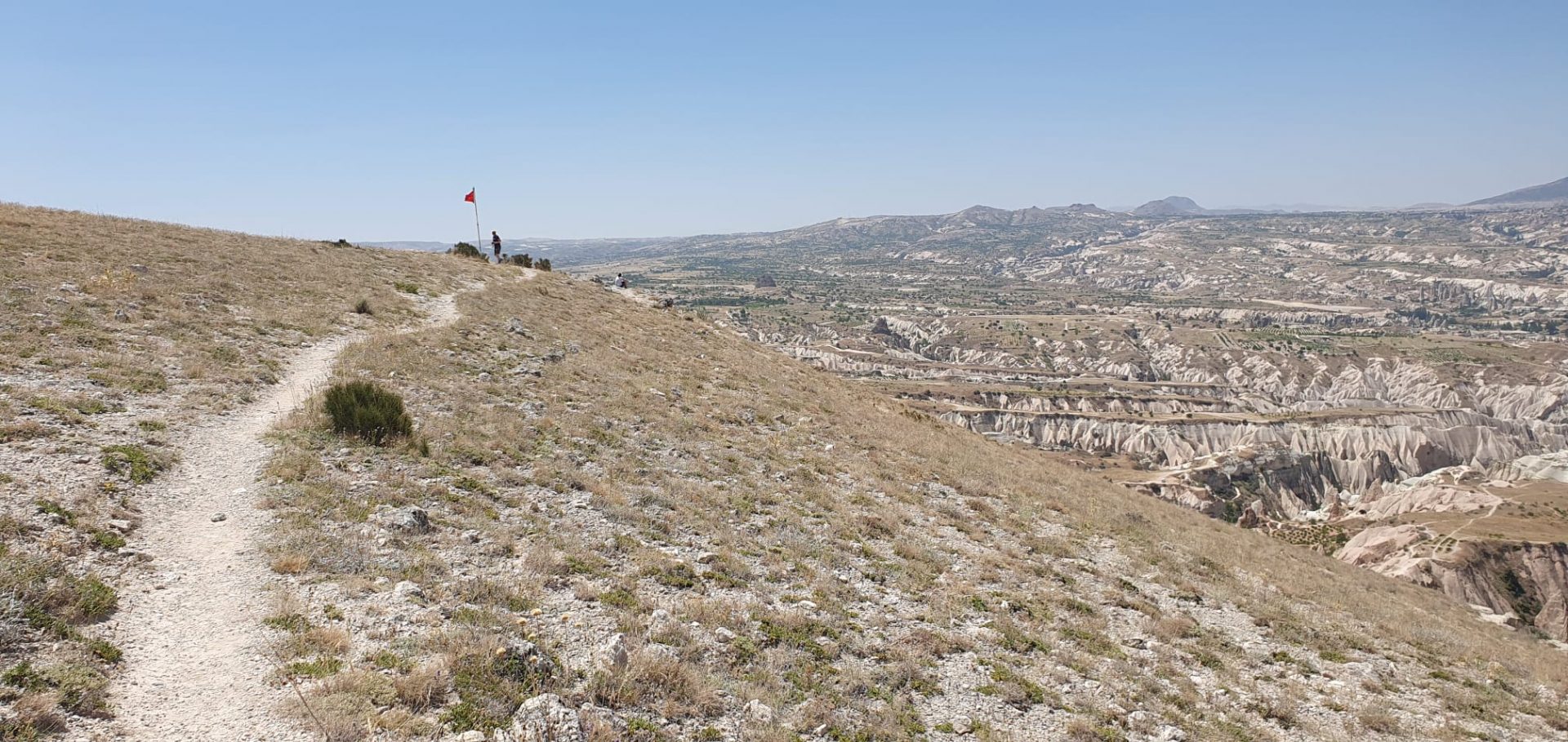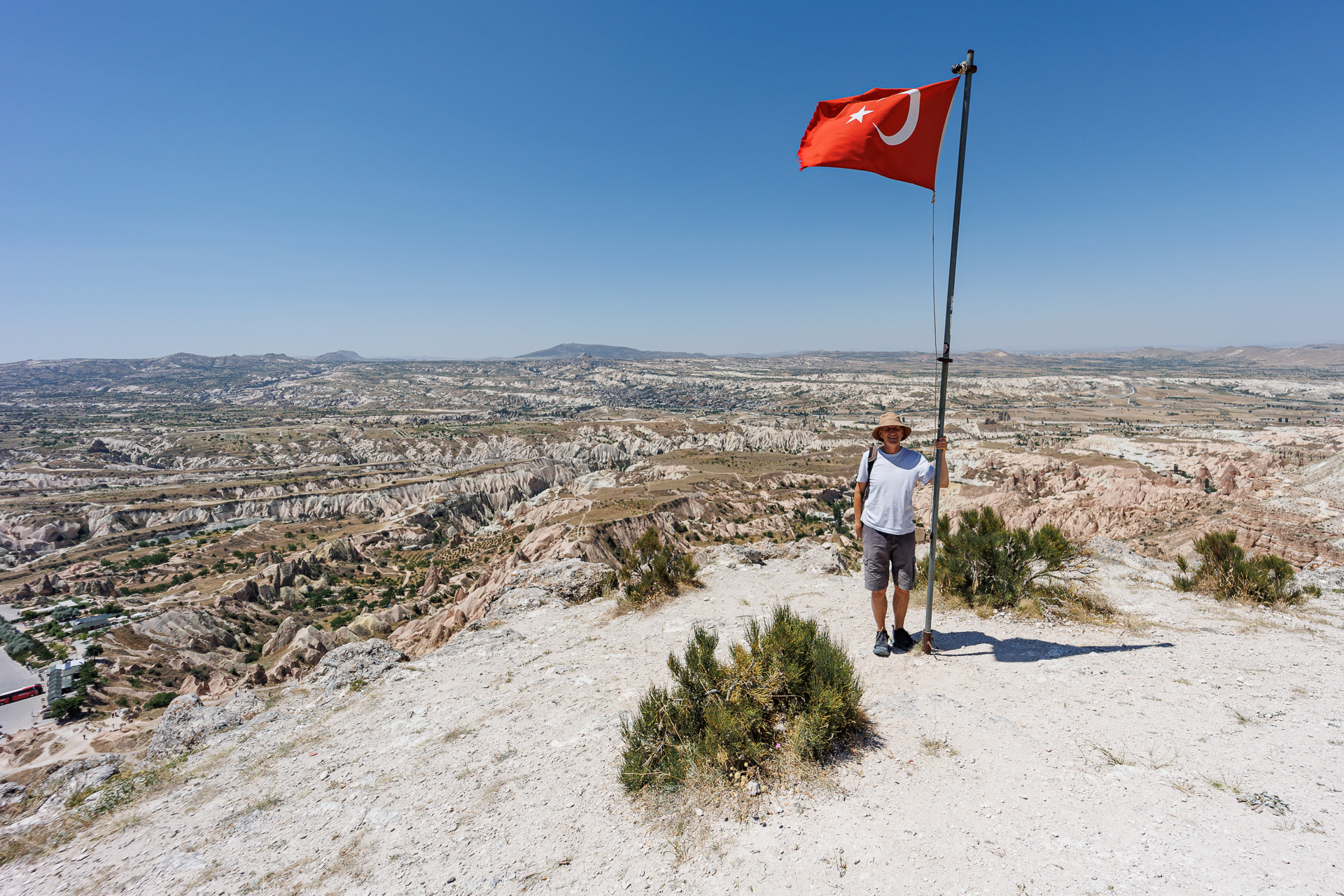 Ce matin le vent continue de souffler et nous ne verrons donc pas les fameuses montgolfières de Cappadoce 😭 A défaut de montgolfières, nous décidons de grimper en haut d’une colline pour avoir la même vue qu’elles 😉 Nous allons donc monter là haut.