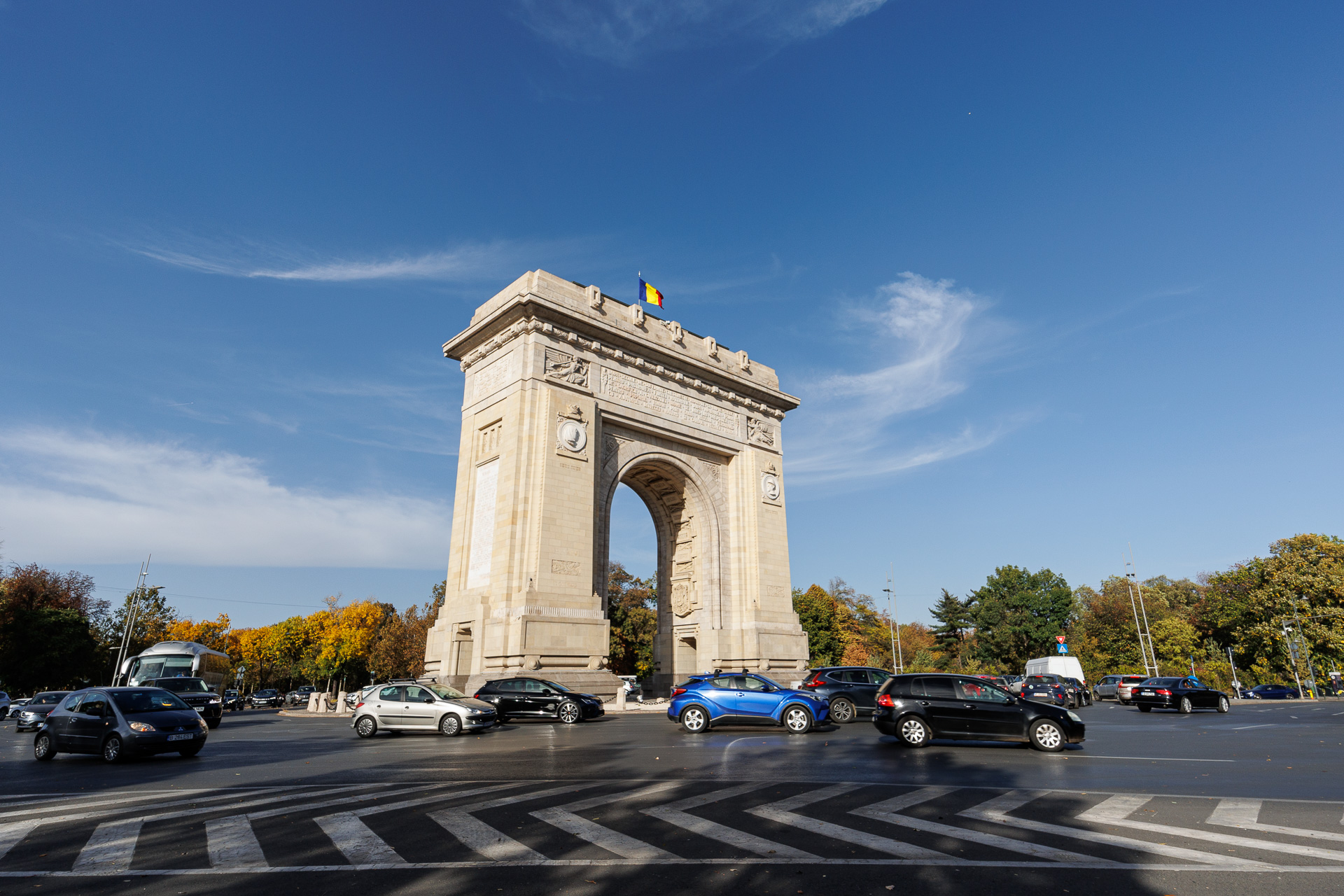 Nous quittons le Musée National du Paysan Roumain pour nous rendre à l’Arc de Triomphe. En 1878, un mois après l’accession du pays à l’indépendance, un premier arc de triomphe en bois est érigé rapidement afin d’y faire défiler les troupes victorieuses. Après la Première Guerre mondiale, un autre arc lui succède sur le même emplacement en 1922. Détruit en 1935, il est remplacé par l’Arc de Triomphe actuel, inauguré en septembre 1936. Sa construction est liée aux moments-clés de l’histoire du peuple roumain.