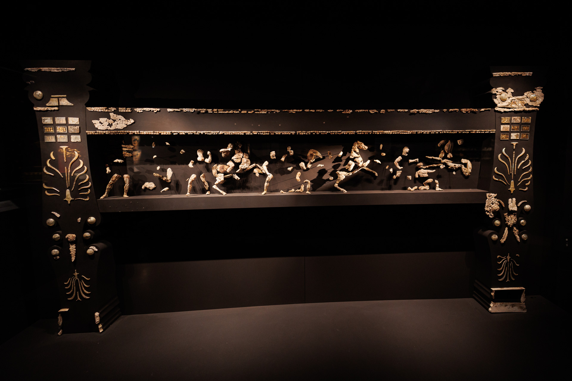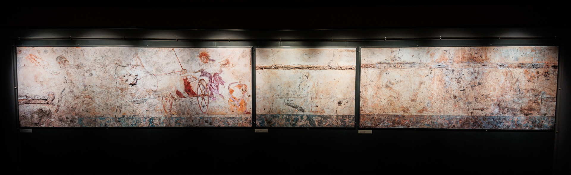 Sur une longueur de 5,56 m et une hauteur de 1,16 m la frise de la tombe de Philippe II déploie une scène complexe figurant les activités royales dans les grandes réserves de chasse royale de la Haute Macédoine.