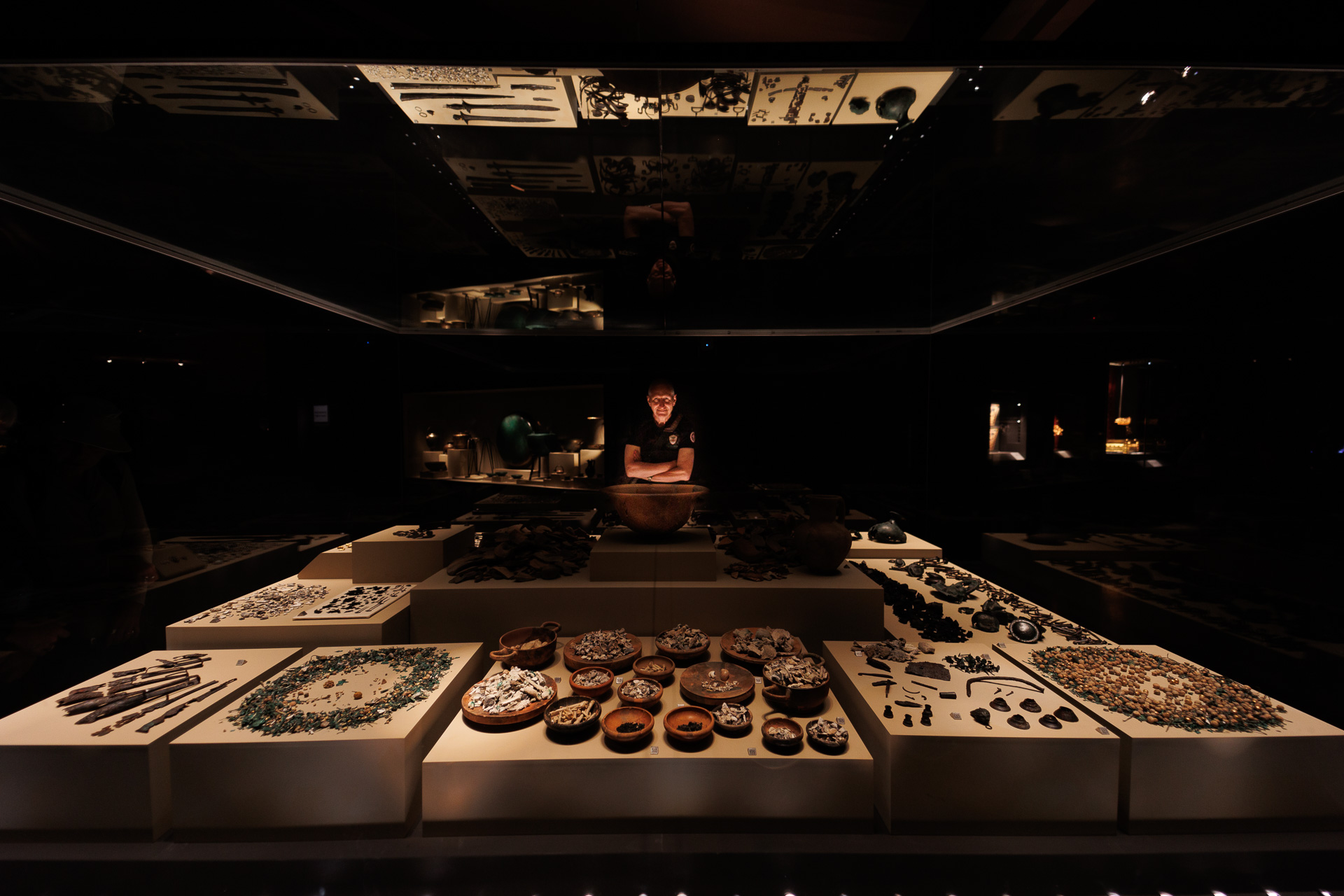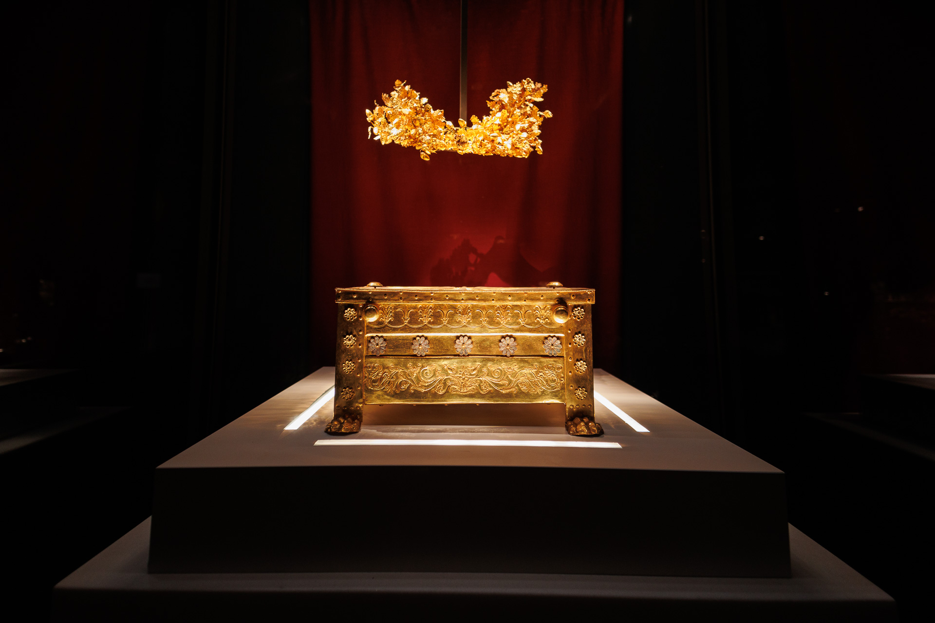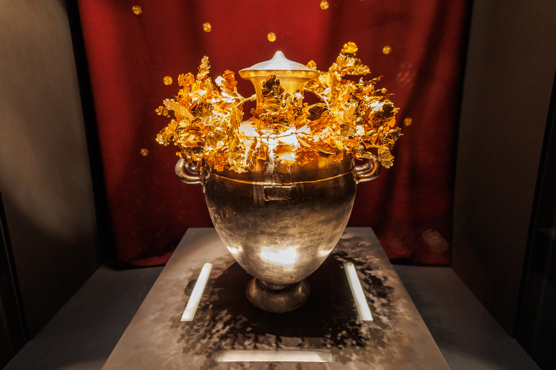 On y trouve en particulier des diadèmes et des coffrets en or, ainsi que de la vaisselle en argent en parfait état de conservation. L’ensemble se trouve sous le tumulus qui a été reconstitué grâce à un toit végétalisé. Les objets sont de toute beauté et dans un état de conservation incroyable !