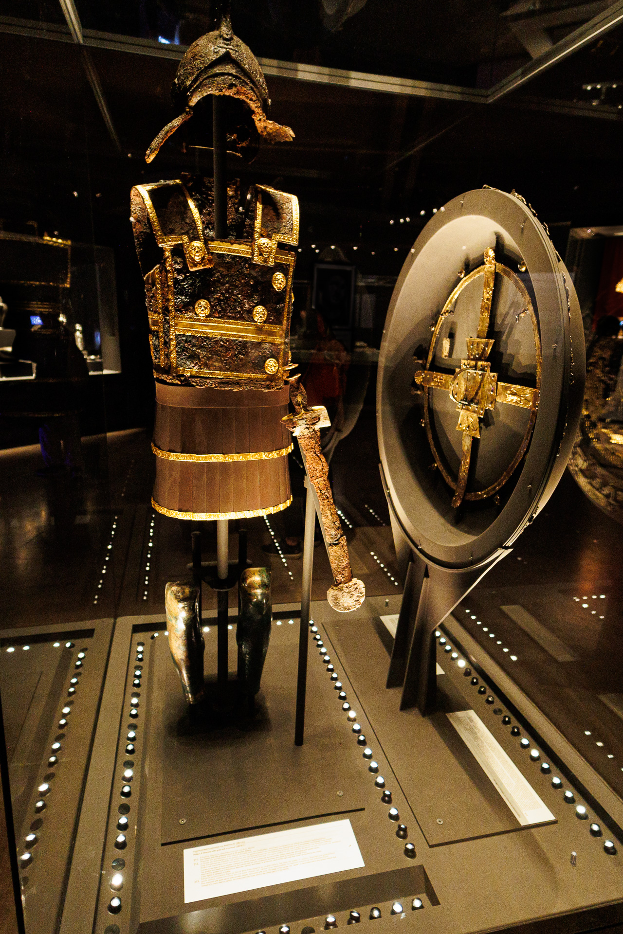 L’armure de Philippe II avec son heaume, ses jambières en bronze (cnémides) et son magnifique bouclier.