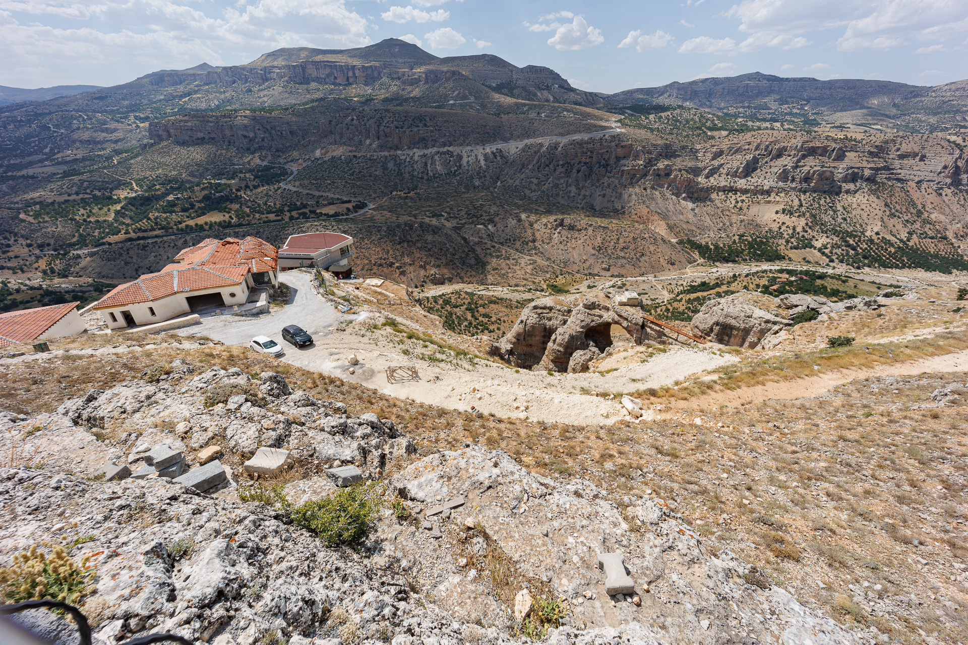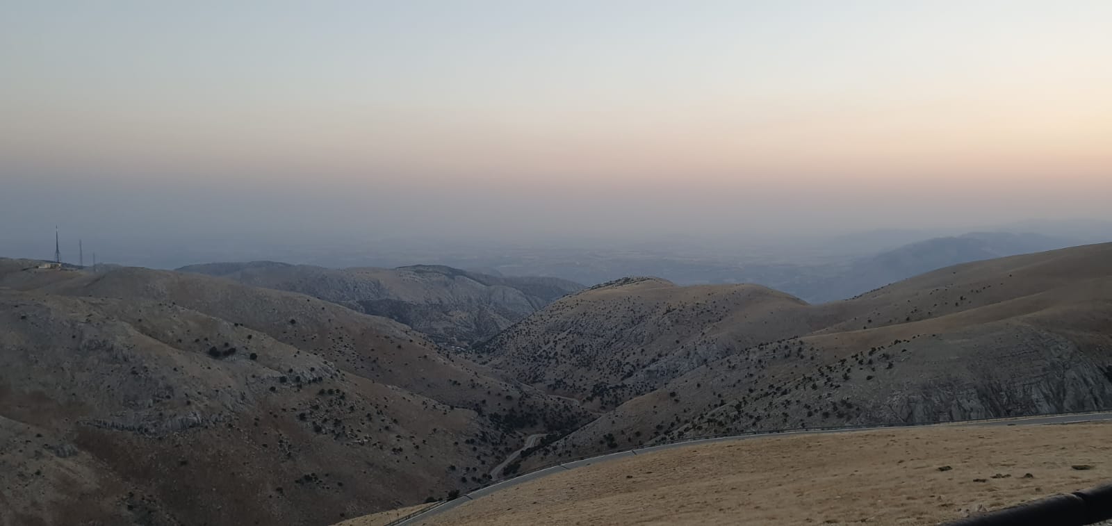 Après plus de 300 km, nous voilà enfin arrivés à destination 😁. Un beau paysage nous accueille. Le Nemrut Dağı ou Nemrut Dağ (en français : mont Nemrud ou mont Nemrod) est une montagne qui culmine à 2 203 mètres d’altitude. Elle est située dans la partie méridionale de l’Anatolie centrale, au nord de la frontière syrienne. Le Nemrut Dağı domine la vallée de l’Euphrate. Vue sur la vallée d’où nous arrivons.