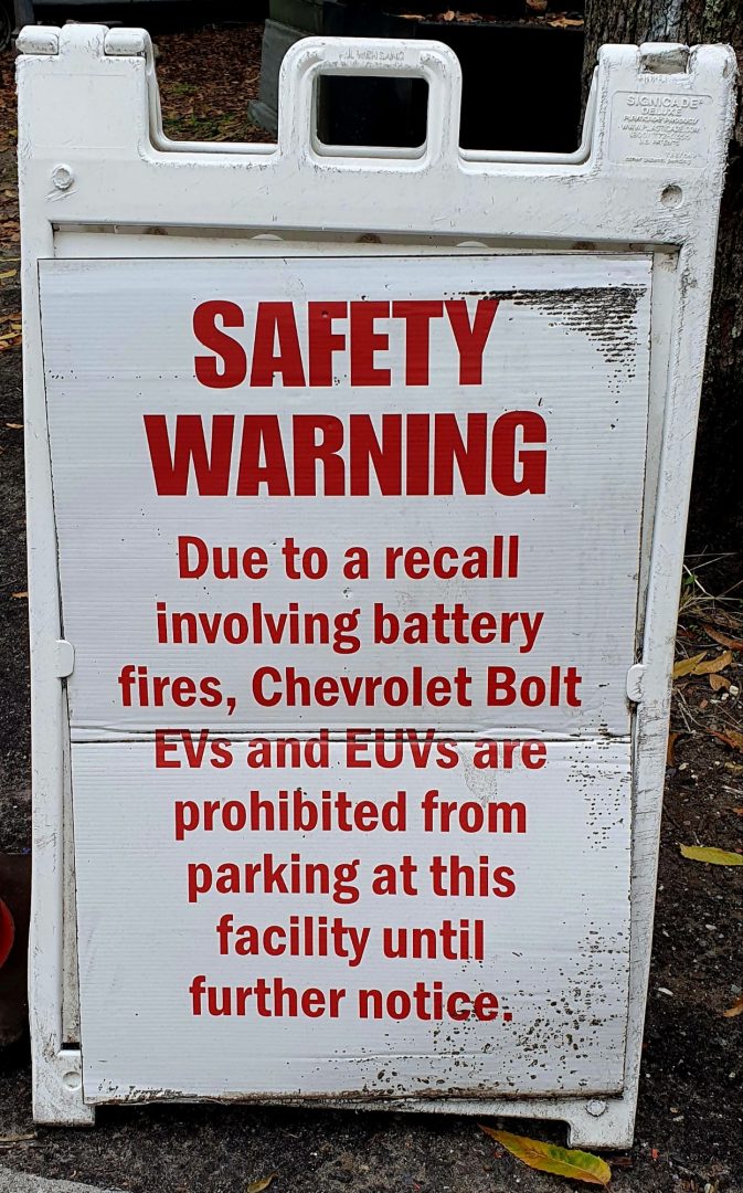 Un panneau nous interpelle… Suite à des incendies de batteries, les véhicules de type Chevrolet Bolt EVs et EUVs sont interdits sur le parking 🤪 ! Ce n’est pas très rassurant pour l’avenir des véhicules électriques quand on sait déjà que les véhicules avec des batteries au lithium sont interdits sur toutes les traversées maritimes. Heureusement, ce n’est pas le cas pour nous 😜 !