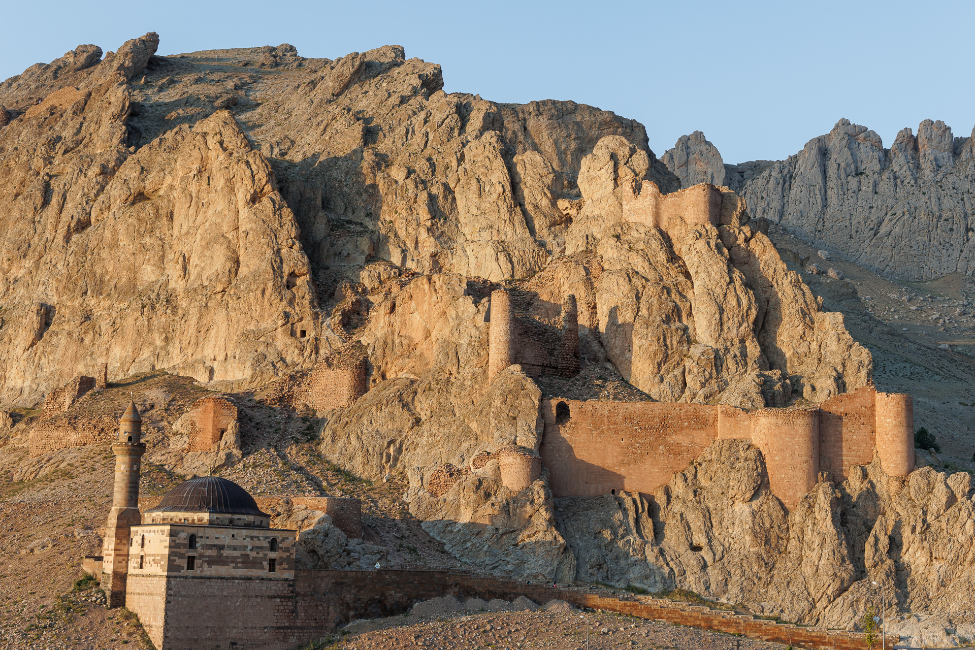 Sur un flanc de falaise, nous apercevons les ruines du château de Doğubayazıt. Il a été construit pendant la période Urartu au 9ème siècle avant JC. Il surplombe la mosquée de l’ancien village.