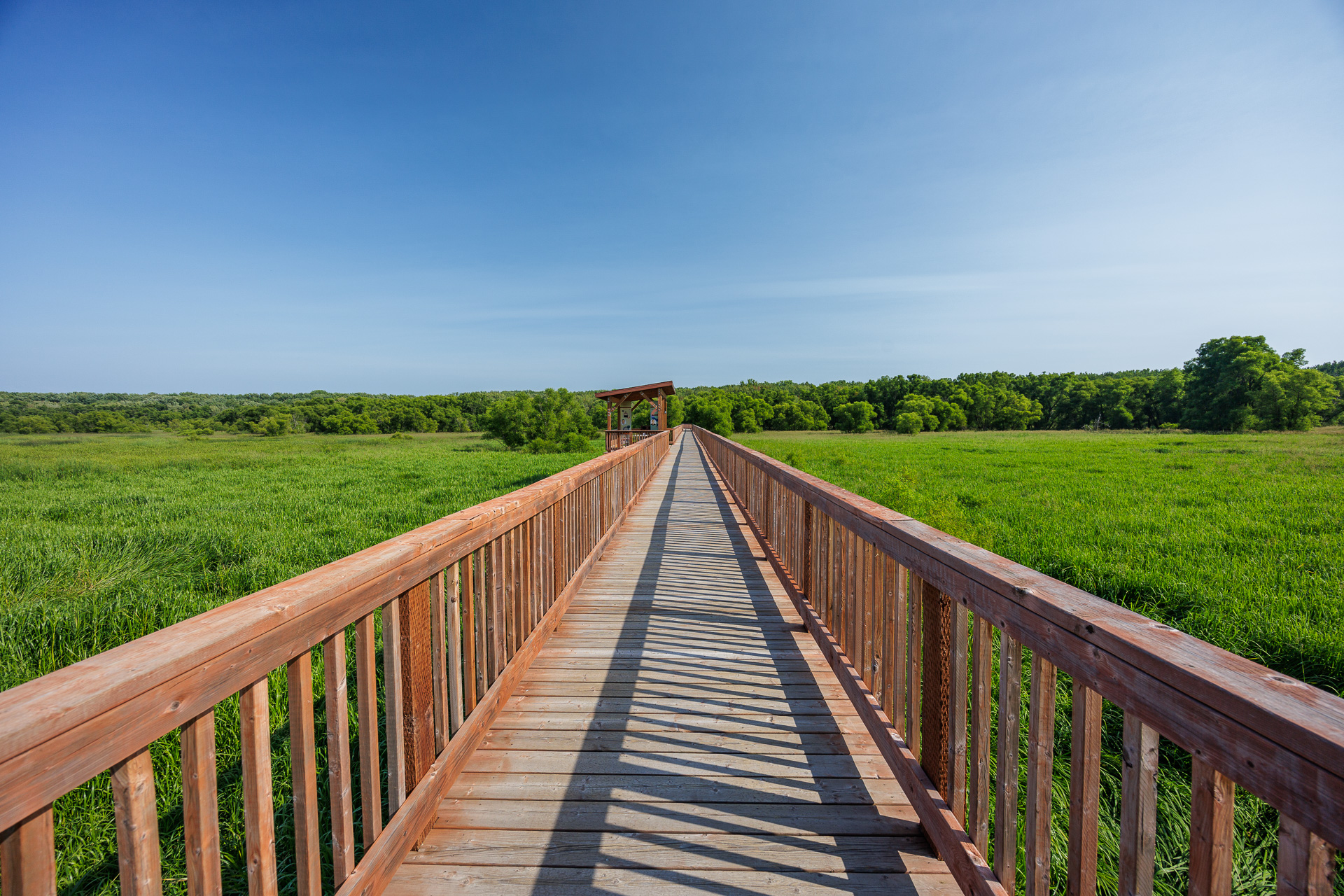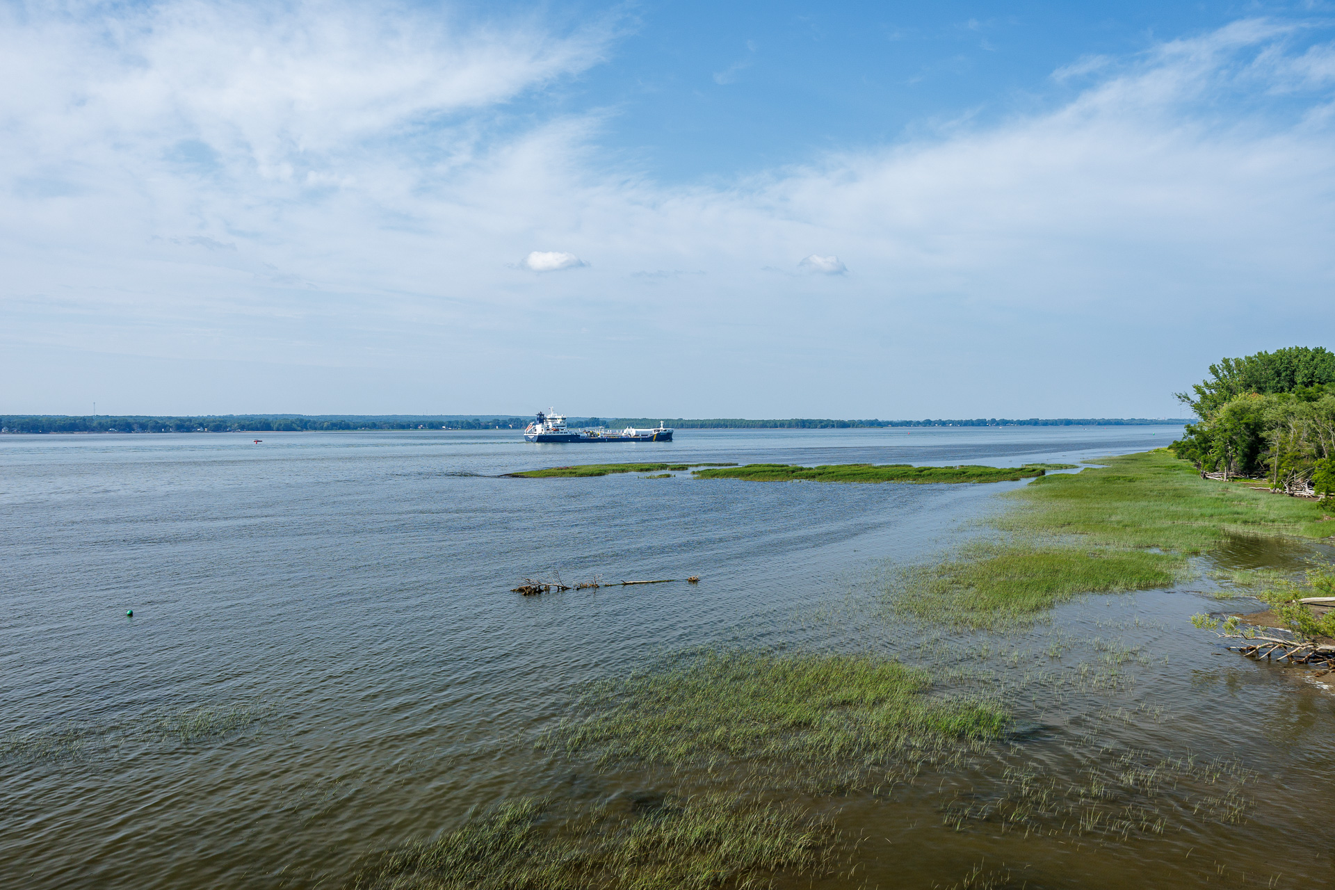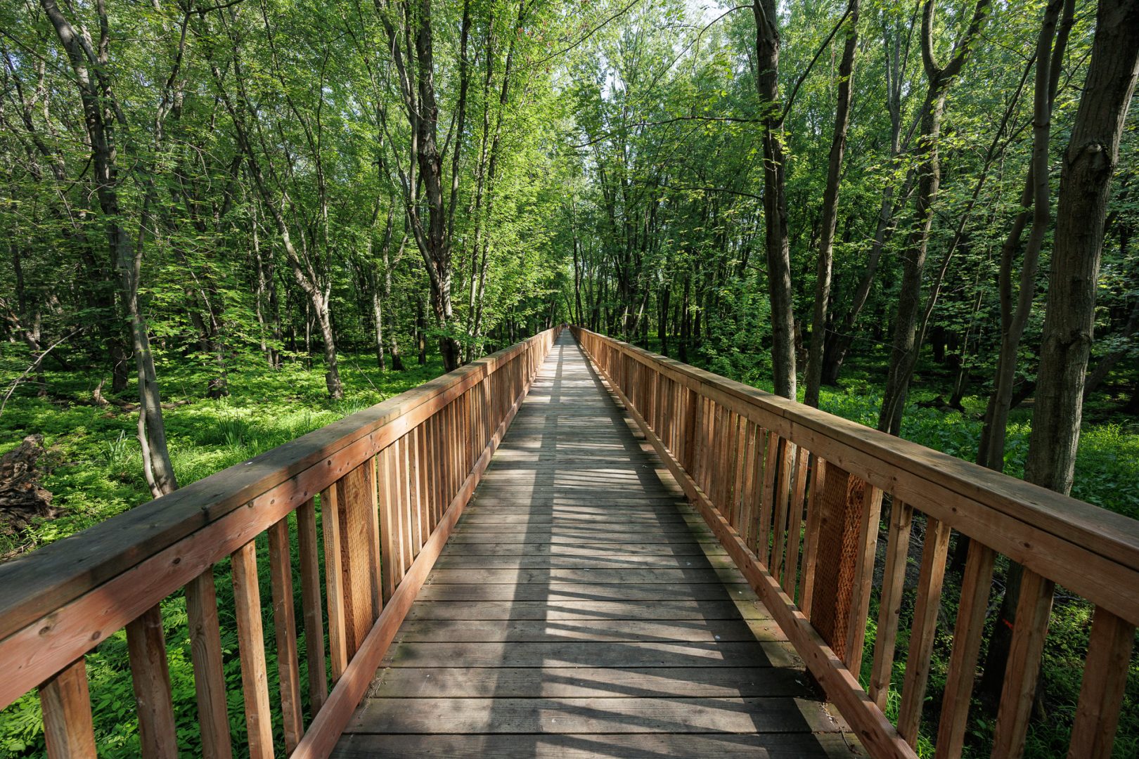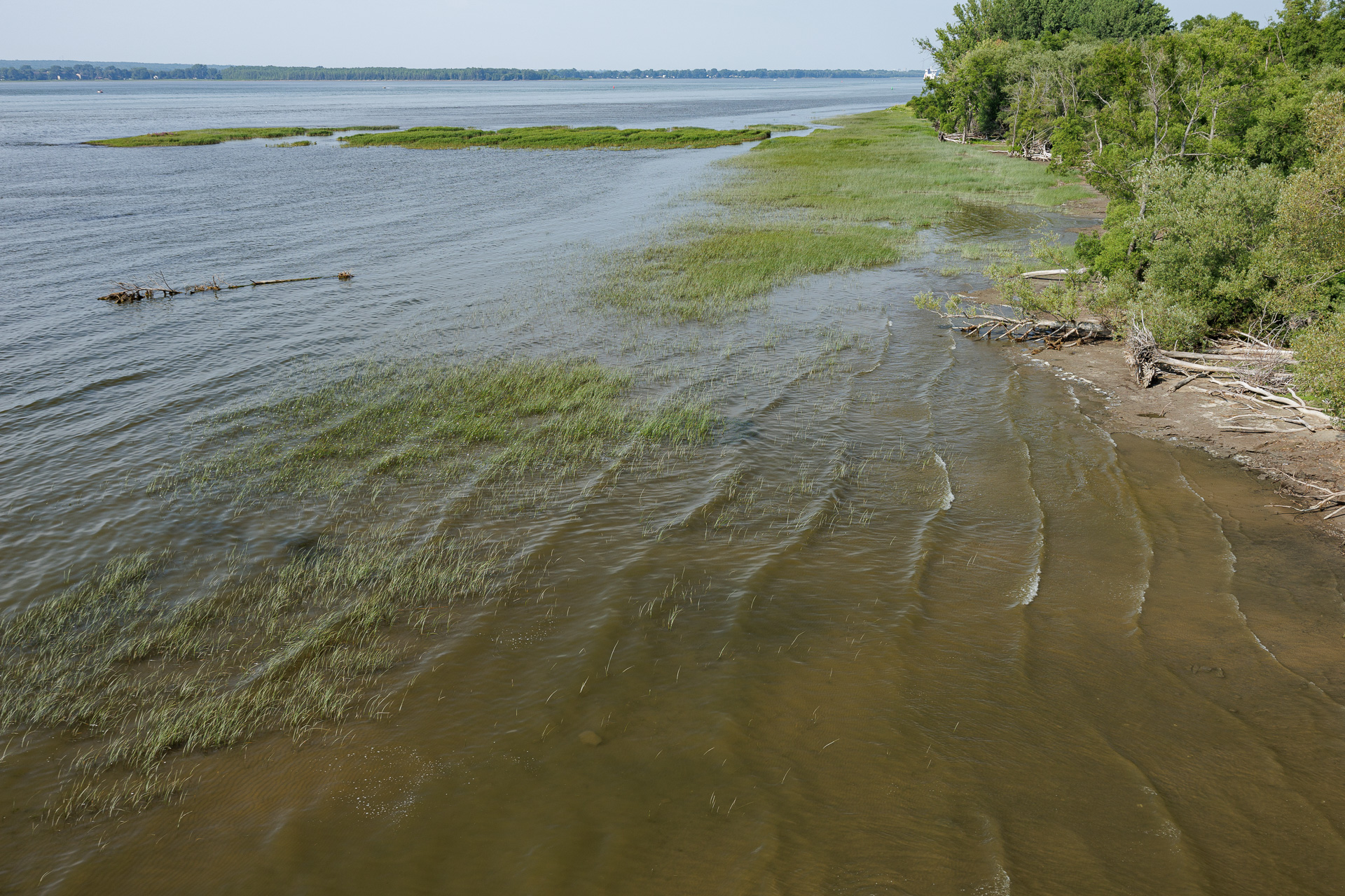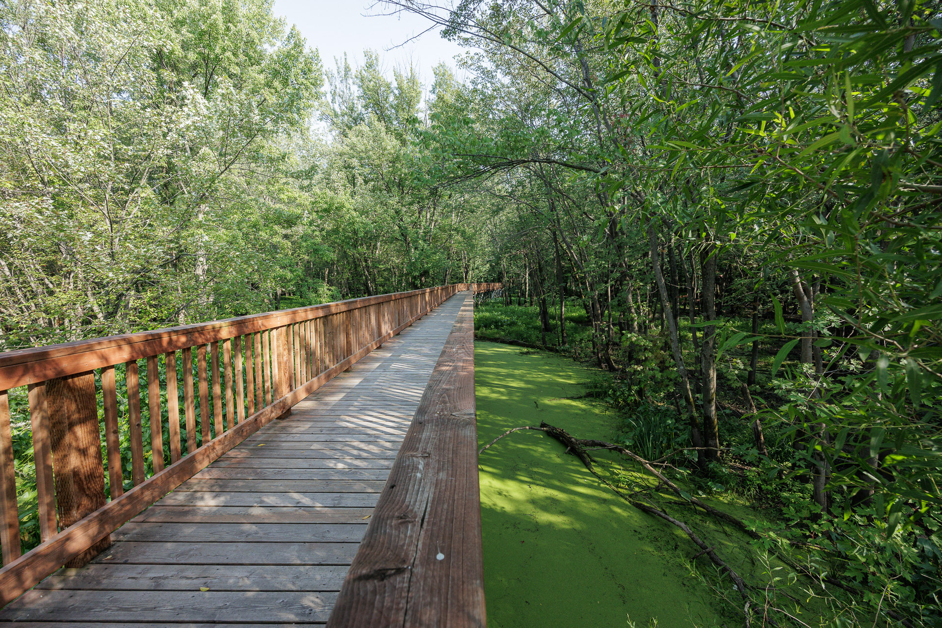 Une passerelle surélevée de 800 m de long nous conduit à une tour d’observation de 12 m de hauteur en bordure du majestueux fleuve Saint-Laurent.
