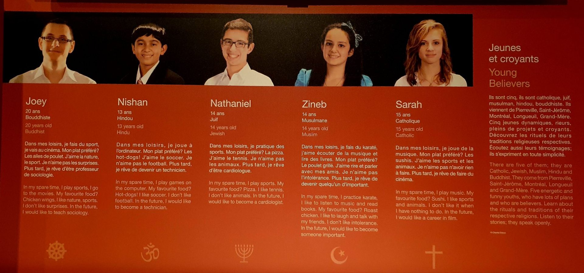 L’exposition permanente « Etes-vous près » nous fait parcourir, à travers le regard de 5 jeunes canadiens, les cinq grandes religions du monde avec leurs rituels respectifs, de la naissance à la mort. C’est une très belle exposition sur la tolérance.