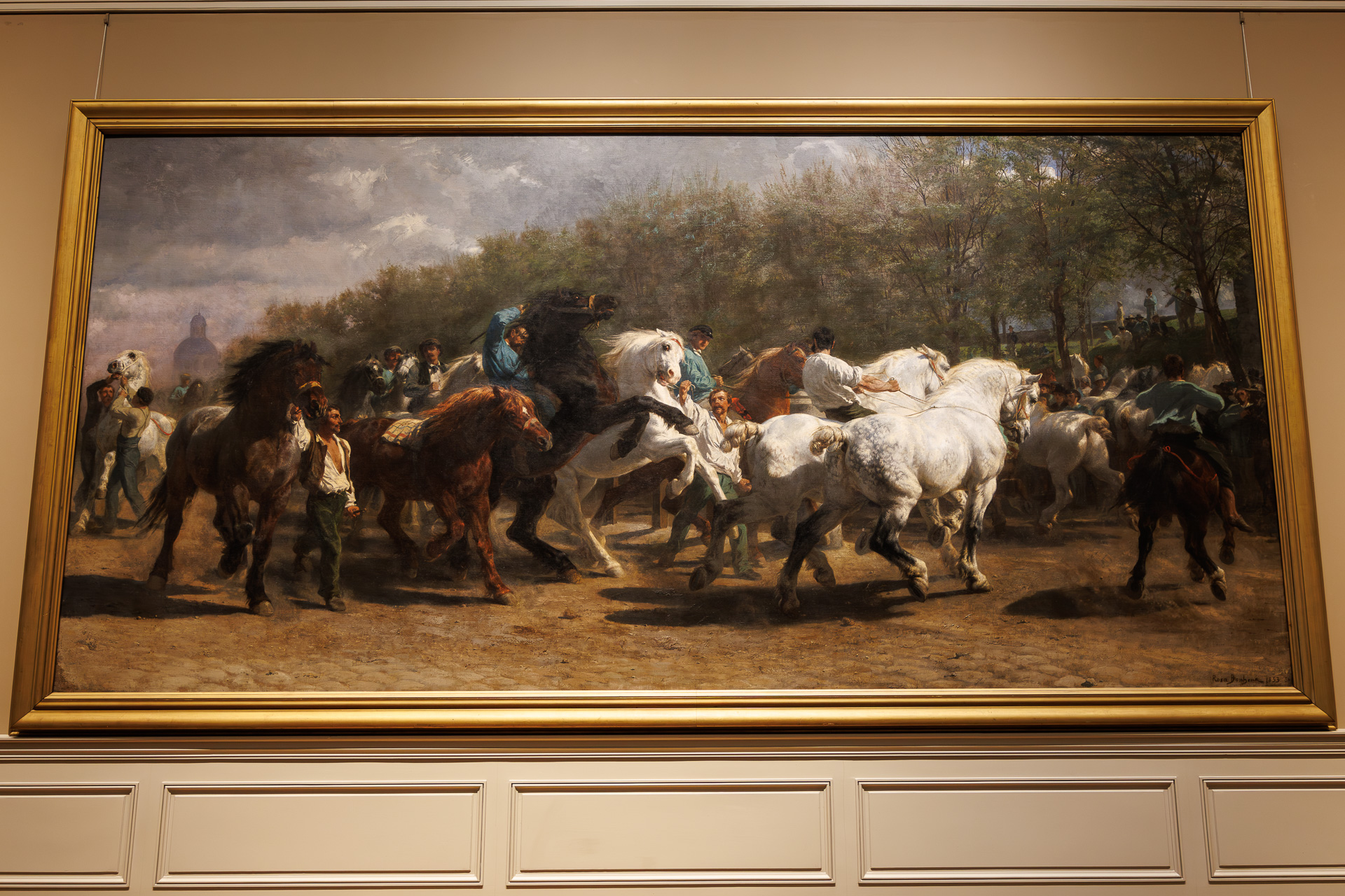 Une fresque de Rosa Bonheur (1822-1899), « La foire aux chevaux » réalisée en 1853. Rosa Bonheur est une peintre et sculptrice française, spécialisée dans la représentation animalière. Adulée, décorée, elle connut une renommée incomparable. Elle est l’une des rares femmes artistes dont les œuvres furent célébrées en Amérique et en France de son vivant.