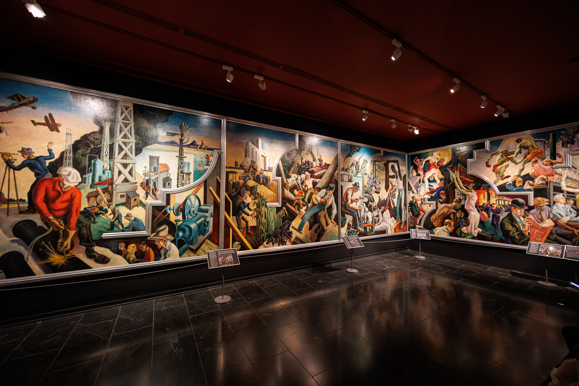 Une fresque très colorée de Thomas Hart Benton (1889-1975) réalisée en 1930. C’est un peintre américain connu pour son style fluide et ses toiles représentant des scènes réalistes comme une réponse réactionnaire au modernisme dont il s’est déclaré l’ennemi.