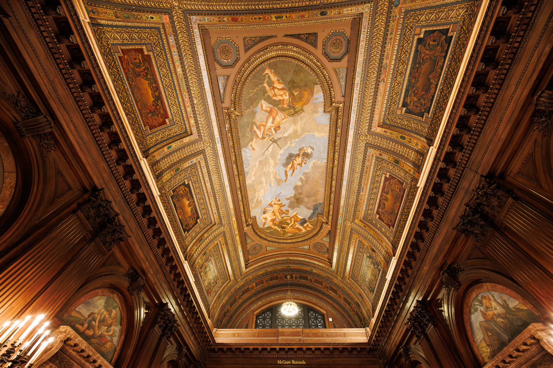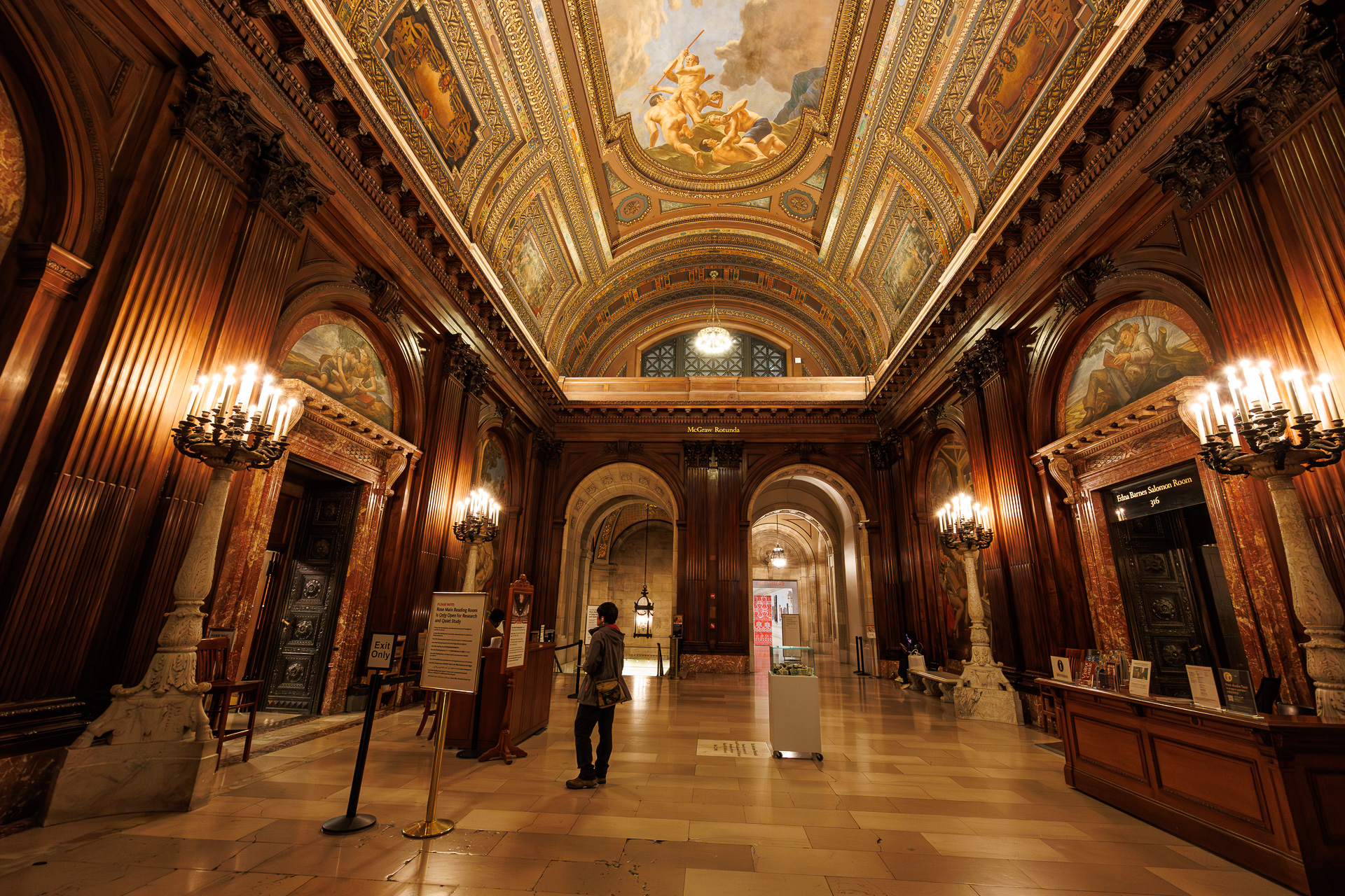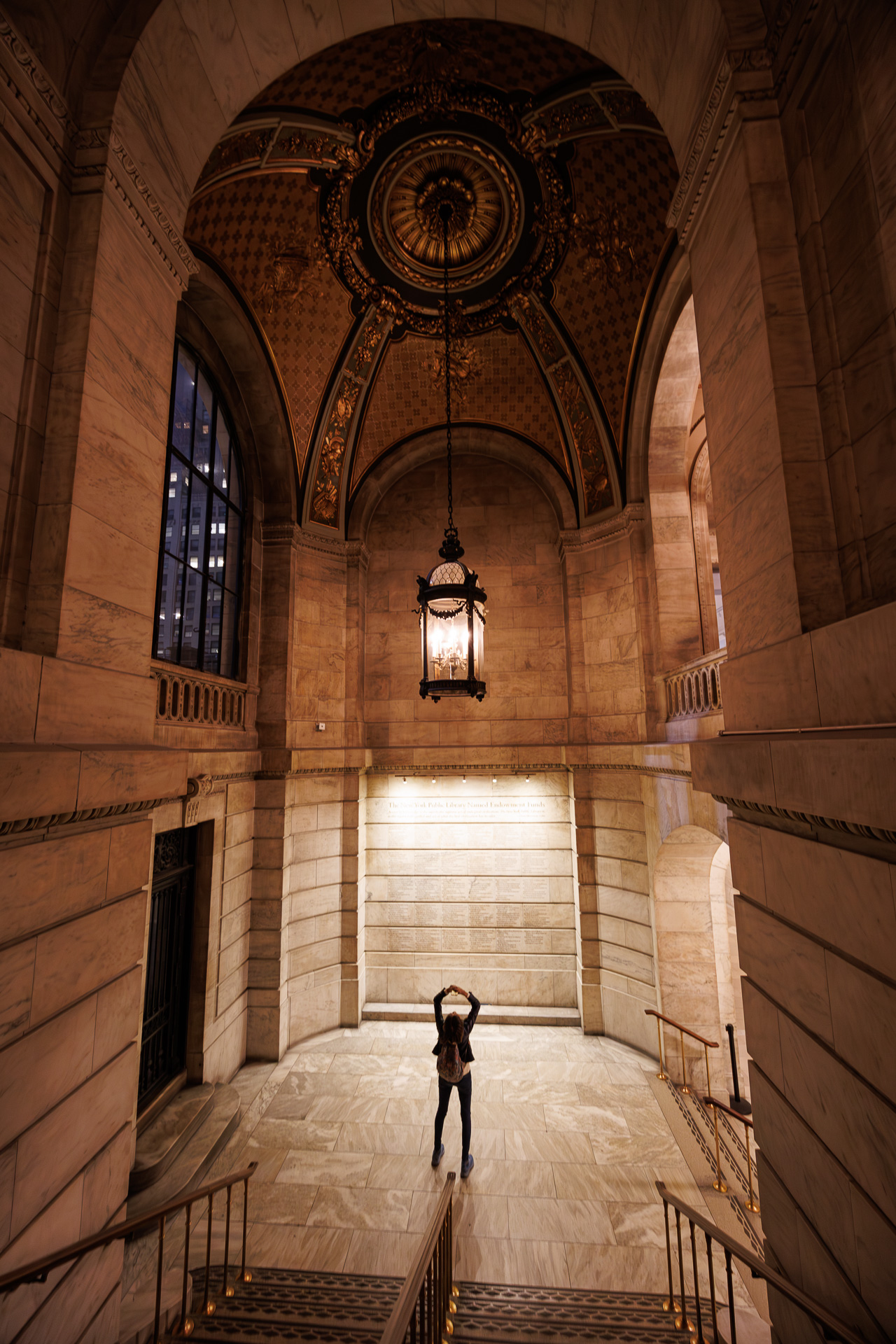 Puis nous passons devant la Bibliothèque Publique de New-York. Avec près de 53 millions de documents, c’est la deuxième plus grande bibliothèque publique des États-Unis, derrière la Bibliothèque du Congrès. Elle est ouverte au public depuis 1911. Elle possède une très jolie salle de lecture « The Rose Main Reading Room », une des plus grandes salles de lecture des Etats-Unis avec un plafond ininterrompu ce qui est une caractéristique d’ingénierie remarquable… Malheureusement, il est tard et la salle est dans tous les cas fermée aux visiteurs. Nous pourrons tout de même admirer l’anti-chambre et son magnifique plafond !