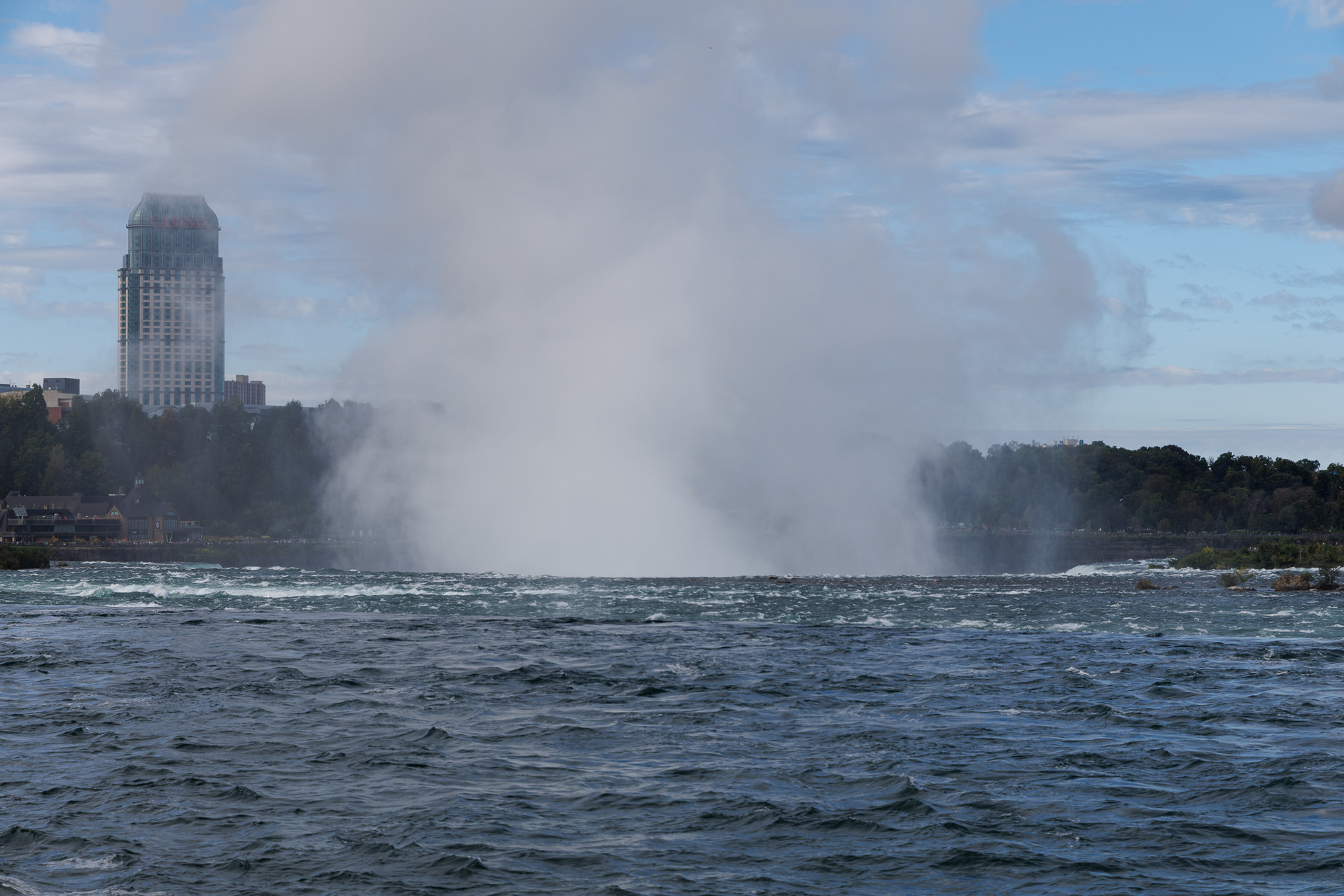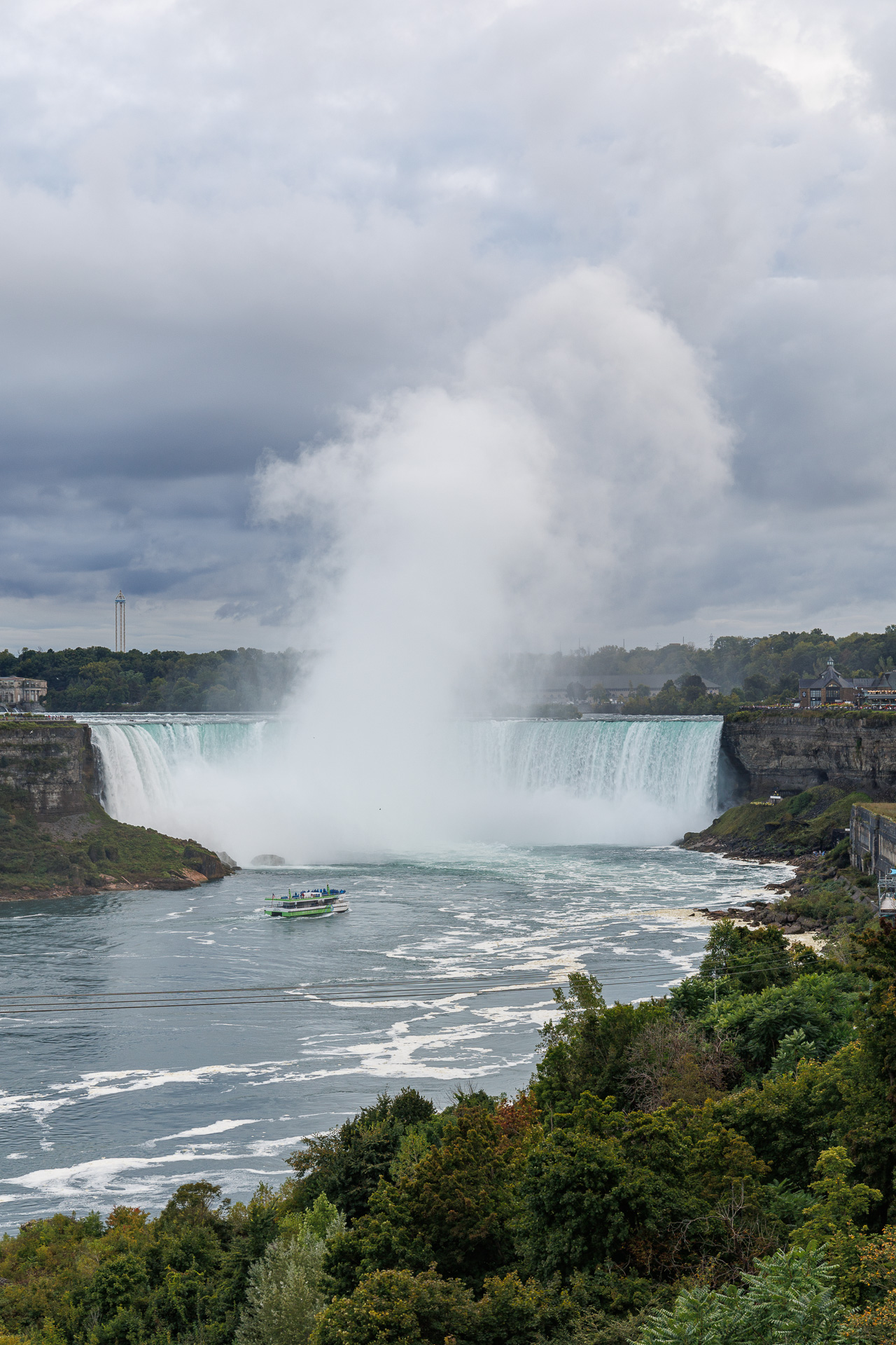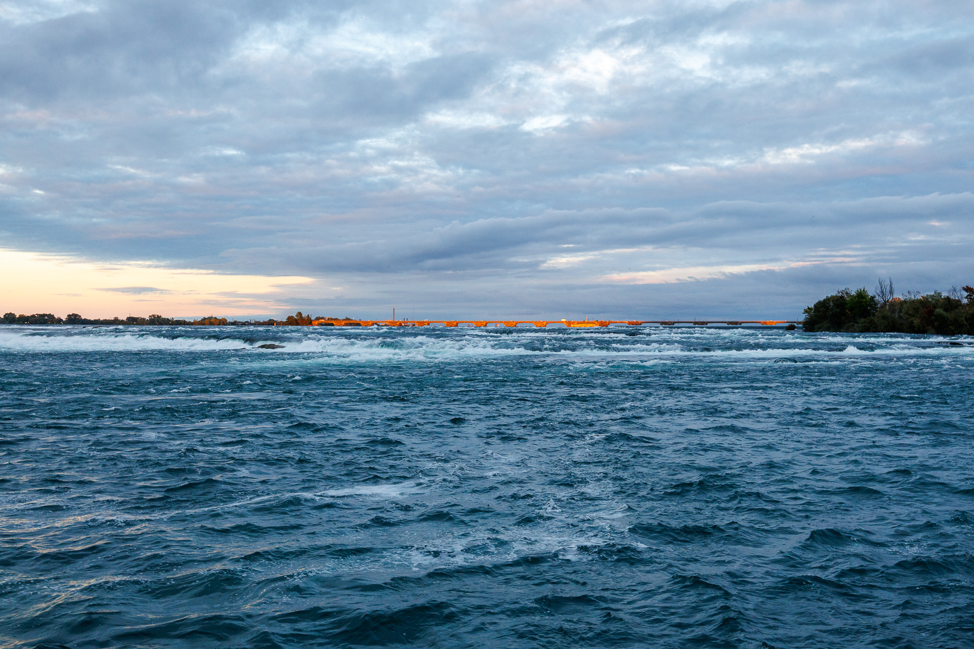 Les chutes américaines font 21 mètres de haut et 323 mètres de large avant que l’eau n’atteigne un amas de roches brisées provenant d’un énorme rocher tombé en 1954. Nous irons les voir de plus près, d’ici quelques jours, lorsque nous passerons aux États-Unis.