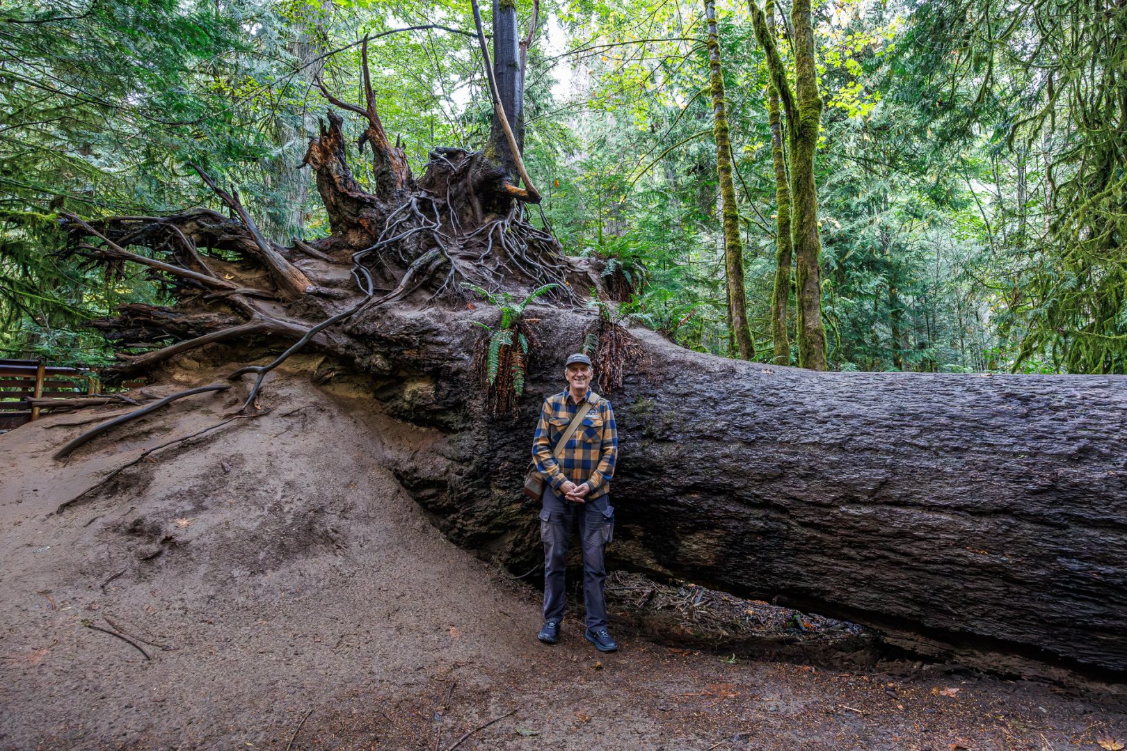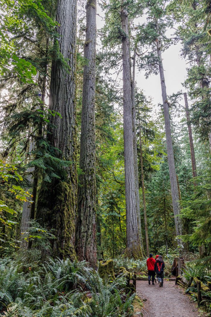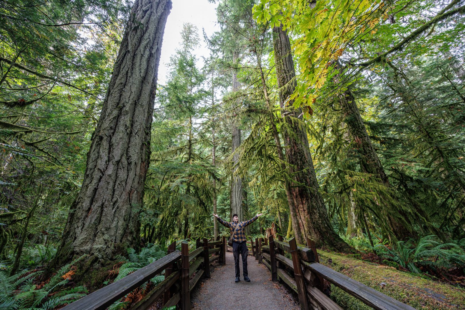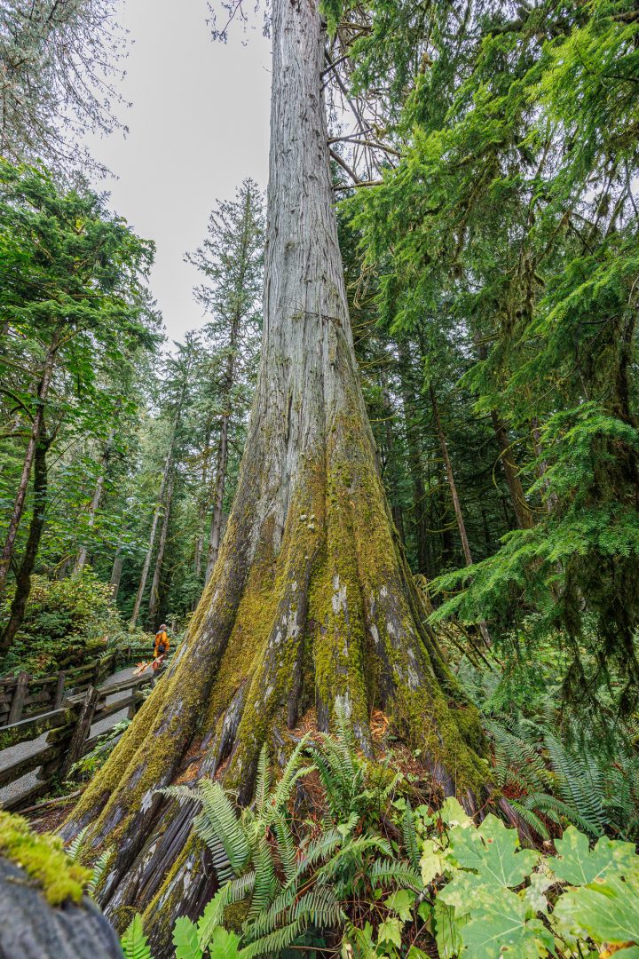 Cathedral Grove se trouve dans le parc provincial MacMillan. Sur 157 hectares, Cathedral Grove abrite un célèbre peuplement de sapins de Douglas (du nom du célèbre botaniste écossais David Douglas (1799-1834)), des cèdres rouges de l’Ouest (ou thuya géant) et des érables à grandes feuilles. Nous sommes accueillis par un cèdre rouge de l’Ouest… Impressionnant 😲 !