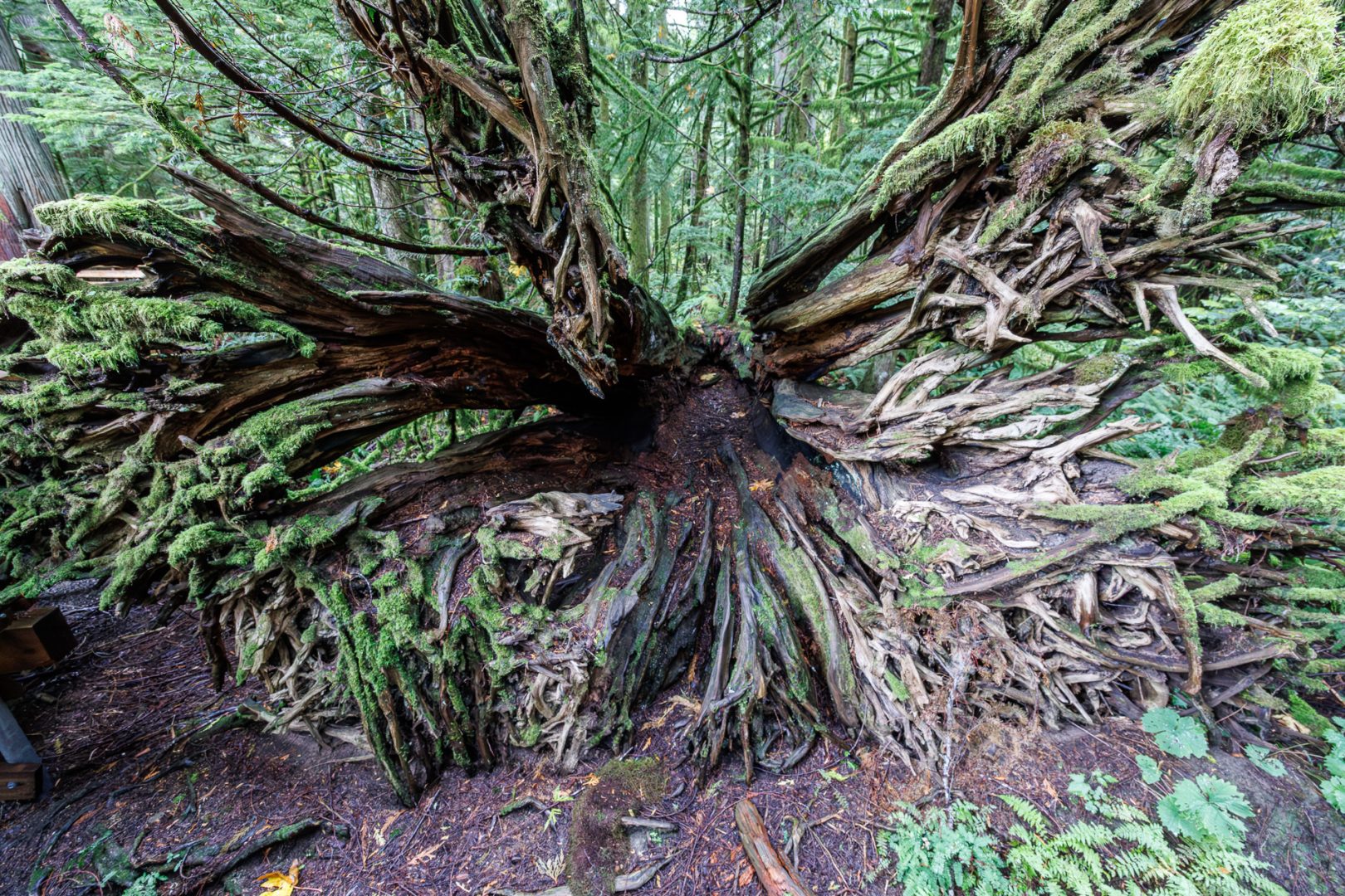 Nous partons à la découverte de cette immense forêt. Ici les restes d’une souche d’un arbre couché.