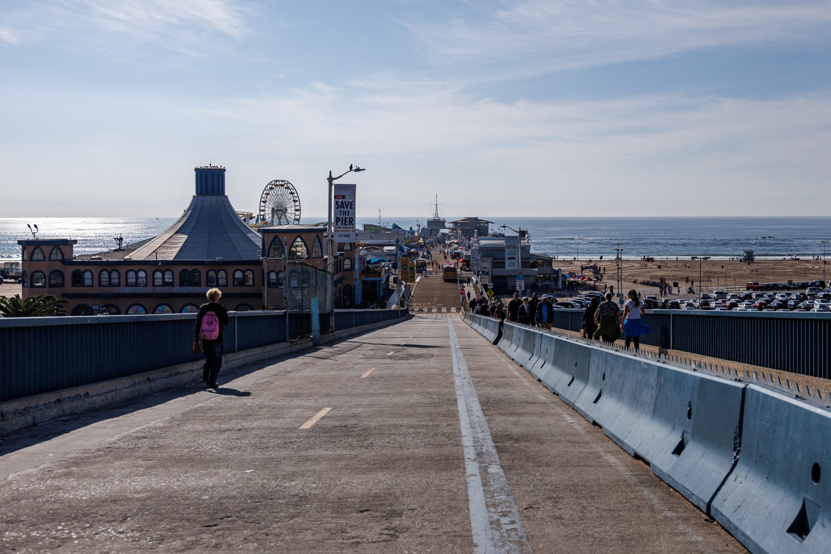 La jetée abrite Pacific Park, un parc d’attractions avec, entre autres, une grande roue et des montagnes russes.