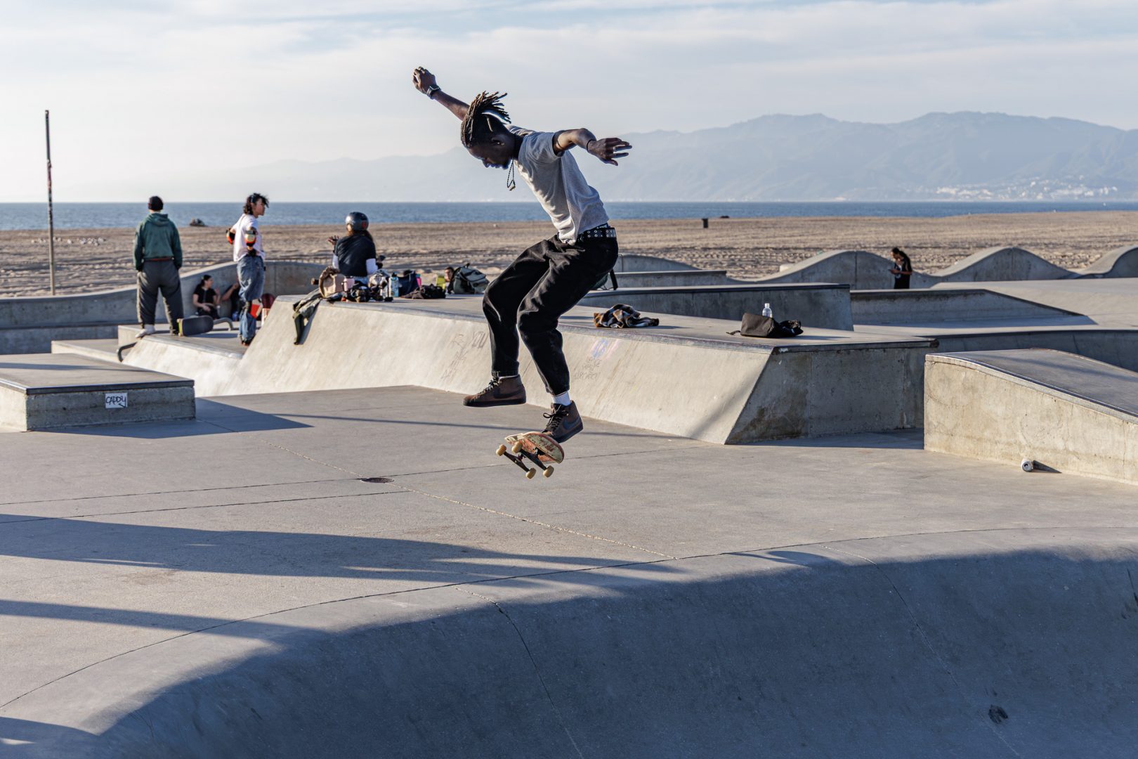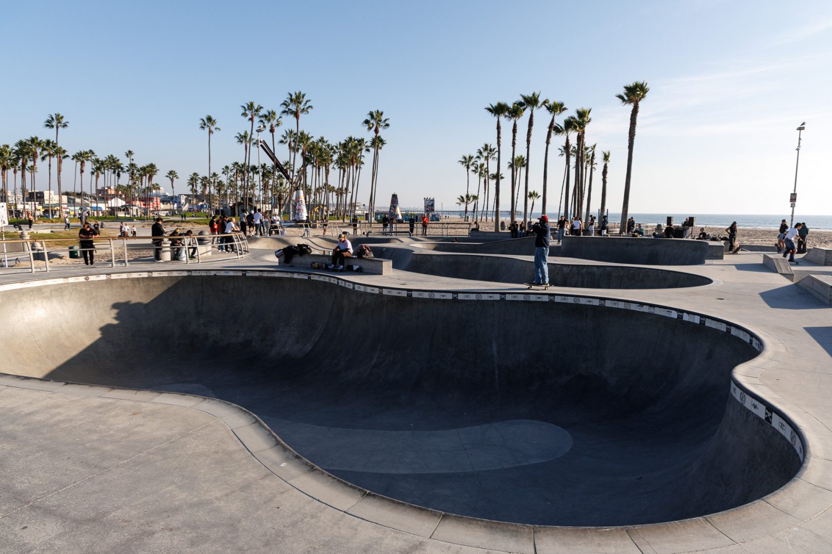 Après cette apparition musclée 💪, nous allons faire un tour au skate park. Le Venice Beach Skatepark a ouvert ses portes fin 2009. Ce skate park d’une superficie de 1486 m2 🫢 comporte des marches, des rails et des bols qui ressemblent à des piscines vides. La construction du parc a coûté 3,4 millions de dollars 😲. Un paradis pour les skaters qui rêvent tous de venir, un jour, rider ici. Et on en connaît au moins un 😉 !
