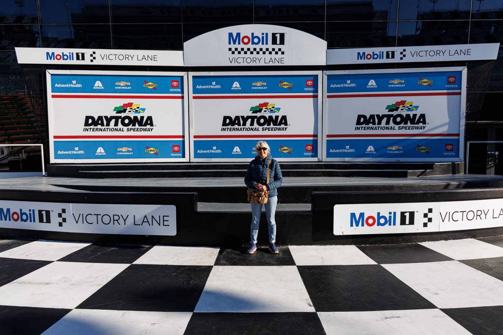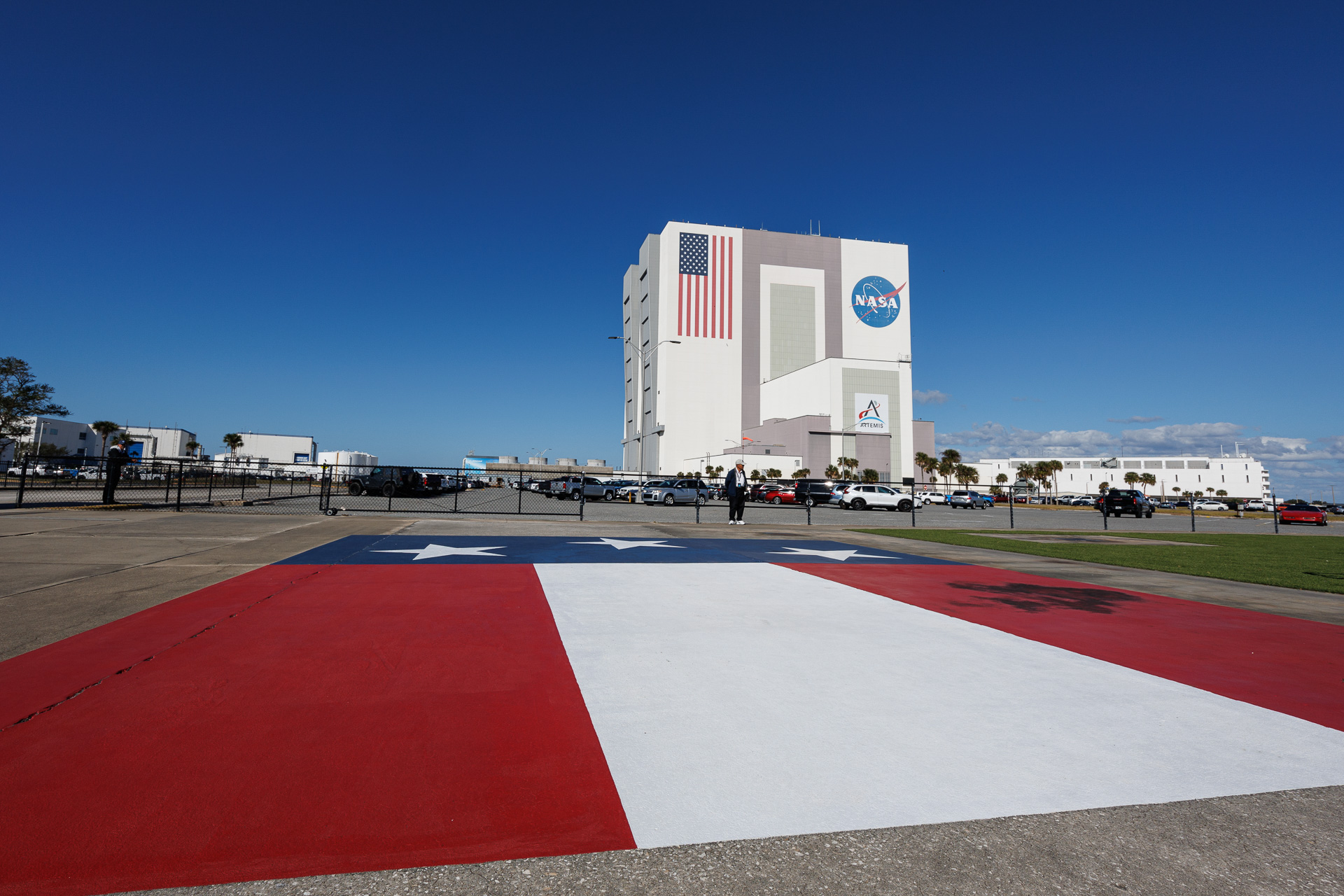 Reproduction au sol d’une petite partie du drapeau américain peint à la même échelle sur la façade du grand bâtiment d’assemblage des véhicules. C’est le plus grand drapeau américain peint au monde 😉.