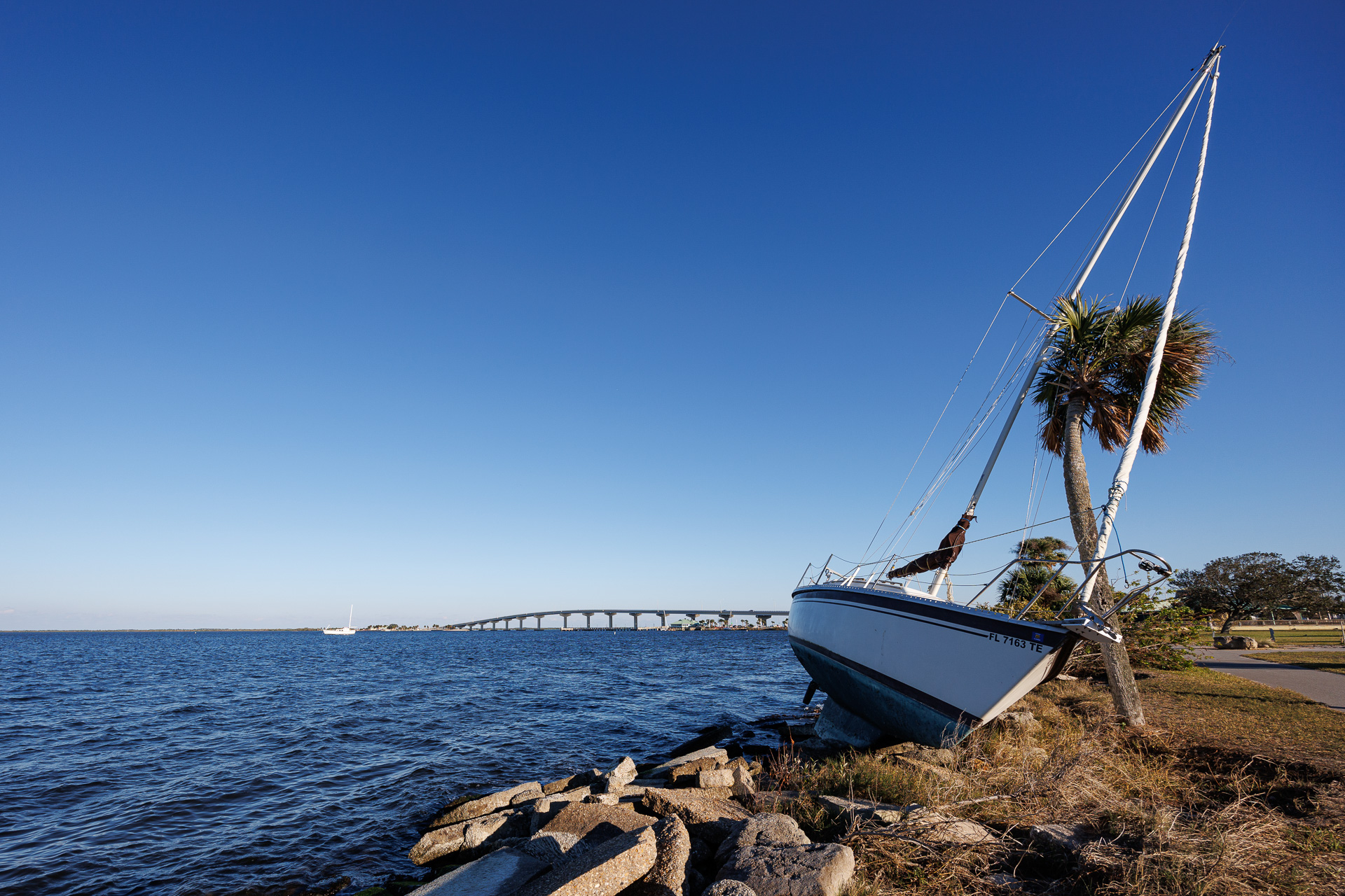 On découvre des bateaux posés bizarrement sur la berge… Ce sont les stigmates de l’ouragan Milton qui a frappé la Floride début octobre.