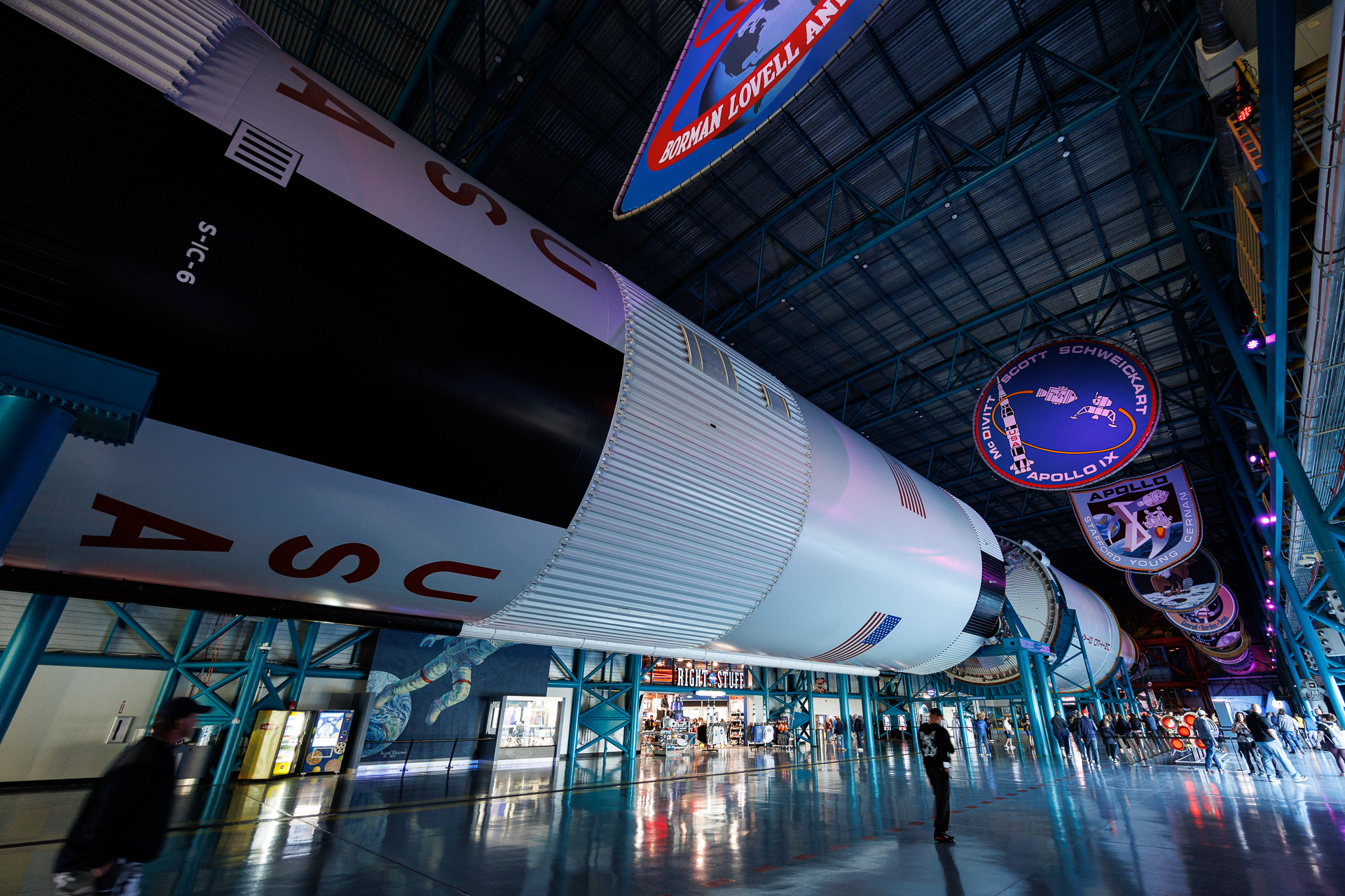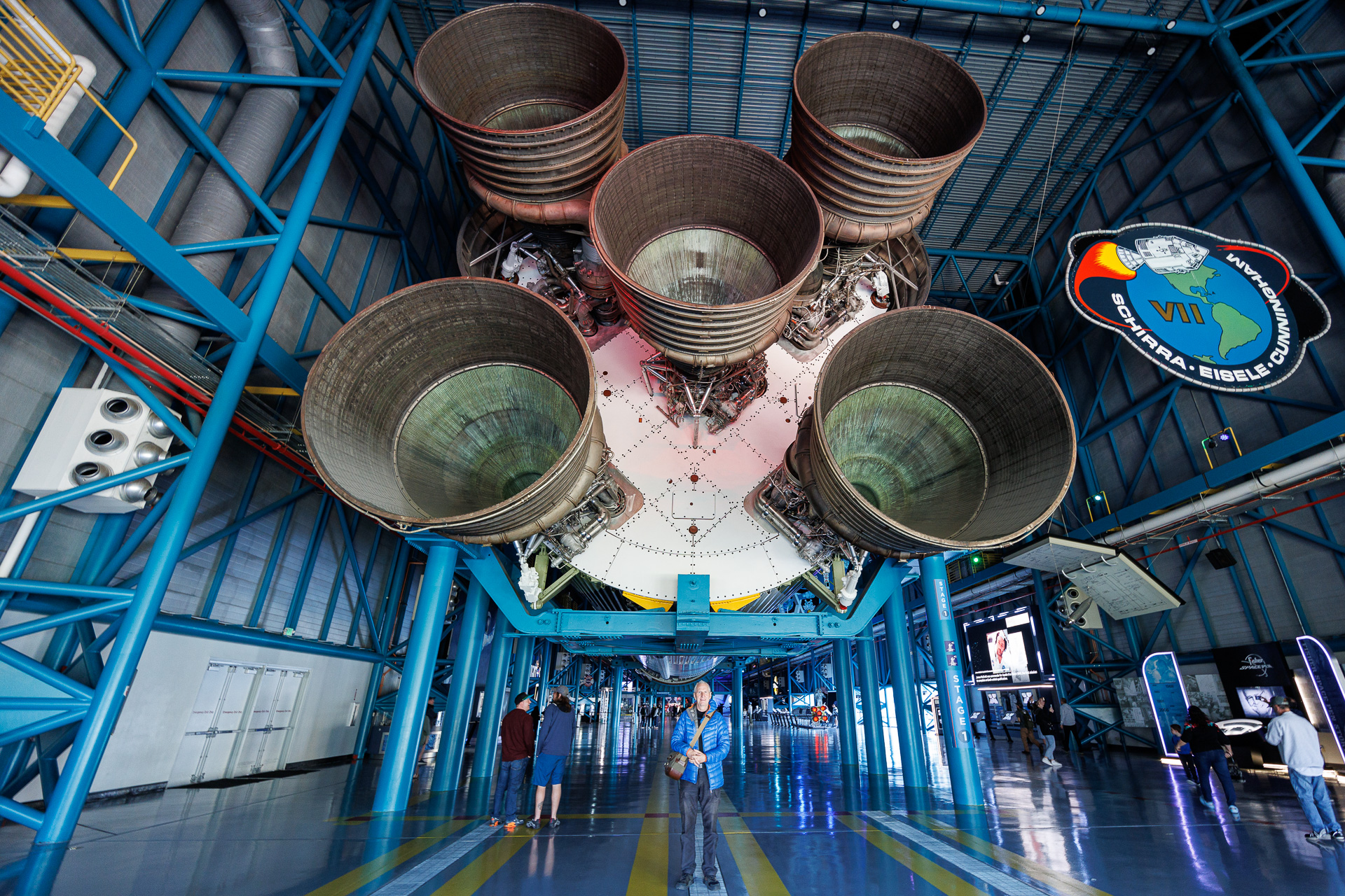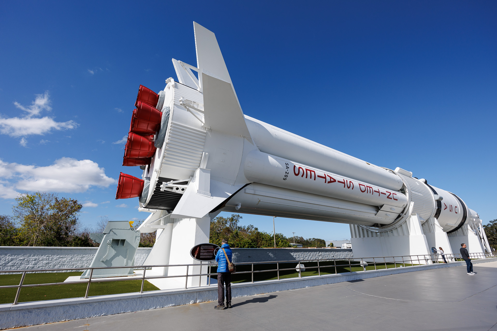 Au pied de la dernière version de la fusée Saturne V. C’est gros, très gros.