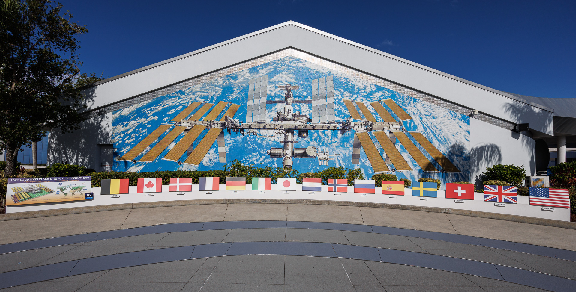 Nous passons devant la fresque représentant la station spatiale internationale (ISS). Au pied figurent les drapeaux de tous les pays qui ont participé et participent encore à cette belle aventure.