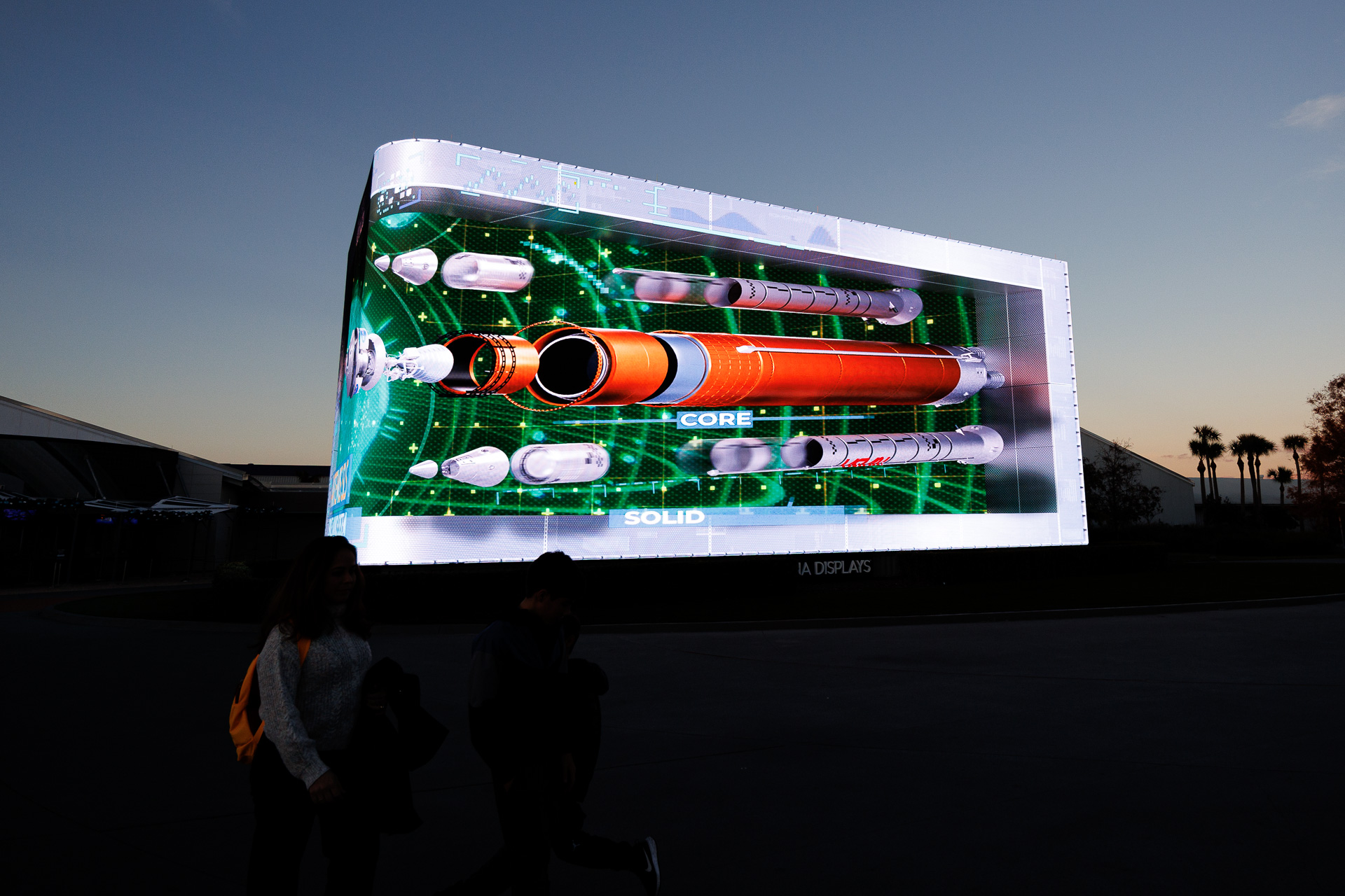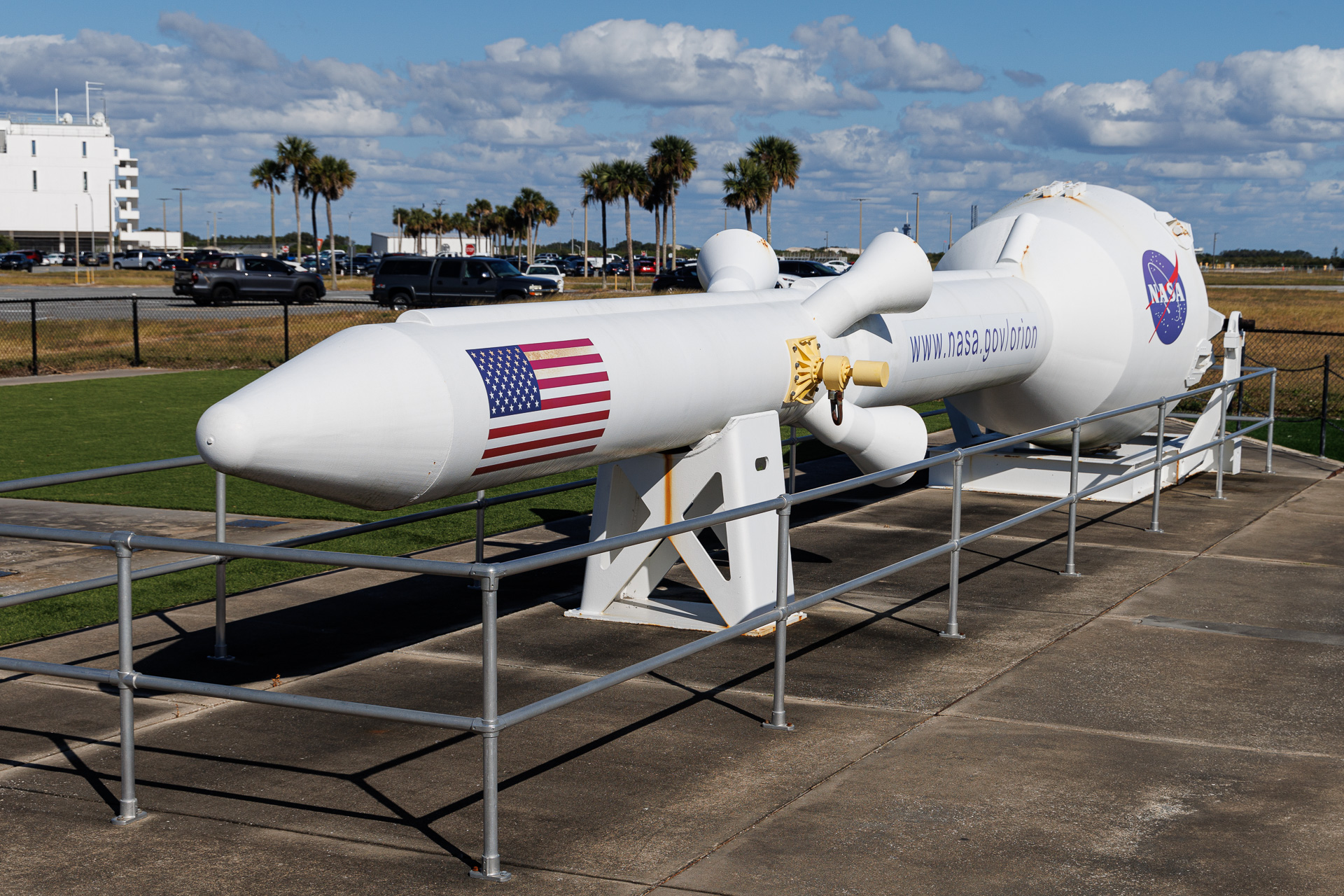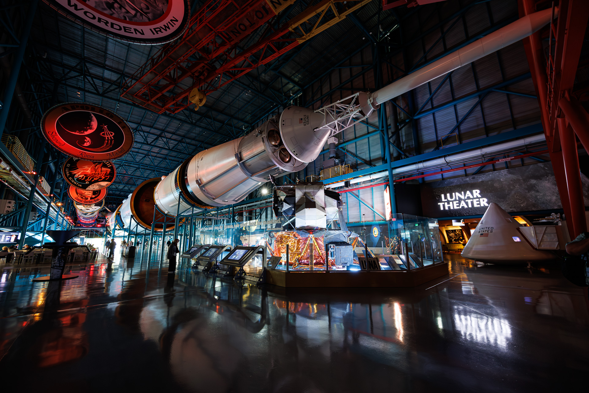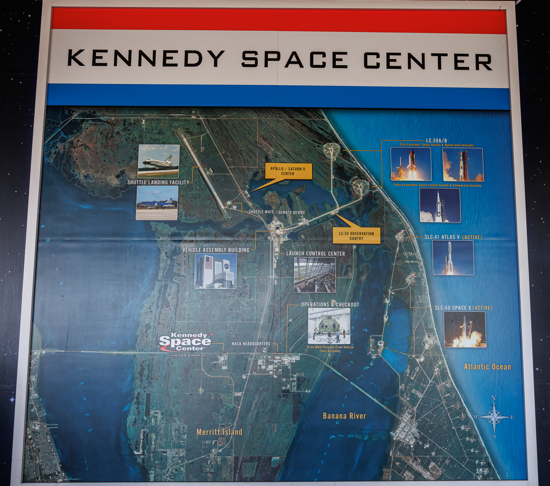 Le Centre spatial Kennedy, officiellement « John F. Kennedy Space Center » est un complexe de lancement spatial créé en 1959 et relevant de la National Aeronautics and Space Administration (NASA). Cape Canaveral « Cape Canaveral Space Force Station » est la base officielle de lancement des fusées. Il s’agit donc de deux structures différentes séparées par la lagune de Banana River. On voit bien la séparation des 2 sites sur le panneau de présentation.