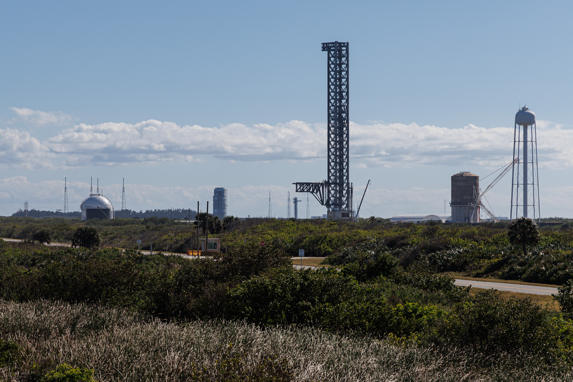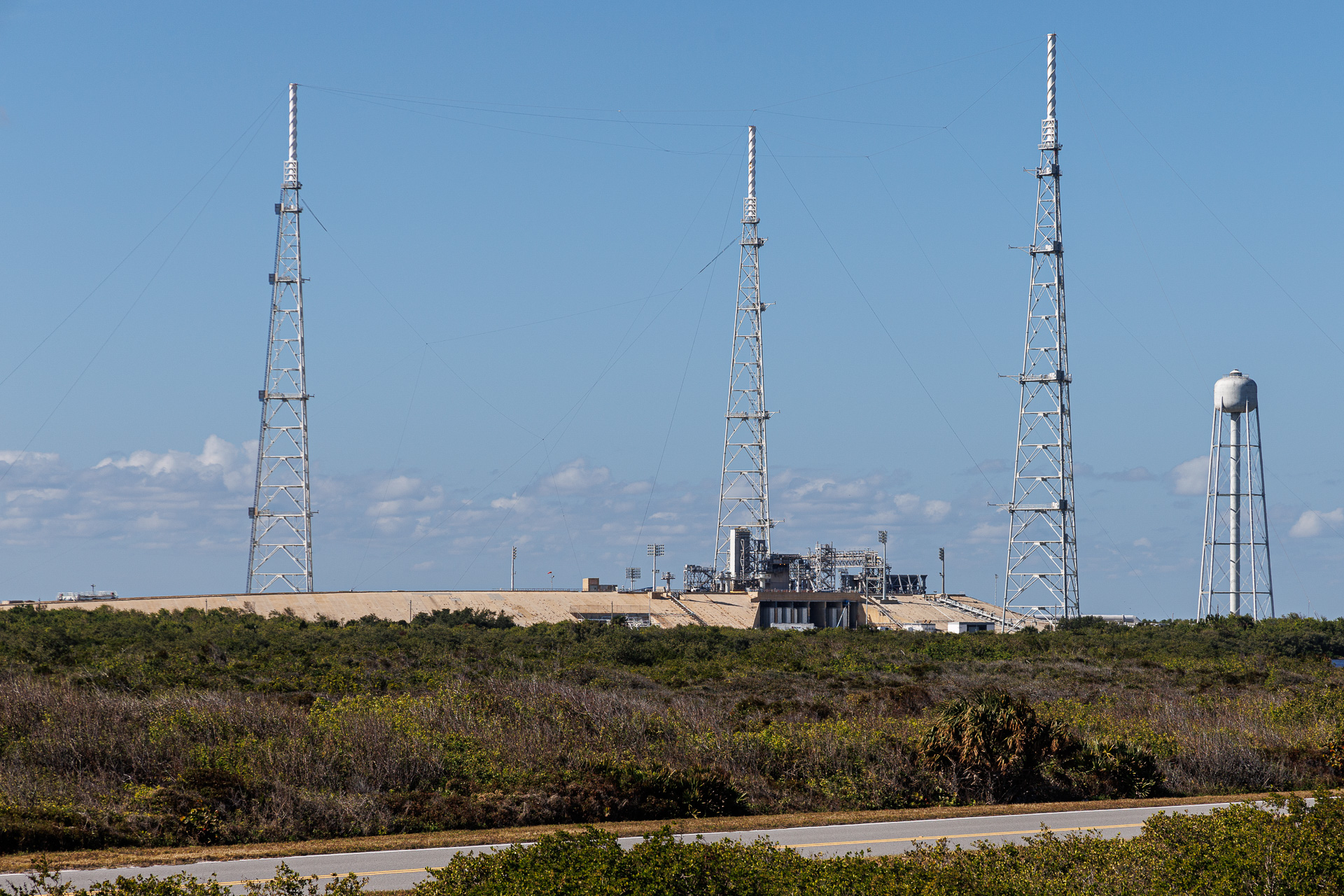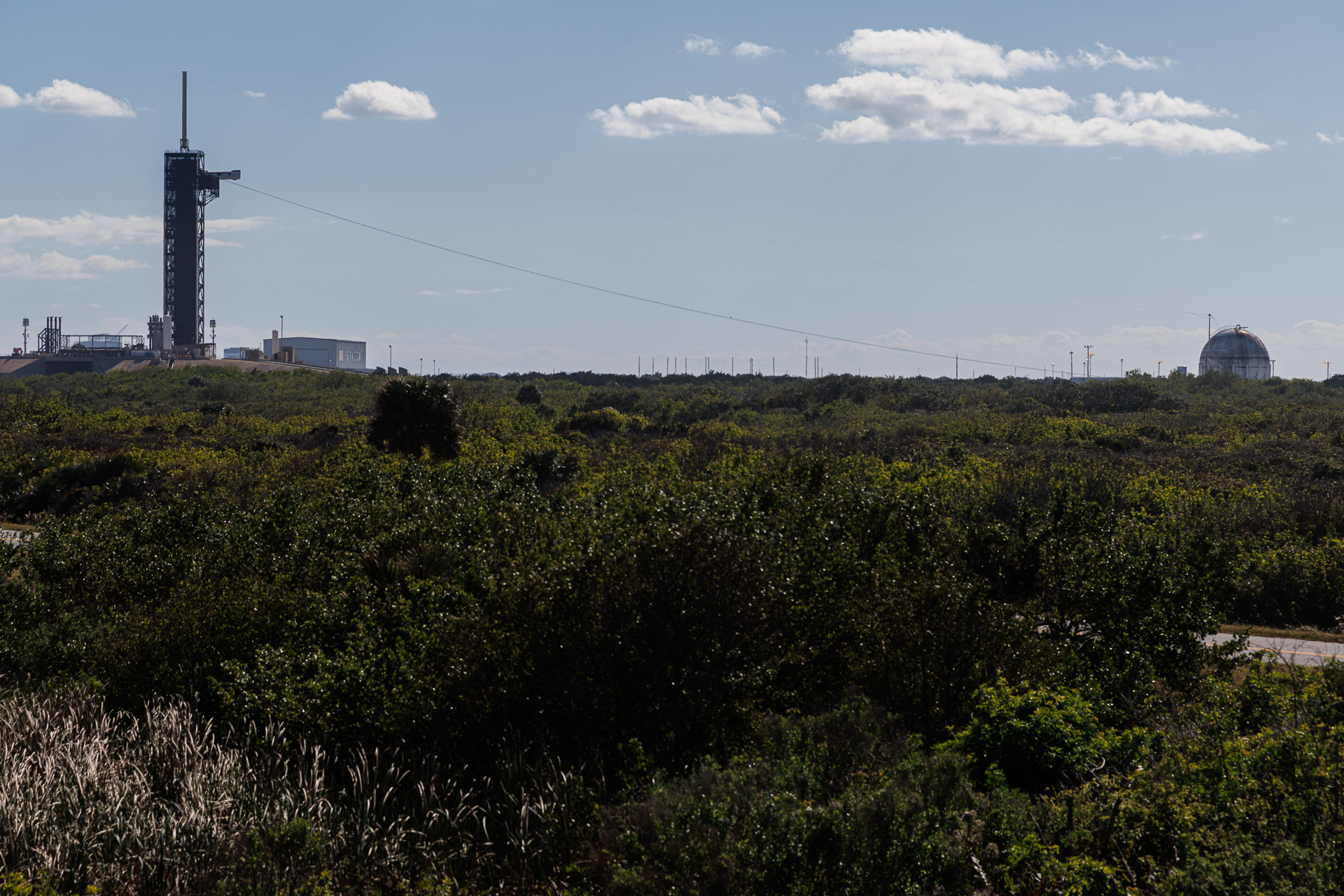 Le câble visible sur la photo du site LC-39A ci-dessous permet une évacuation rapide des astronautes par tyrolienne en cas de gros problème… 😱