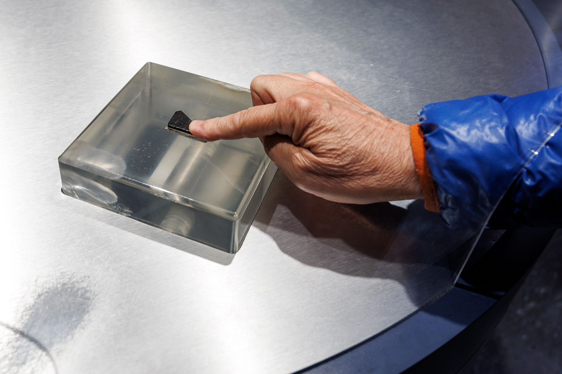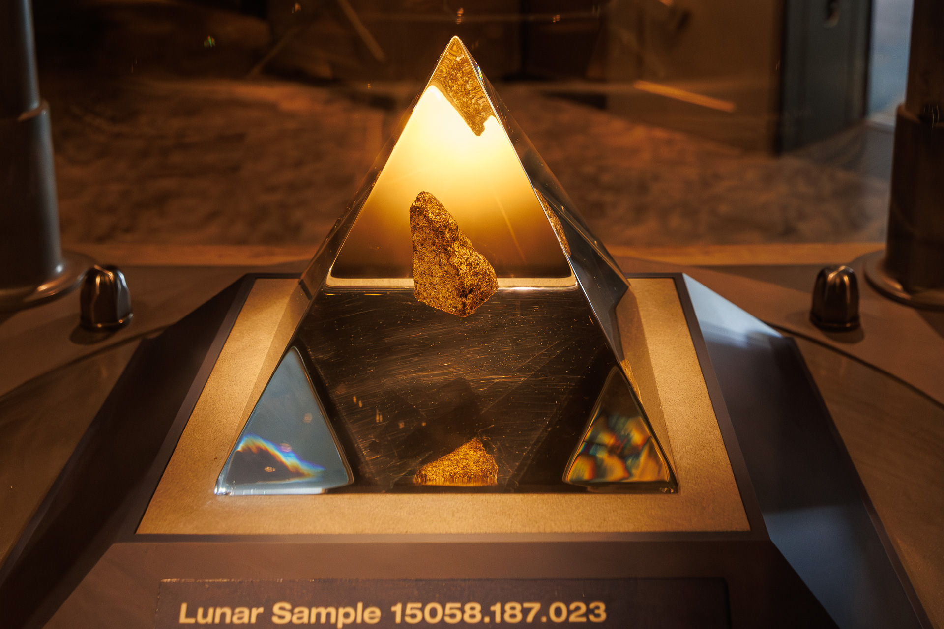 Un petit caillou lunaire de 17 grammes rapporté par l’astronaute Jack Scmitt lors du vol Apollo 17 du 7-19 décembre 1972. Ce fut la dernière mission du programme spatial Apollo à emmener des hommes à la surface de la Lune. Nous avons pu toucher cette pierre lunaire, c’est émouvant lorsque l’on pense à tout ce qui a dû être fait avant ce simple geste…