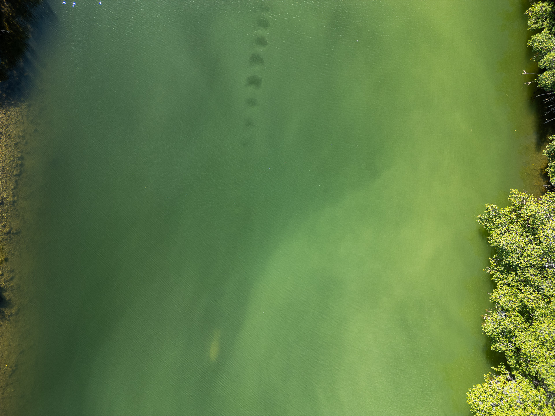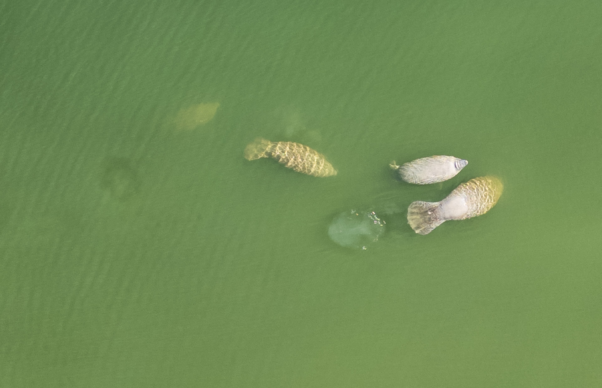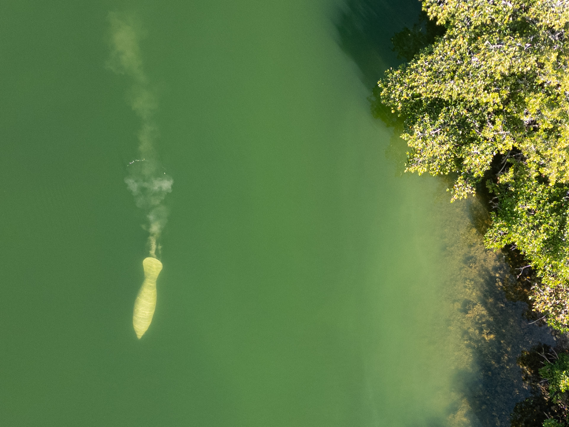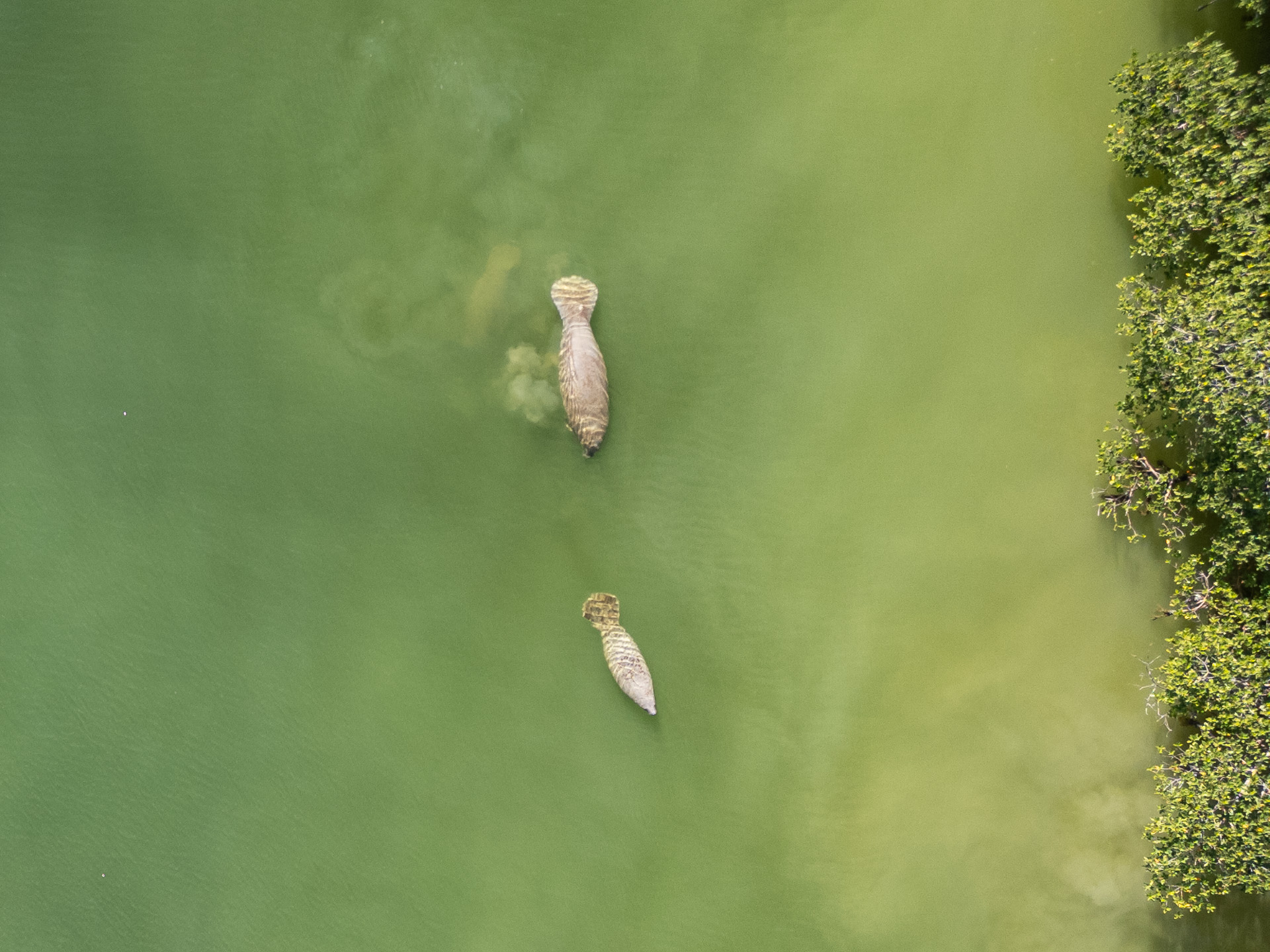 et une petite famille de lamantins en balade ! Vue du ciel, on découvre mieux ces animaux avec leur grosse queue en forme de pagaie arrondie.