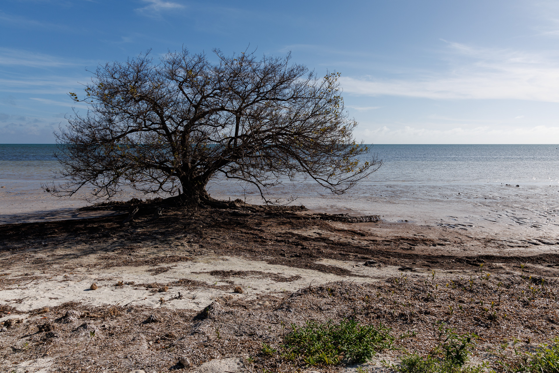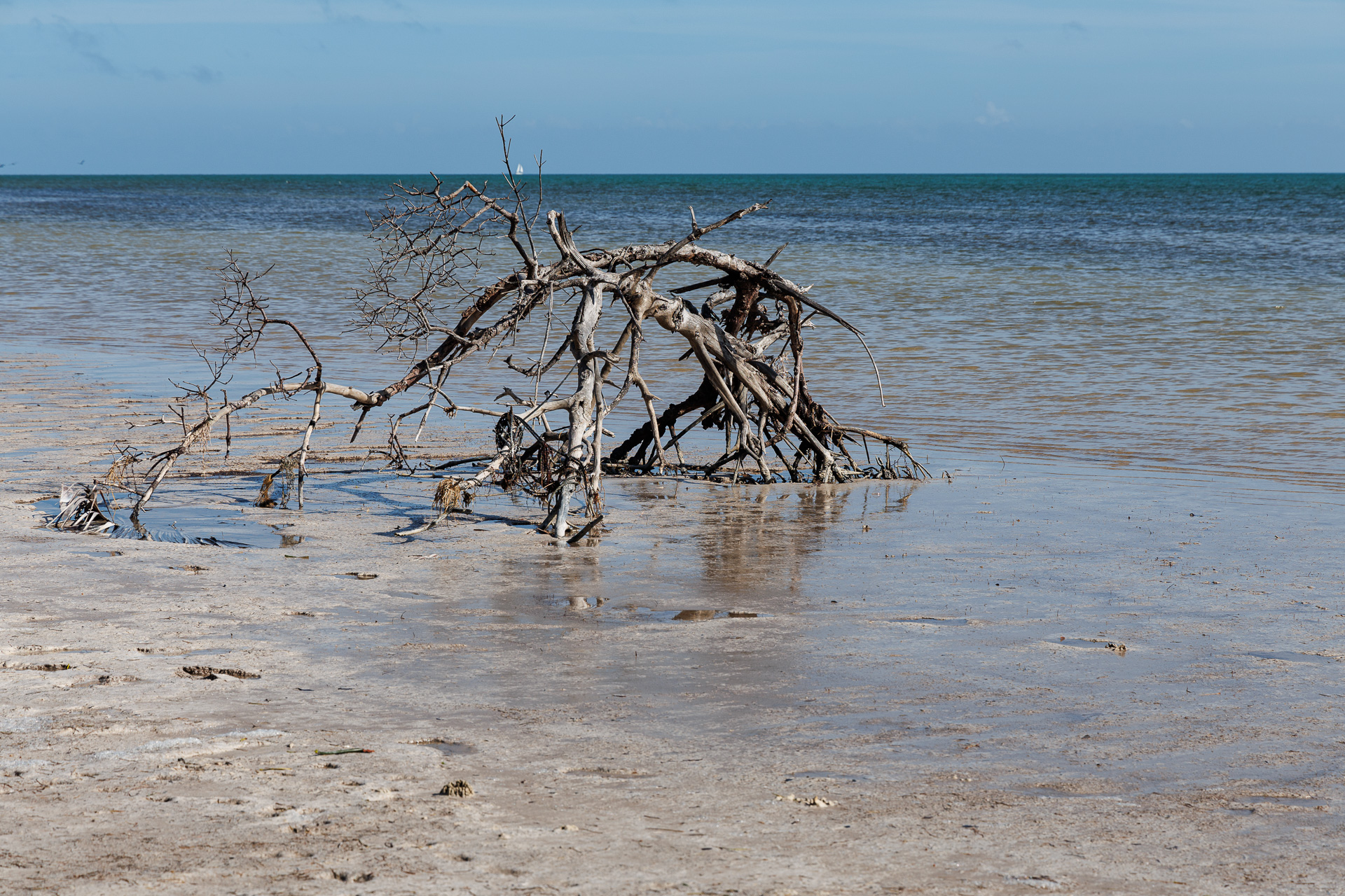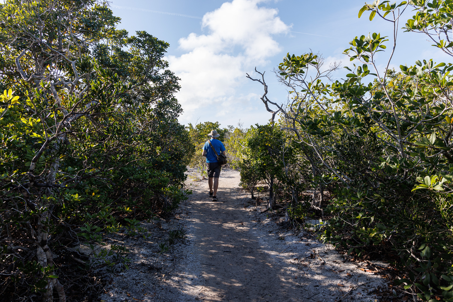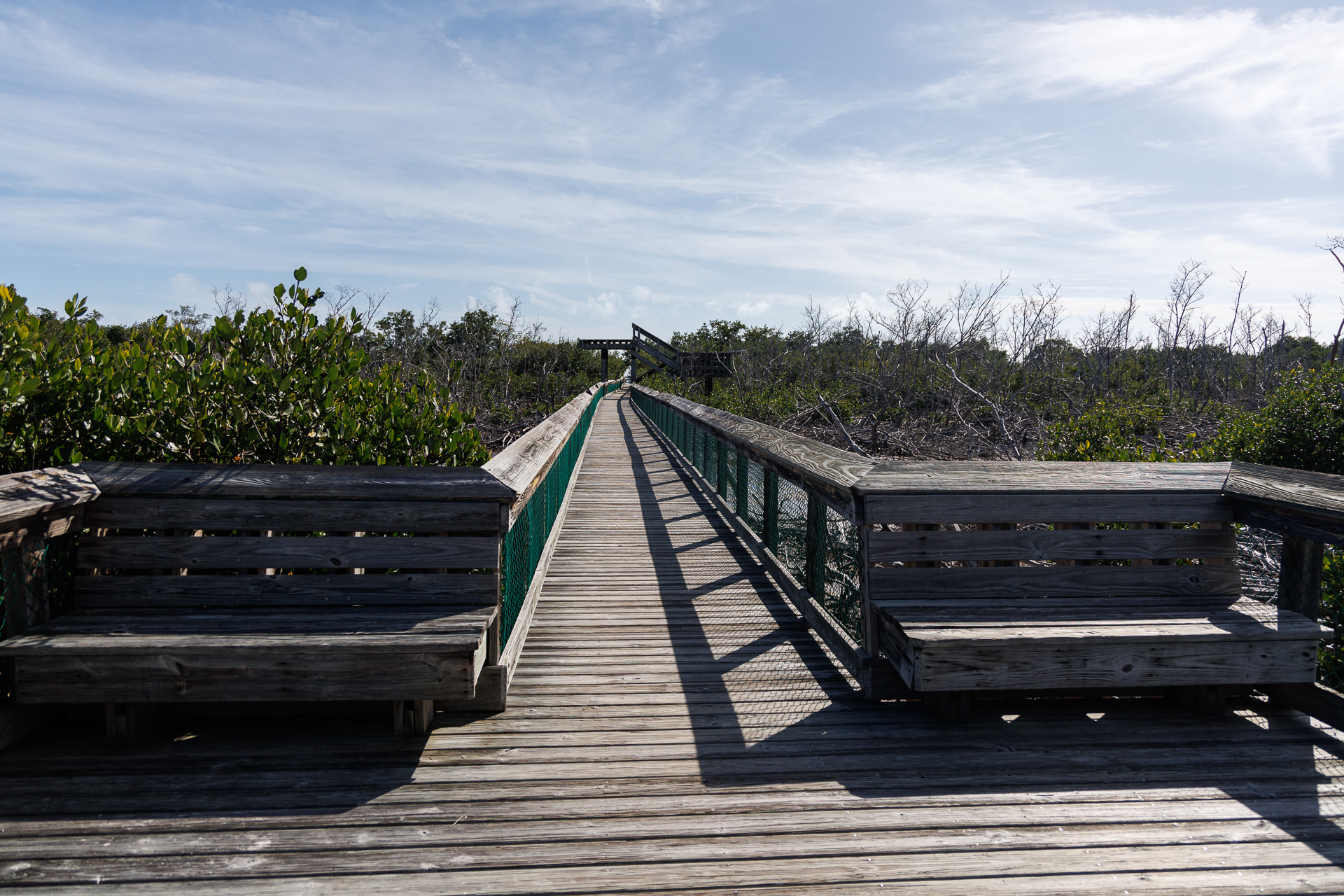 Nous faisons une petite halte au Long Key State Park. Le parc donne une impression d’abandon. Nous apprendrons que l’ouragan Irma en 2017 a fortement impacté le parc. La mangrove intérieure, un élément majeur du parc avec une promenade et une tour d’observation, a été détruite par l’eau salée. Les terrains de camping en bord de mer ont été emportés avec la plage naturelle, tout comme les promenades et les ponts. Cette passerelle rénové nous permet de rejoindre la mer. On aperçoit au loin l’escalier qui permettait d’accéder à la tour d’observation.