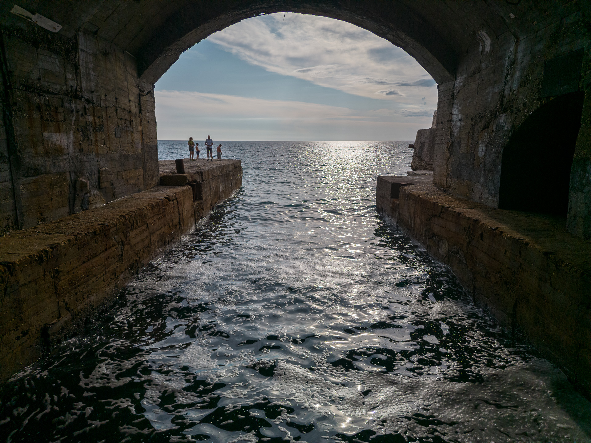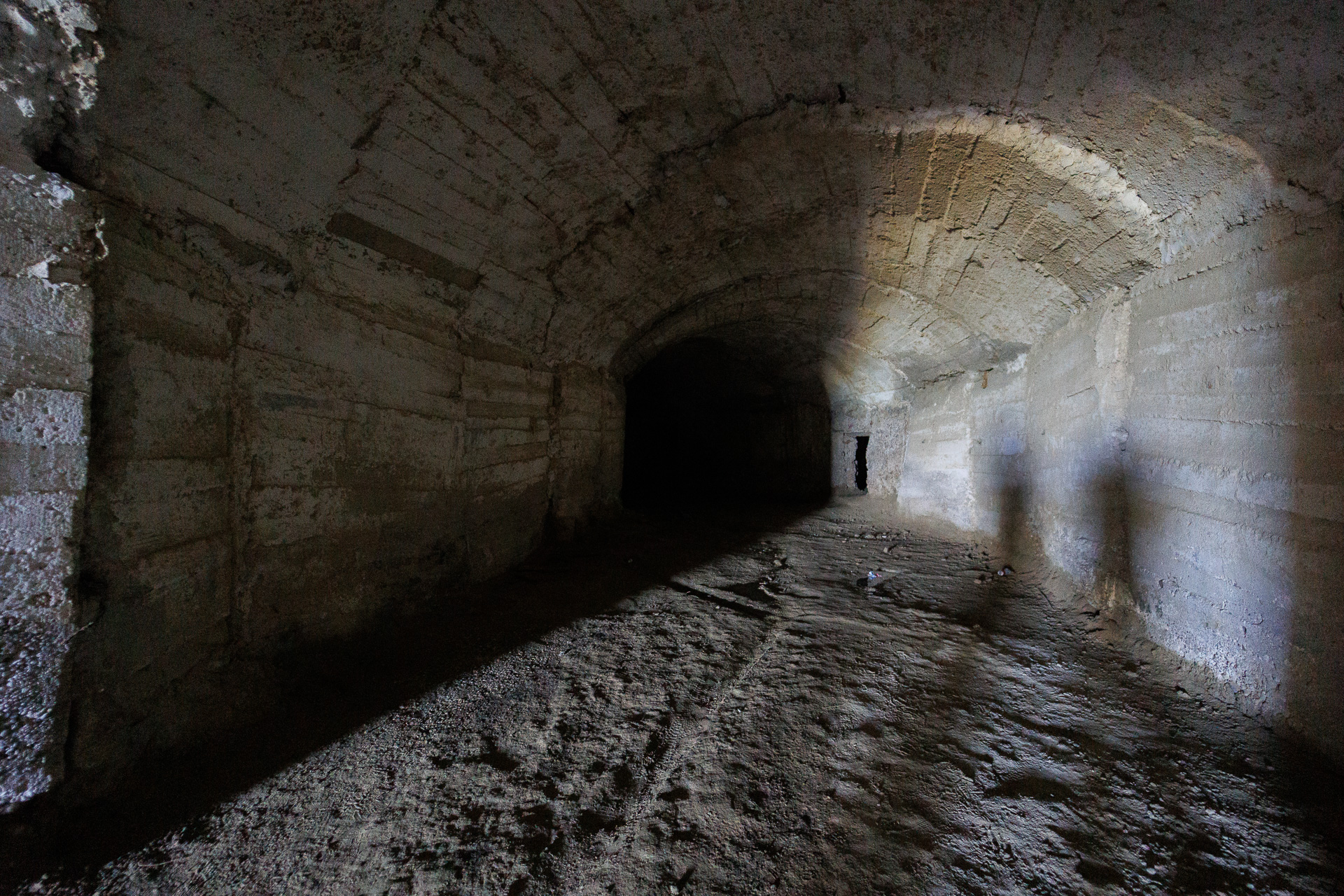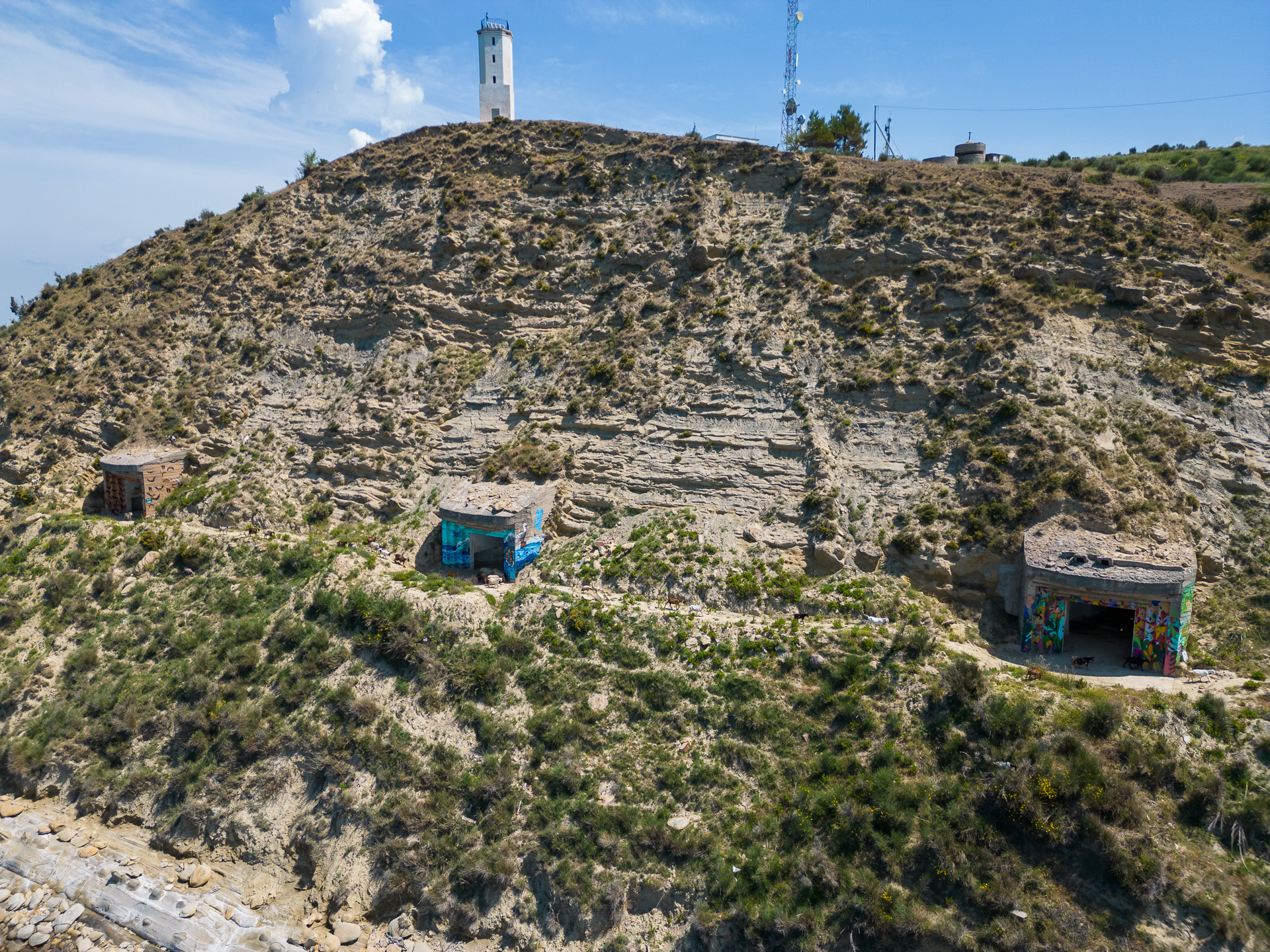 Et voici les 4 ouvertures de notre premier bunker de la journée. Il est aujourd’hui surmonté d’un phare et d’une antenne relais. Nous y entrerons par la bouche la plus à droite et ressortirons de l’autre côté de la colline.