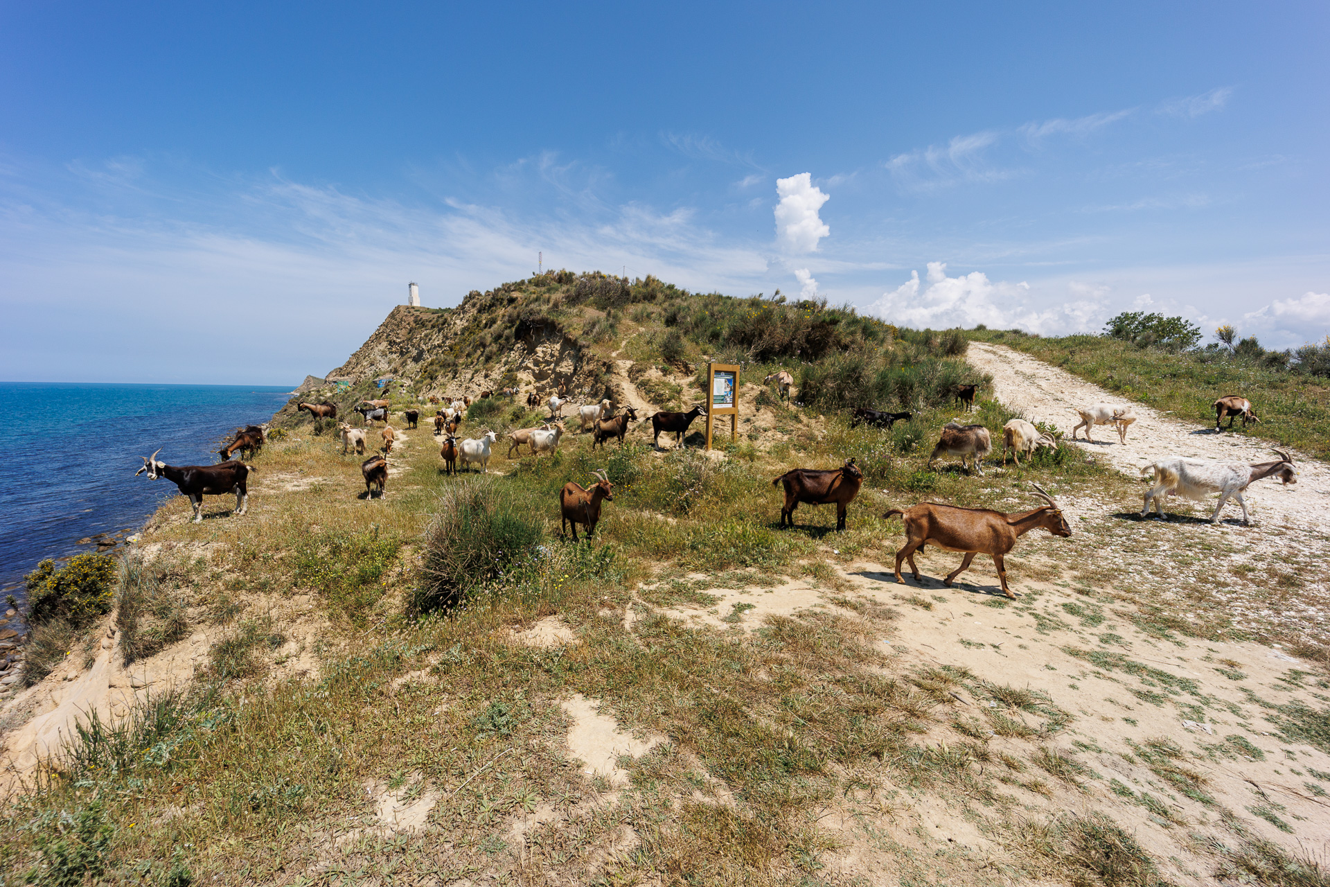 Nous sommes entrés côté mer à gauche et ressortis près des arbres sur la droite. Les chèvres s’occupent de l’entretien local 😊.