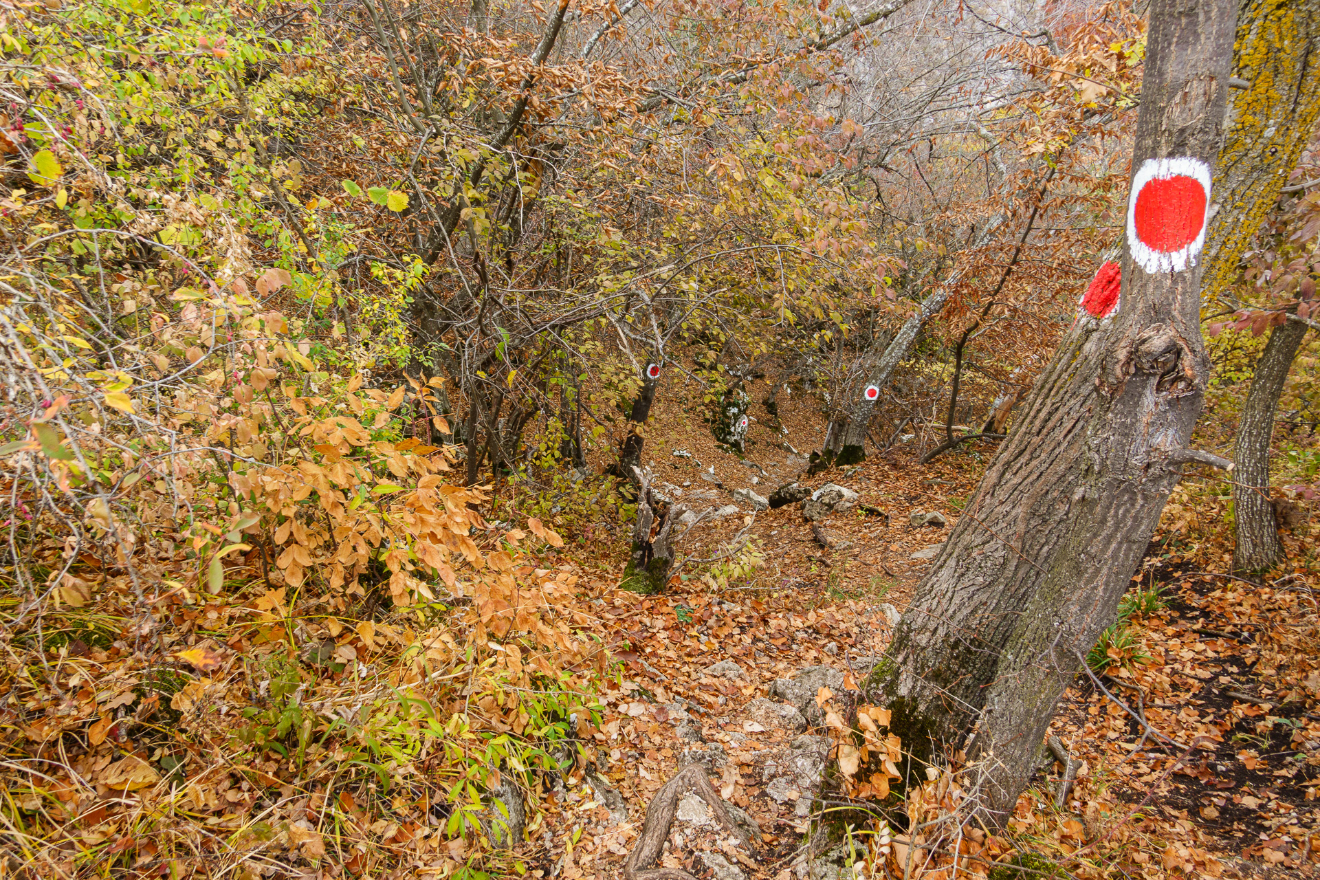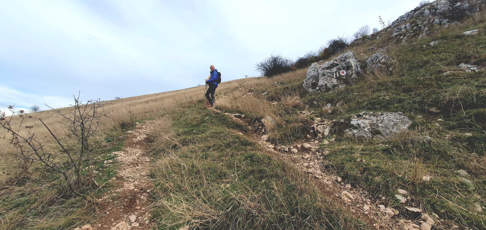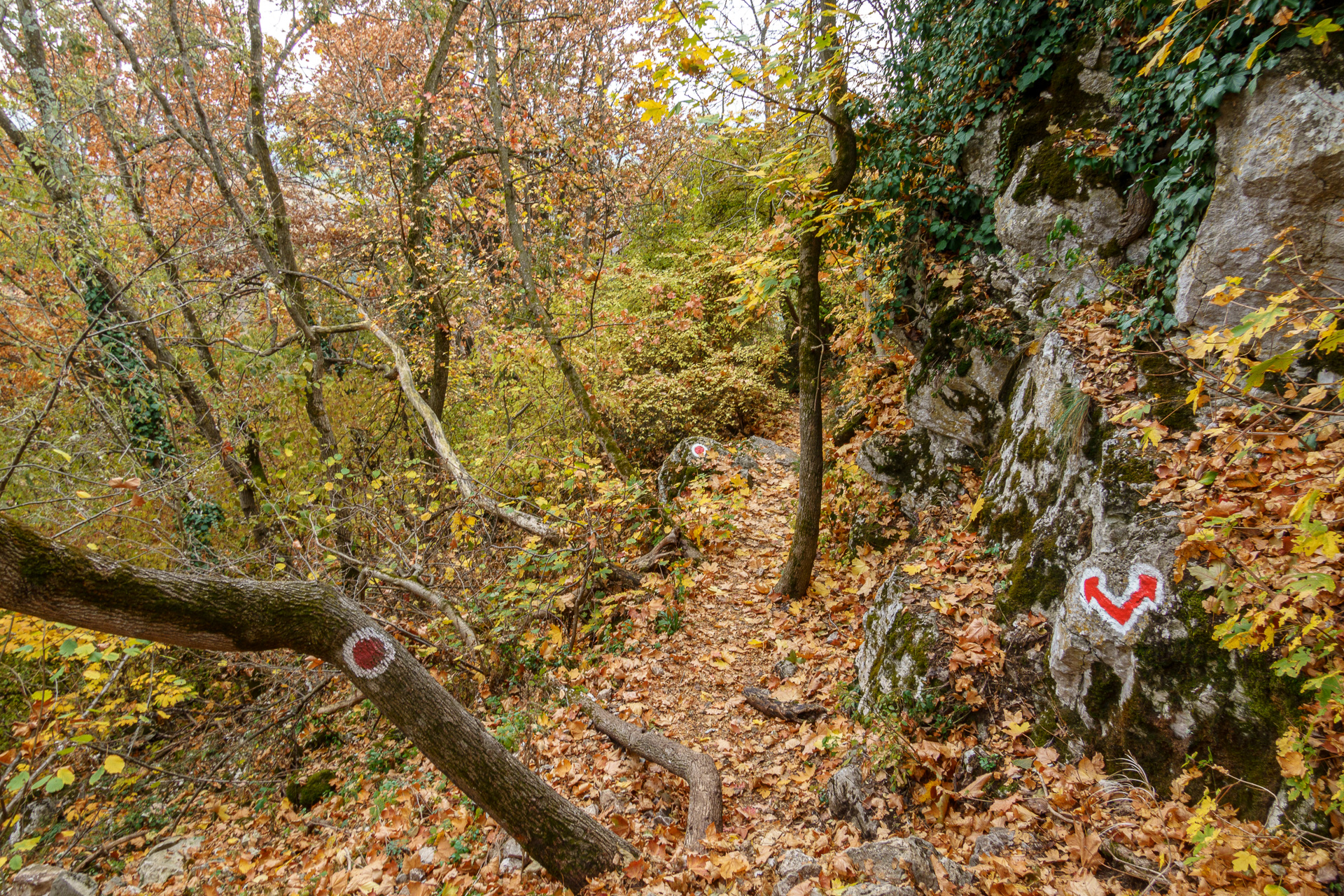 Il nous faut maintenant redescendre. Les gros points rouge et blanc nous indiquent le chemin à suivre. Le balisage est très bien fait et nous ne risquons pas nous perdre… Ouf 😱 !