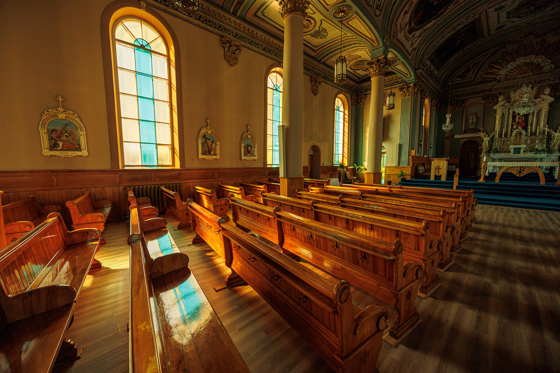 La lumière bleue du vitrail se reflète sur le banc dont le vernis est impeccable 🤩