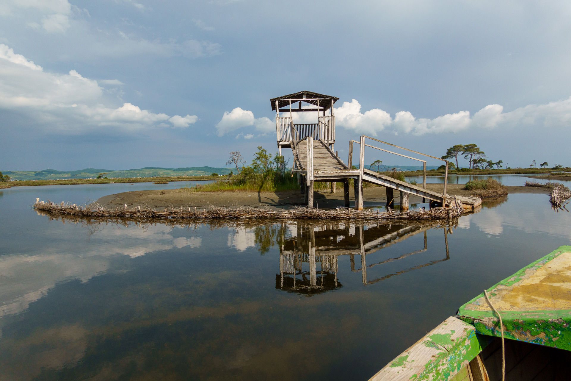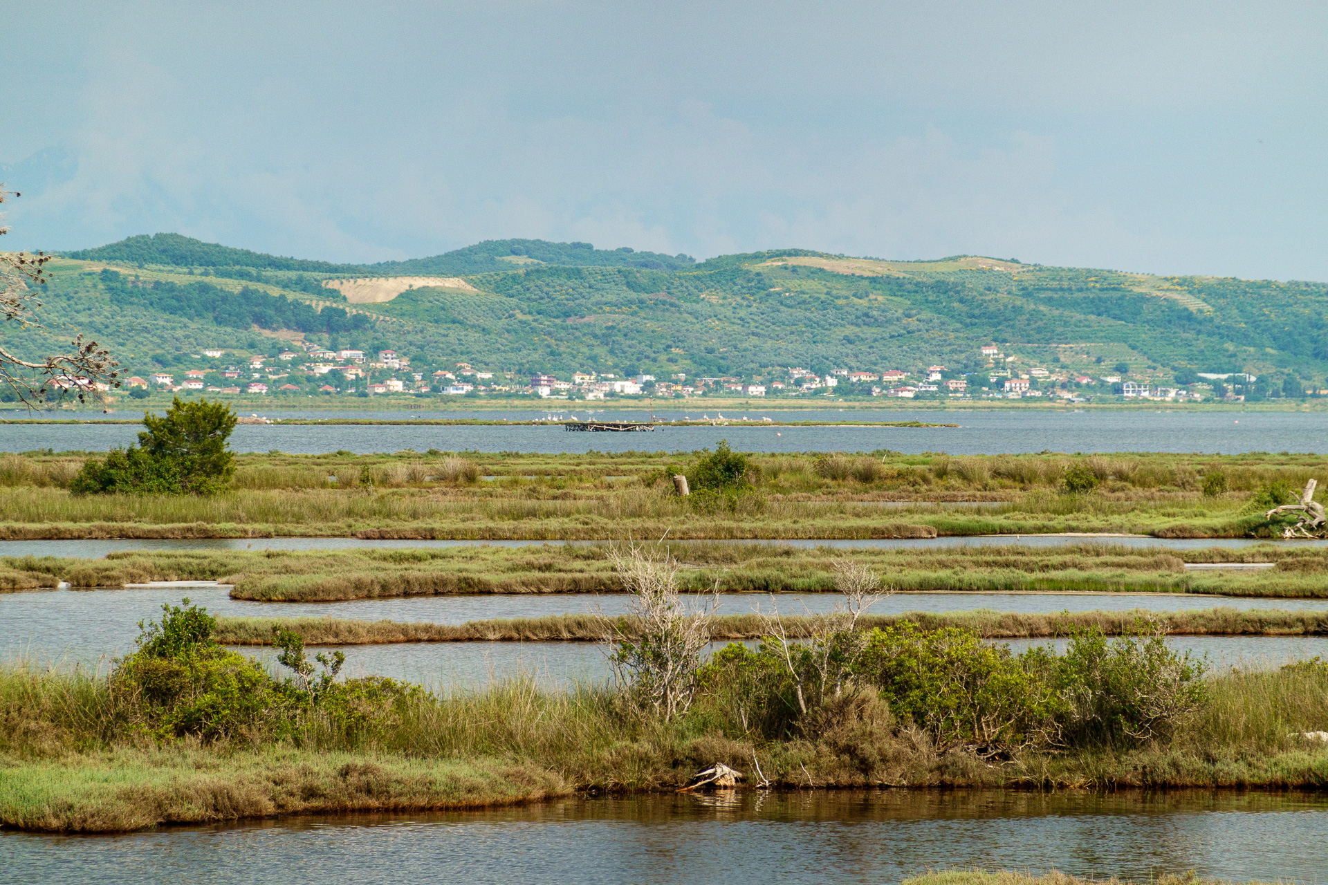 Et sur les pelicans frisés car la lagune est célèbre pour les rares pélicans frisés qui y vivent : en fait 6,4% de la population européenne de ces pélicans se trouvent ici. Ils construisent des nids dans la seule île de Pélicans de cette lagune. On aperçoit l’ile tout au fond. La promenade en bateau se limitant aux canaux, nous ne pourrons voir les pélicans que de loin, de très loin 🤪 !