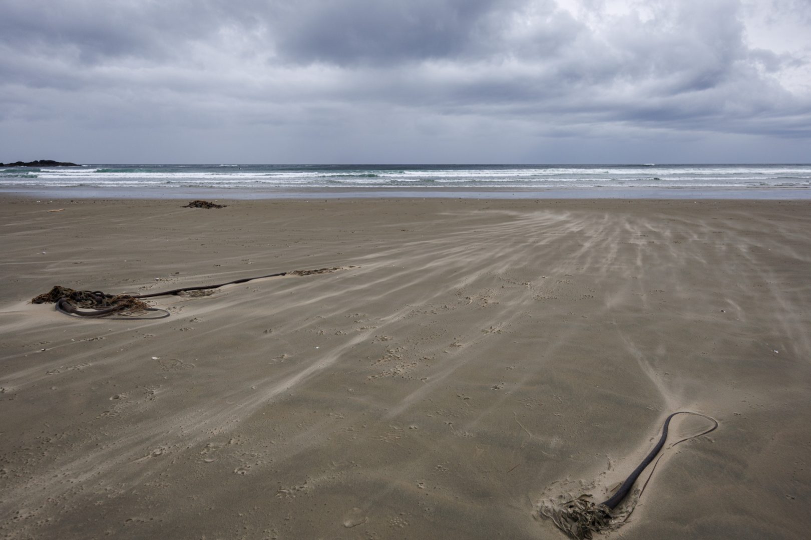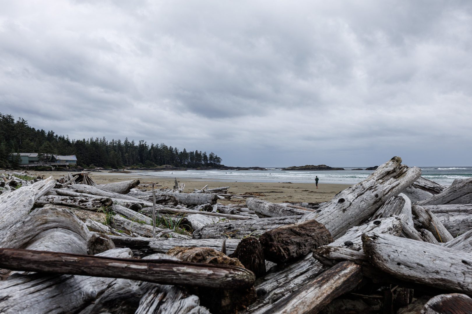 Le parc national Pacific Rim est reputé pour ses kilomètres de plages sablonneuses et ses forêts pluviales tempérées. Ses plages sont, parait-il, les plus belles du monde 🤩 ! Nous ferons un premier arrêt le long de la plage de Wickaninnish. Nous pénétrons sur la plage par un couloir en bois flotté.