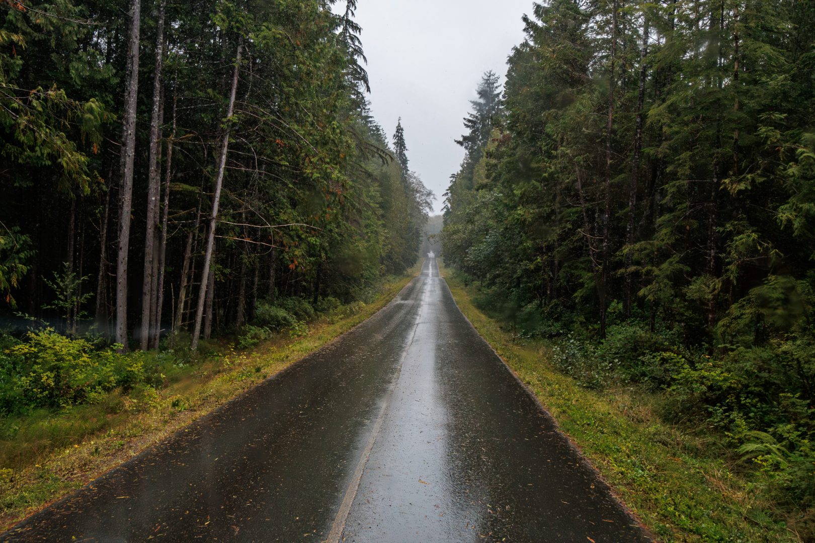 215707 km : C’est sous la grisaille que nous prenons la route en direction du parc national de Pacific Rim.