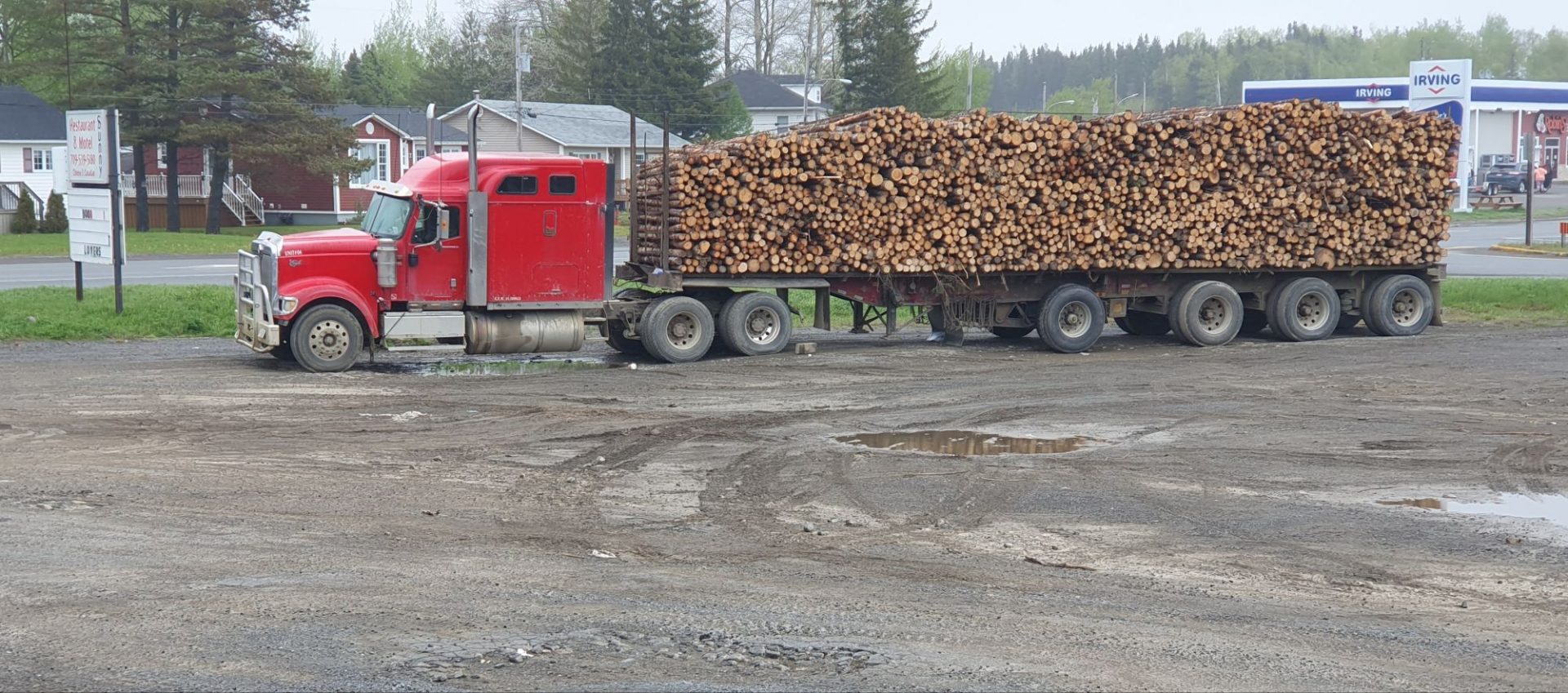 Lors de la pause-déjeuner, nous nous installons à côté de ce camion de bois. On y retrouve tous les attributs des camions canadiens : grande longueur, grande cabine pour le chauffeur, pare-buffle, et beaucoup de roues. Le tout roule à 100 km/h et nous laisse sur place même dans les montées… 😯