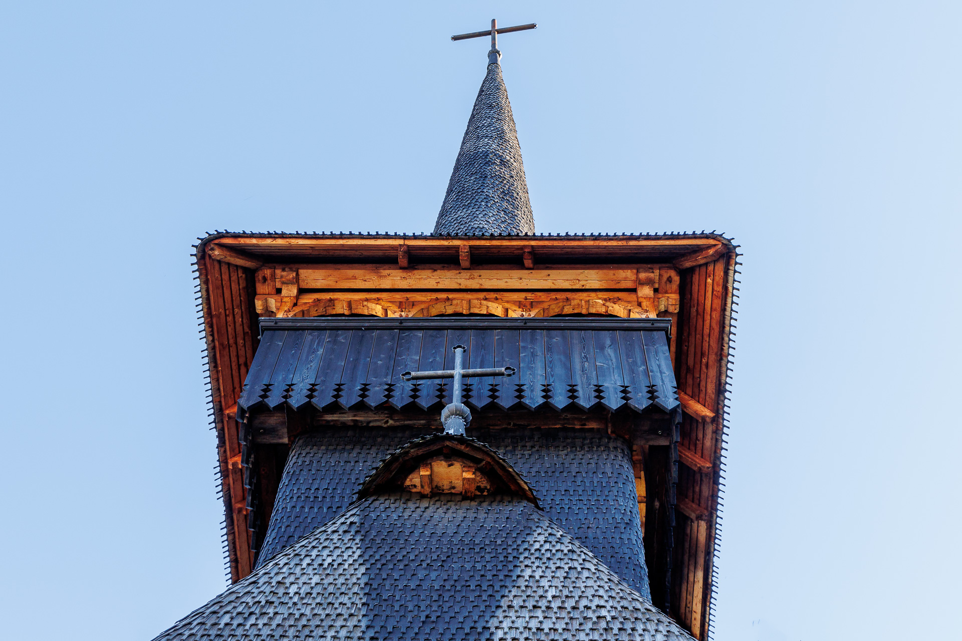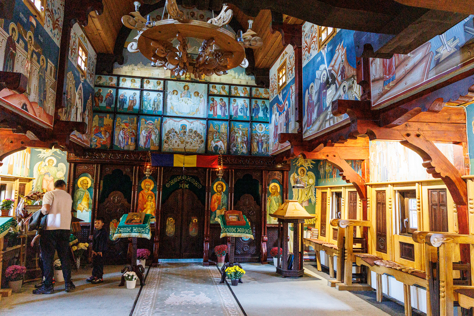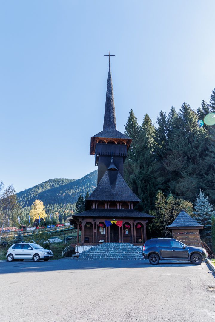 168677 km : En quittant notre bivouac, nous irons visiter l’église en bois Saint Ioan Botezātorul de Poiana Brasov. Elle a été construite entre 1997 et 1999 dans le style maramureş (région de Roumanie riche en églises en bois) avec le clocher au-dessus du porche, en forme de chapeau de sorcière.