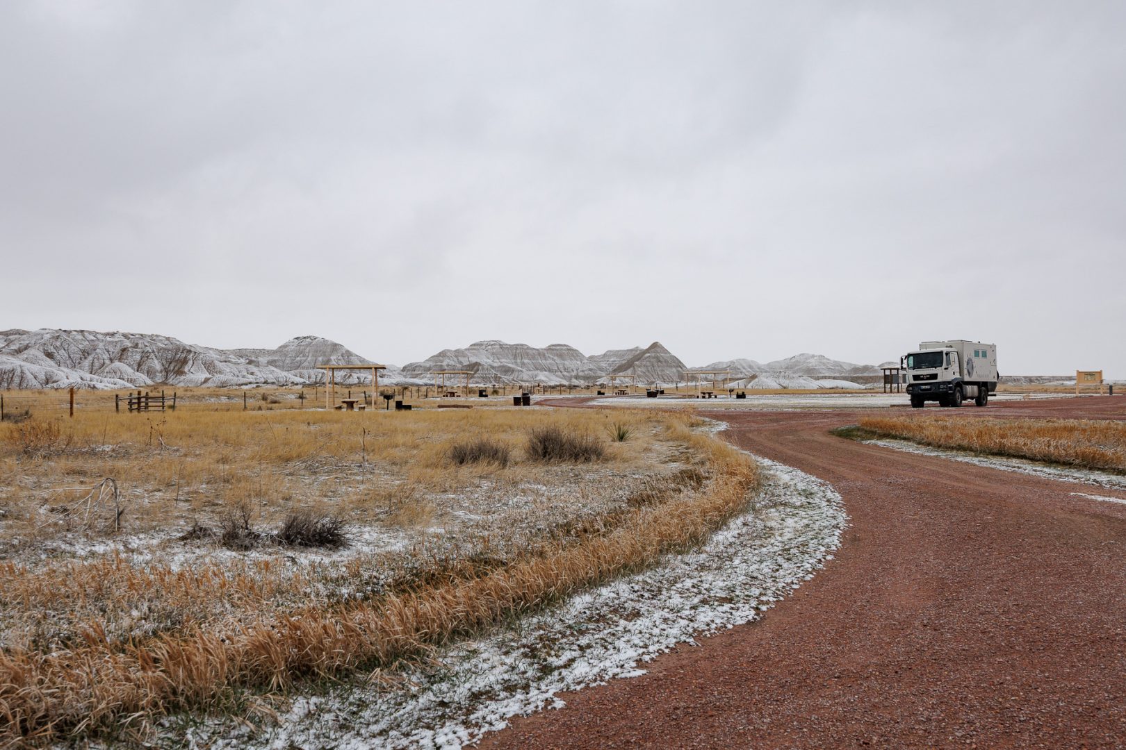 199154 km : Après une nuit bercée par le vent, nous nous réveillons dans un environnement saupoudré de neige. C’est beau 🤩 ! Mais il fait -5 degrés dehors et toujours ce vent fort. Au petit matin, il faisait 11 degrés dans le camion 🥶… heureusement que nous avons du chauffage !